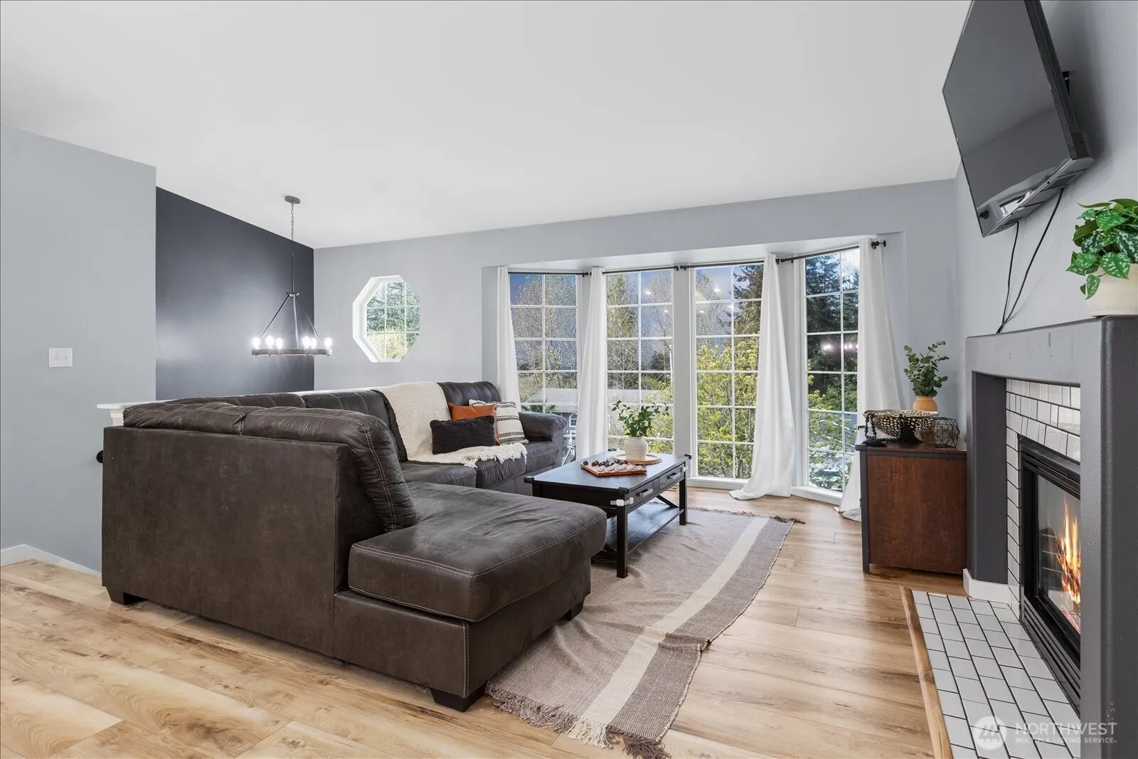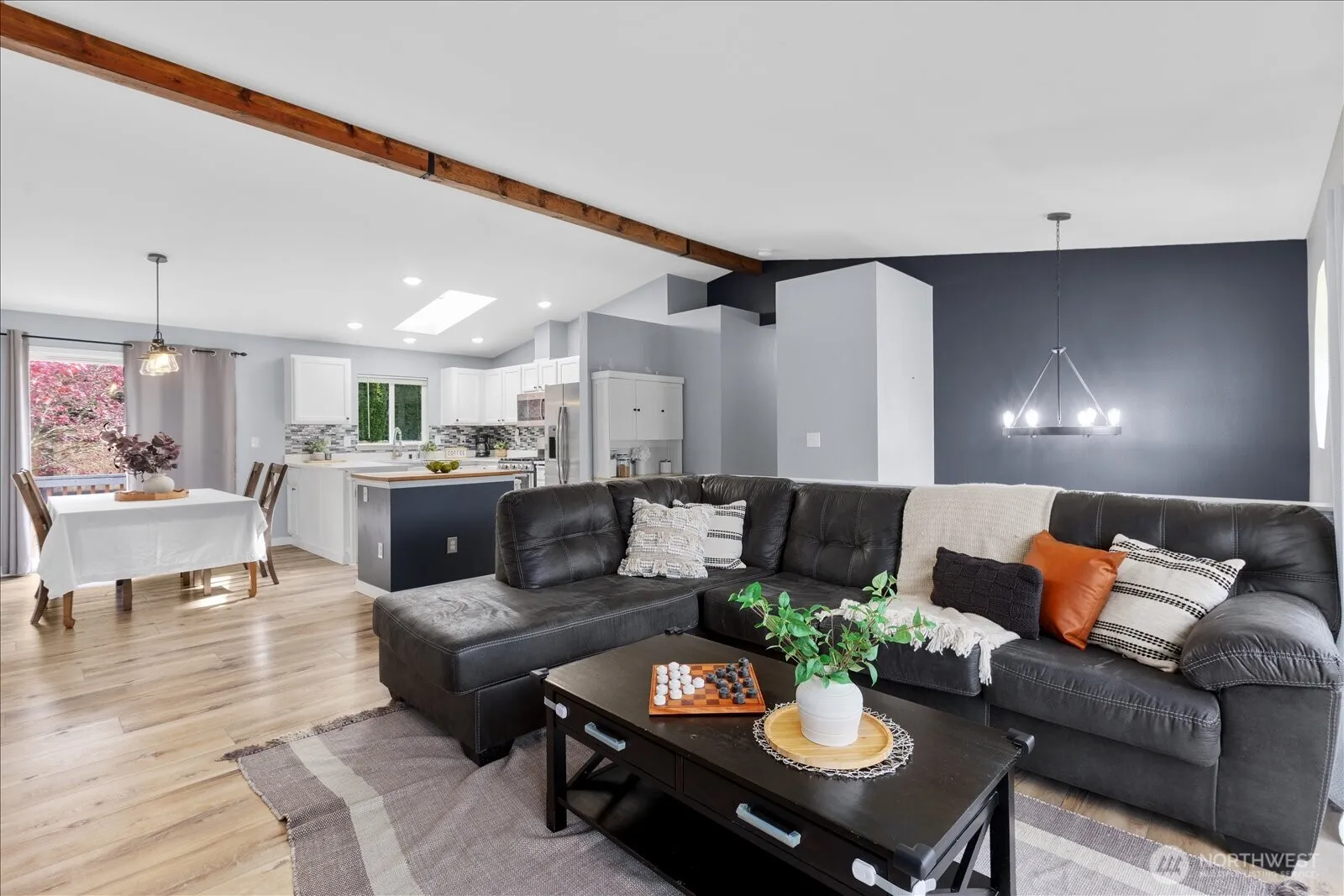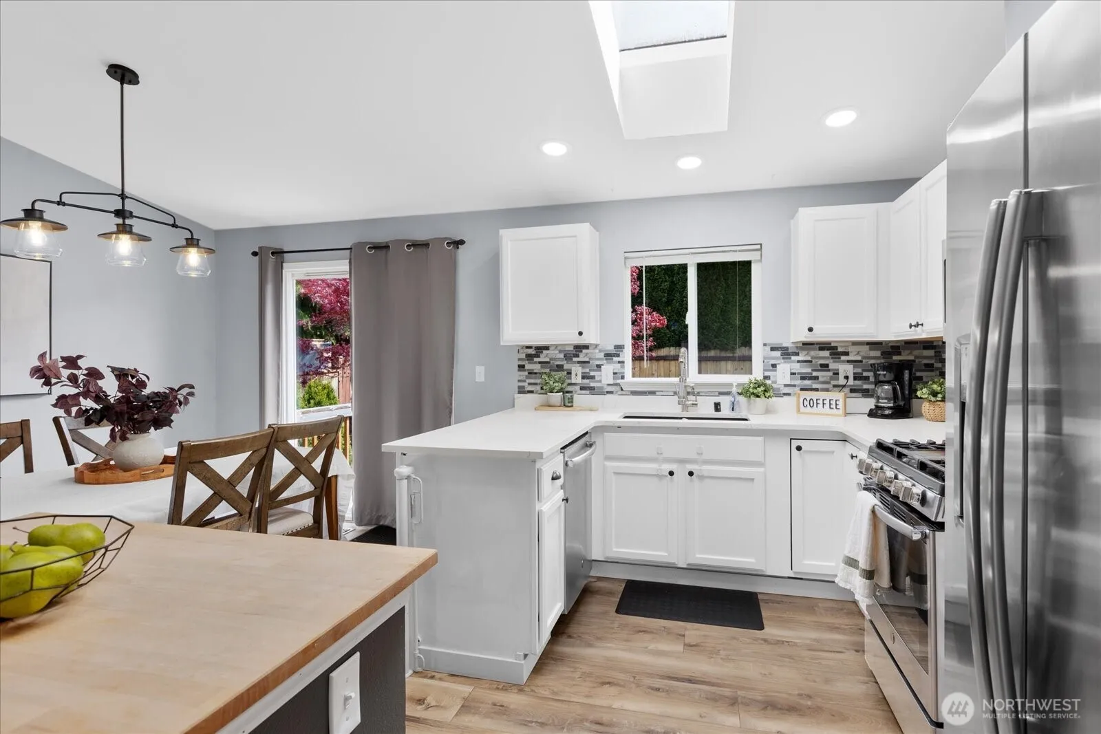 Fully refreshed and move-in ready, this beautifully updated 4-bedroom home with additional den and 2.75 baths blends comfort, function, and style. The remodeled kitchen features quartz slab counters, a butcher block island, and stainless steel appliances including a gas range—perfect for everyday living and entertaining. The vaulted living room offers a cozy gas fireplace and a sun-filled bay window fills this space with an endless supply of natural light. Upstairs you’ll find 3 bedrooms, including a spacious primary suite with full bath, plus a full 2nd bathroom. The lower level provides excellent flexibility with a second living area, fourth bedroom, and bonus room (possible office, den or bedroom), along with a ¾ bath and full laundry—ideal for guests or multi-generational living. Ample storage throughout and AC to enjoy on hot summer days! Enjoy outdoor living with a new Trex deck (2024), fully fenced backyard, and wraparound patio. Major updates include new flooring, paint, and baseboards (2022/23), new roof (April 2026), new bathroom paint and flooring (April 2026), new water heater (2024), and new windows in the downstairs bath and upper 2 bedrooms, plus French doors (2025). Extra-high 2-car garage with lofted storage area or shop will be appreciated by car enthusiasts and hobbyists. Located in the highly desirable Lake Stevens School district, on a low-traffic road, conveniently near shopping, dining and everyday amenities.
