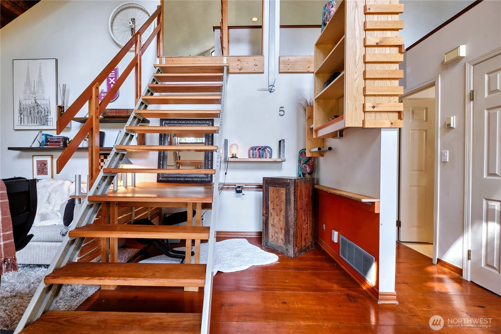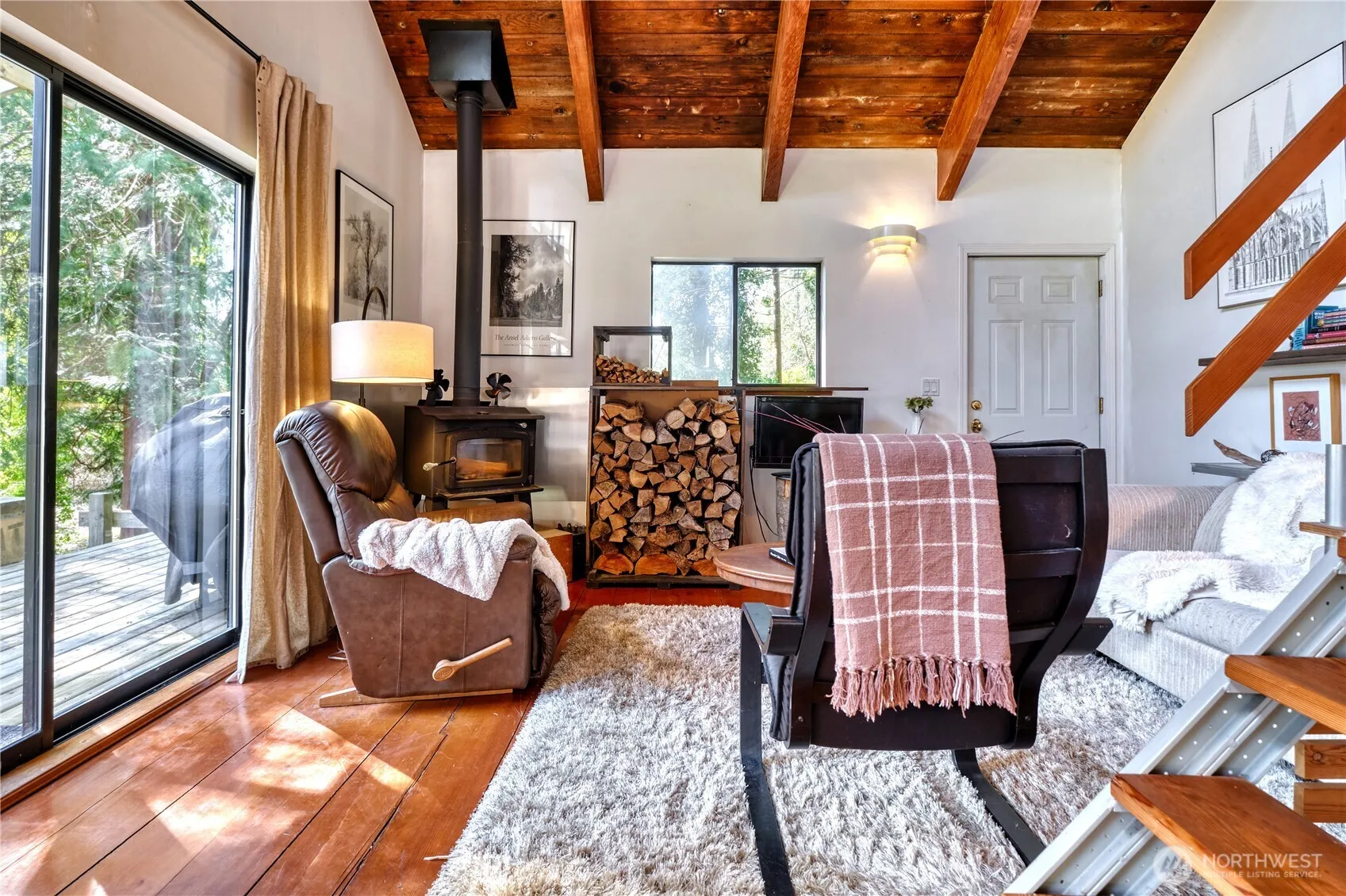 Nestled in the oceanside community of Point Roberts, this Pacific Northwest retreat offers peaceful coastal living just 10 minutes from Tsawwassen, BC. Built for full-time living, this 2 bed + loft A-frame is set among evergreens with beautiful southern exposure. With 1,216 sq ft of living space, the home showcases classic Northwest character with vaulted ceilings, exposed beams, and tongue-and-groove wood ceilings. Solid wood plank floors—milled from trees on the property during original construction—add warmth, history, and craftsmanship to the main living area. The open living space is bright and inviting, with large windows that bring in natural light and frame serene treed outlooks. The loft overlooks the main area and offers flexible space for guests, a home office, or cozy retreat with treetop views. Expansive decks extend the living space outdoors, ideal for morning coffee, summer entertaining, or relaxing in the coastal air. A full unfinished basement with built-in workbench is set up as a workshop, offering storage or future potential to finish for additional space. Quality construction includes a concrete foundation, metal roof, cedar siding, double-pane windows, wood stove, and heat pump for year-round comfort. Ideally situated in this seaside enclave, the property offers a balance of tranquility and accessibility—approximately 45 minutes to Vancouver, BC and about two hours to Seattle.