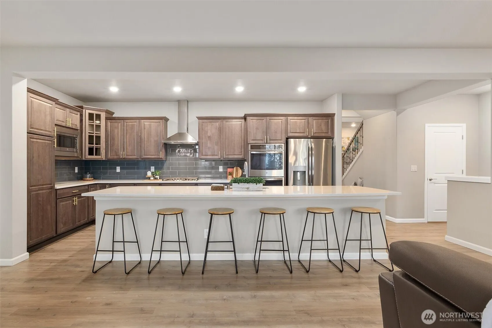 Covered front patio welcomes you to this spectacular 9-foot-ceiling SMART home. From the moment you step inside, the grand entryway & soaring ceilings set the tone, complemented by abundant natural light & stunning territorial & Olympic Mountain views. Just off the entry, the heart of the home awaits, impressive chef’s kitchen designed for both everyday living & entertaining. Featuring a large eating island w/seating for 6, 5-burner gas cooktop, double ovens, soft-close cabinetry w/upgraded hardware & a pantry w/slide-out drawers. Laminate flooring flows seamlessly through the open-concept living & dining areas, anchored by a cozy gas fireplace. Tall slider & oversized windows capture the views & flood the space w/light, while canned LED lighting & smart-home features enhance comfort & efficiency. Main-floor 1/2 bth completes the main level. Upstairs, you’ll find 3 generously sized bedrms, including 2 that share a Jack & Jill bathroom. Spacious owner’s suite offers a peaceful retreat w/luxurious 5-piece ensuite. Upstairs laundry room & furnace closet add everyday convenience. Fully finished basement continues the 9-foot ceilings & provides exceptional flexibility w/a large bonus room. Optional 5th bedroom & a ¾ bath. 5th bedroom currently has one wall unfinished, offering an opportunity for customization. Expansive patio is ideal for entertaining & covered area beneath deck has been roofed creating a private, year-round seating space. Central A/C & Northshore Schools!