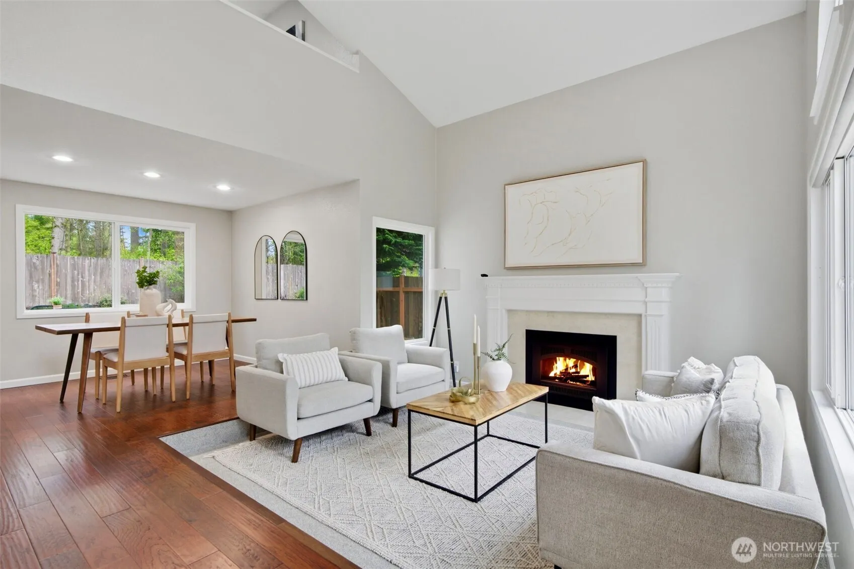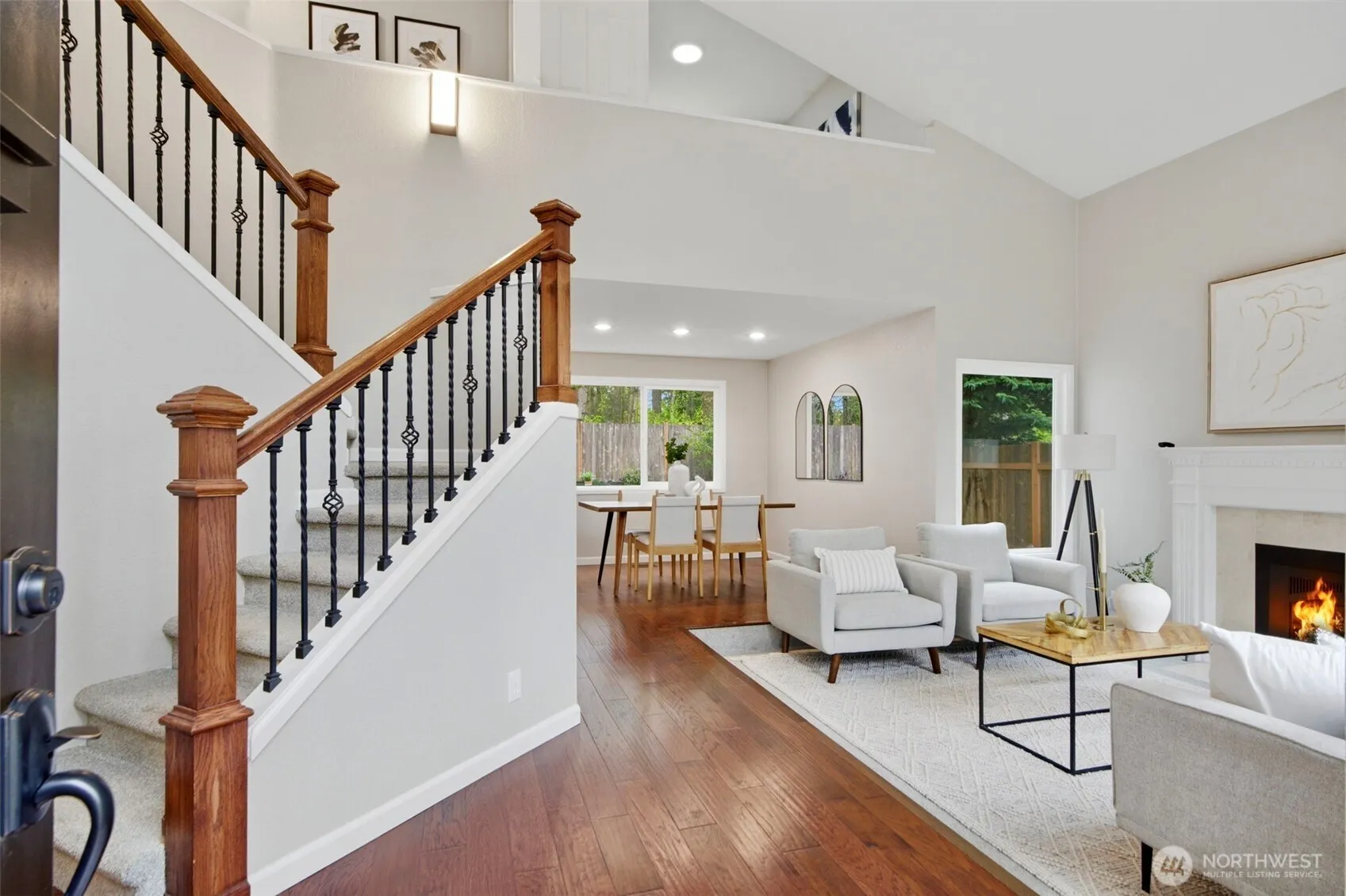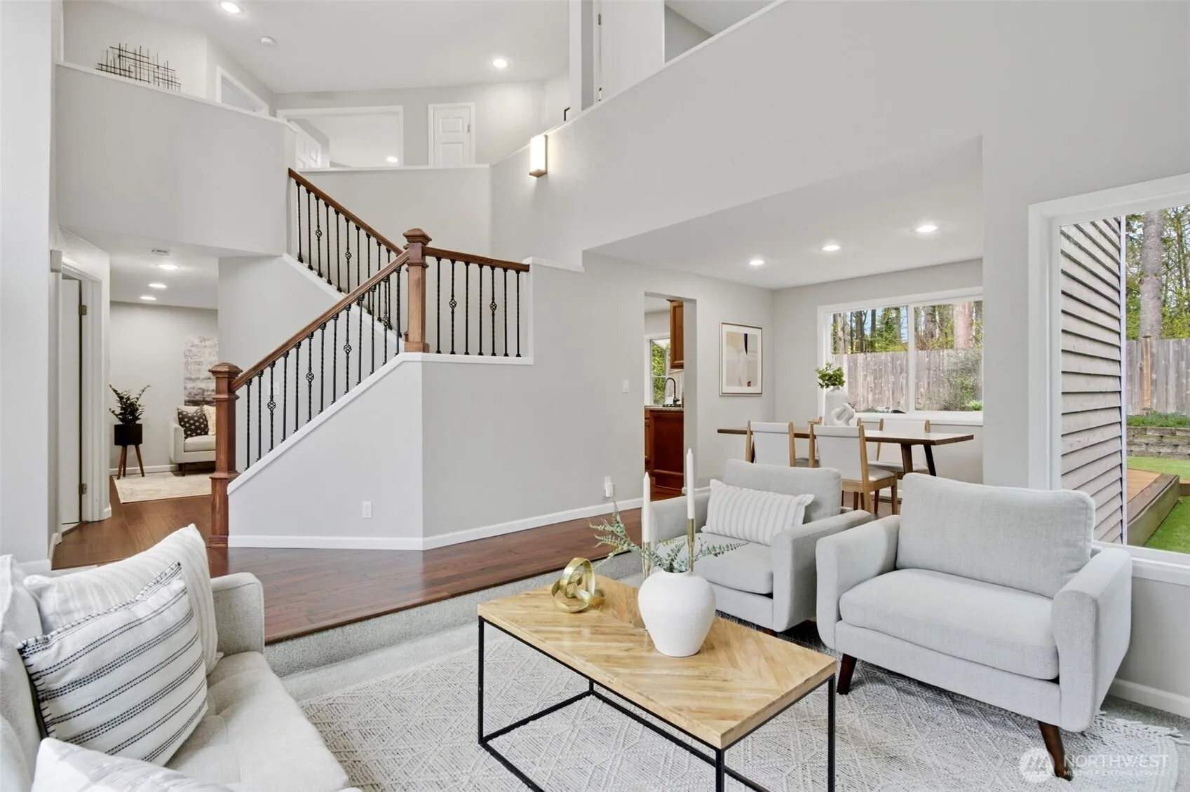 Beautifully updated 2-story home in a prime North Rose Hill location with sought-after southern exposure. Tucked at the quiet end of a cul-de-sac, this 3-bedroom, 2.25-bath plus den home offers 1,830 square feet on a 6,738 square feet lot backing to North Rose Hill Woodlands Park for exceptional privacy and a peaceful setting. The inviting interior features soaring cathedral ceilings, a sunken living room with fireplace, and formal dining. The spacious kitchen with eating area opens to the family room and sliding doors to a large Trex deck, creating seamless flow for everyday living and entertaining. Vaulted ceilings enhance the airy feel, while stainless steel appliances, ceramic tile baths, and heated floors in the primary bath add comfort and style. All bedrooms and den connect well to main living areas. The fully fenced backyard offers low-maintenance artificial turf, storage shed, and space to relax or play. The oversized 2-car garage is finished and insulated for year-round comfort with overhead storage and durable epoxy resin floors. Recent upgrades include a new energy-efficient furnace (2024), water heater (2023) and updated energy-efficient windows. Ideally located next to North Rose Hill Woodlands Park with trails, boardwalks and playground. Minutes to Mark Twain Elementary, Totem Lake, downtown Redmond, dining, shopping, Costco, freeway access, transit, and major tech campuses including Microsoft, Google, and Meta. Award-winning Lake Washington School District.