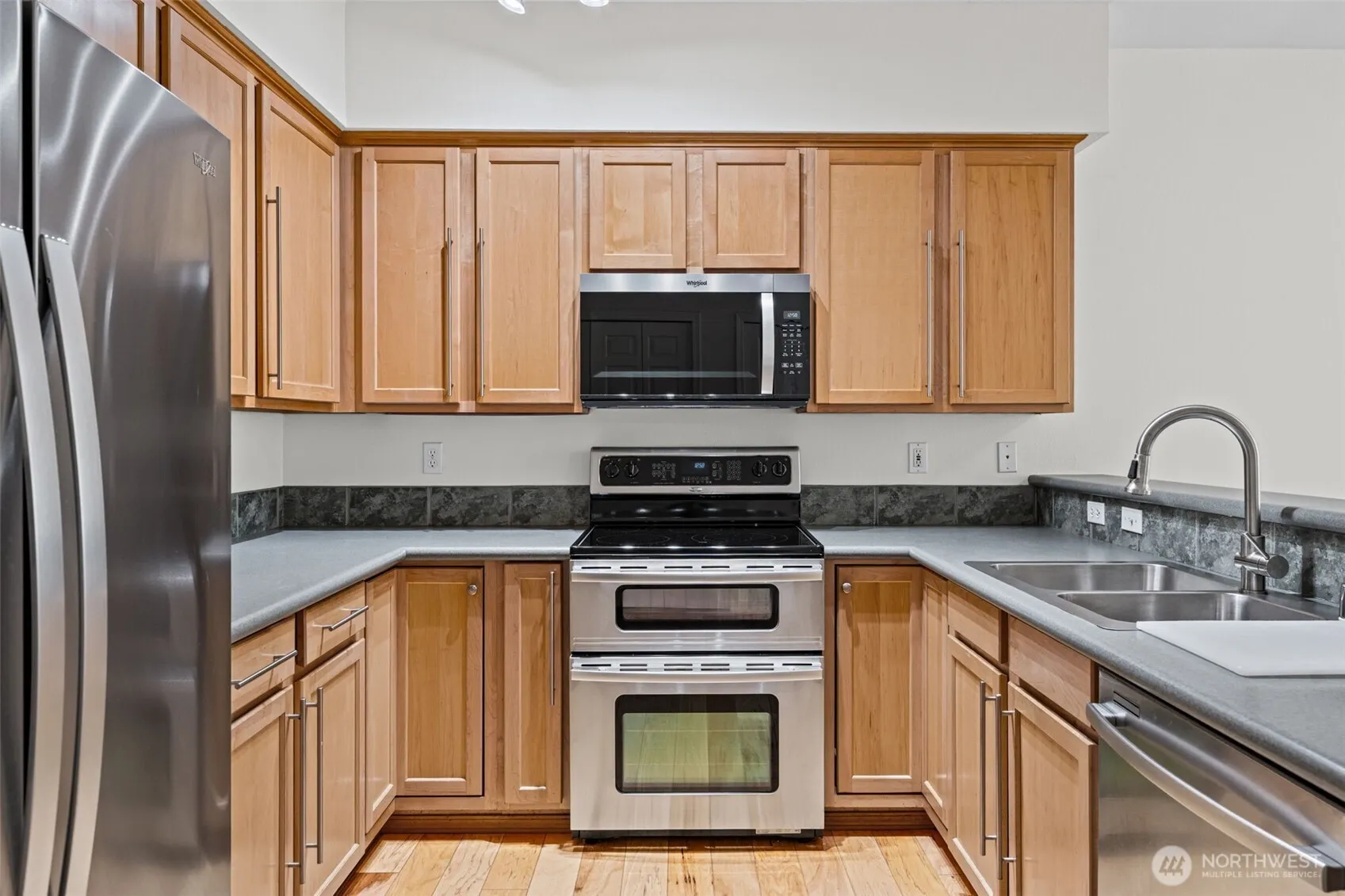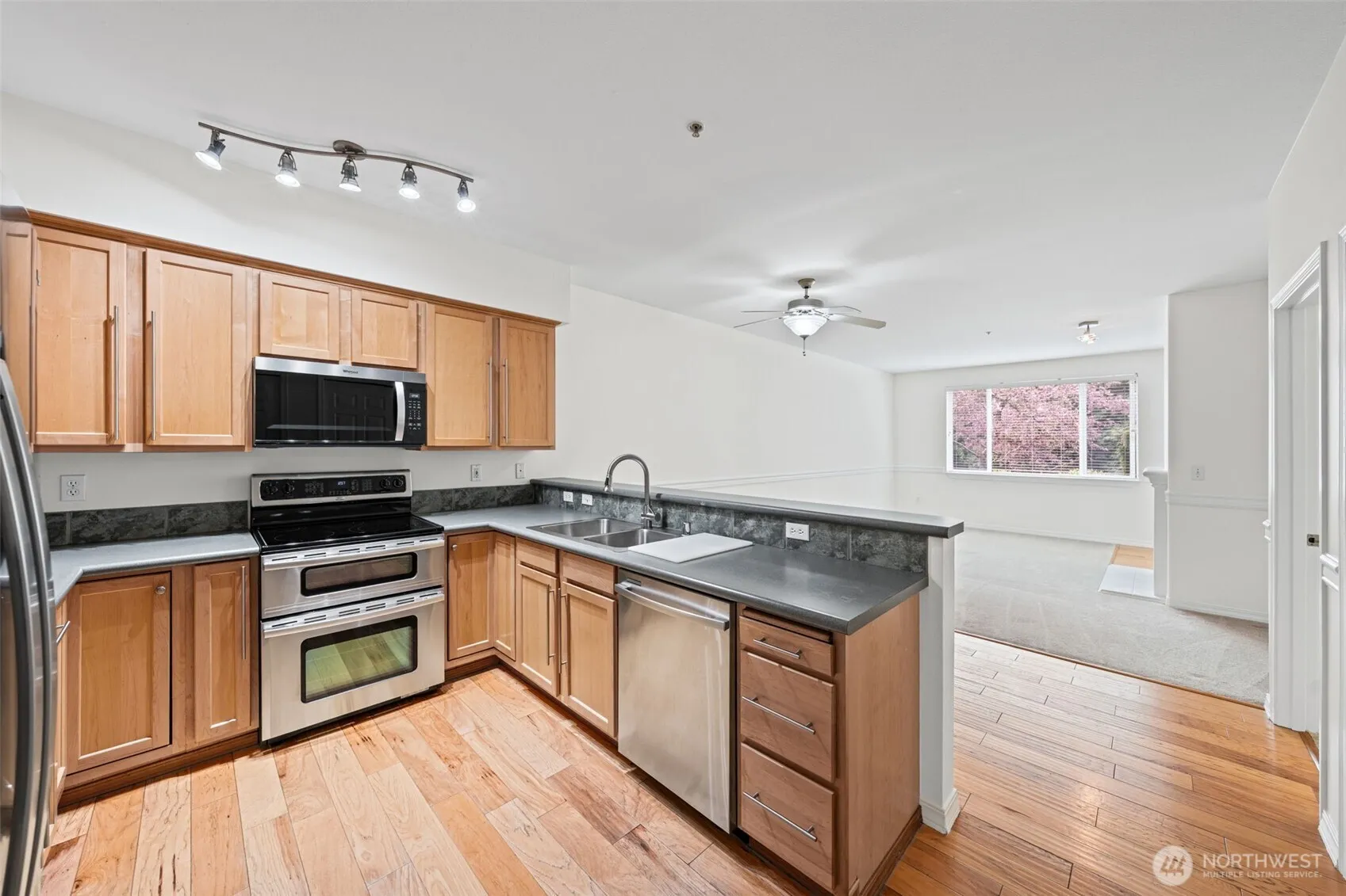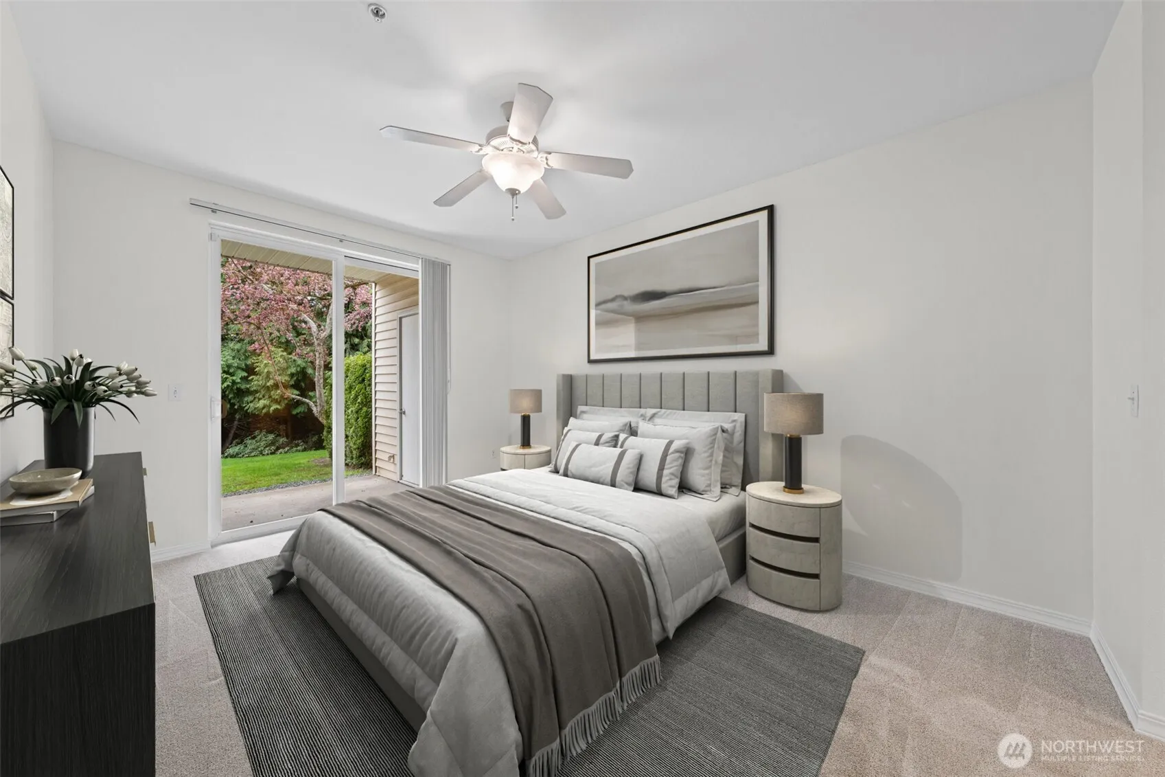 Welcome to Rivers Edge in Renton! This beautifully maintained main-floor condo offers 2 bedrooms and 2 bathrooms, combining comfort, convenience, and style in a secure, gated community with detached garage parking.Step inside to find spacious rooms with tall ceilings and an open-concept layout. The home features new carpet and wood flooring. The generous primary suite includes a private patio—perfect for relaxing. The home also boasts a completely renovated main-floor walk-in shower with beautiful tile, adding a modern and luxurious touch.The kitchen is open and inviting, complete with stainless steel appliances and bar/dining seating, making it ideal for both everyday living and entertaining.Additional highlights include in-unit laundry, extra storage, and direct patio access from the living room.The community has been thoughtfully updated with no pending assessments—recent improvements include new roofs on both residential and parking structures, fresh asphalt throughout the complex, and an upgraded gated entry system.Move-in ready and ideally located—welcome home.