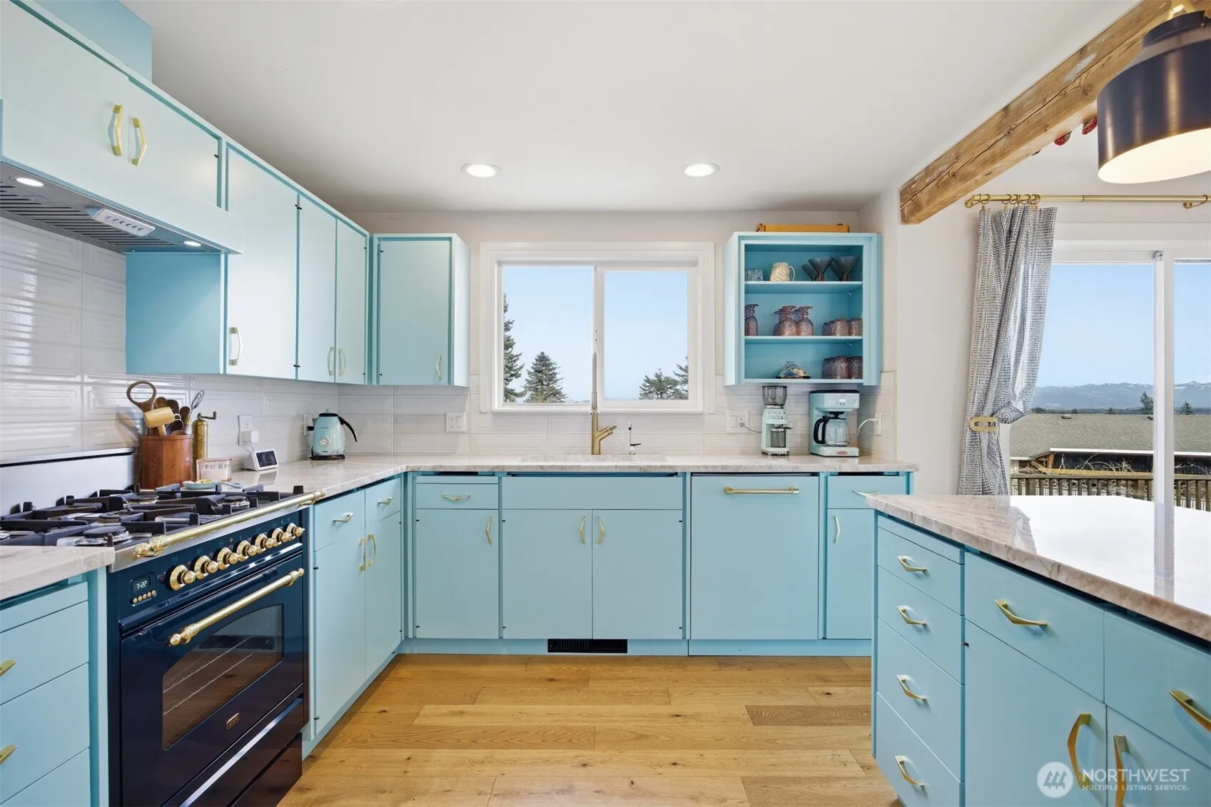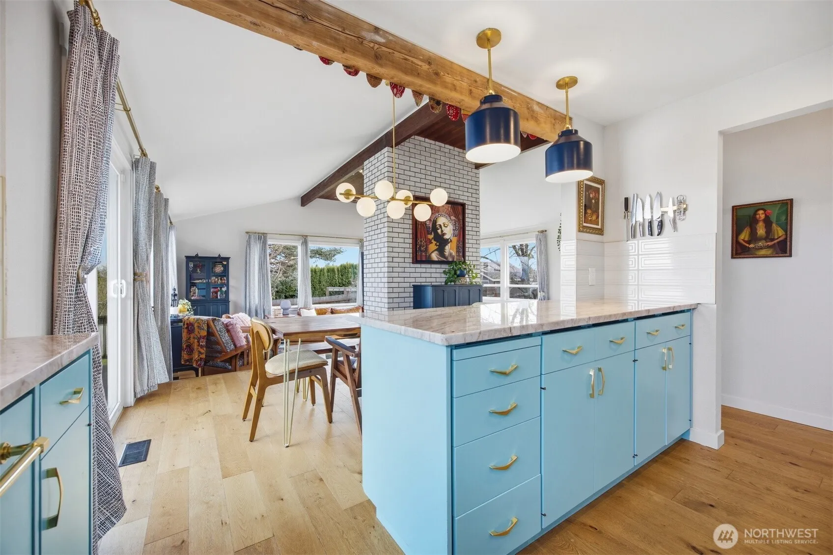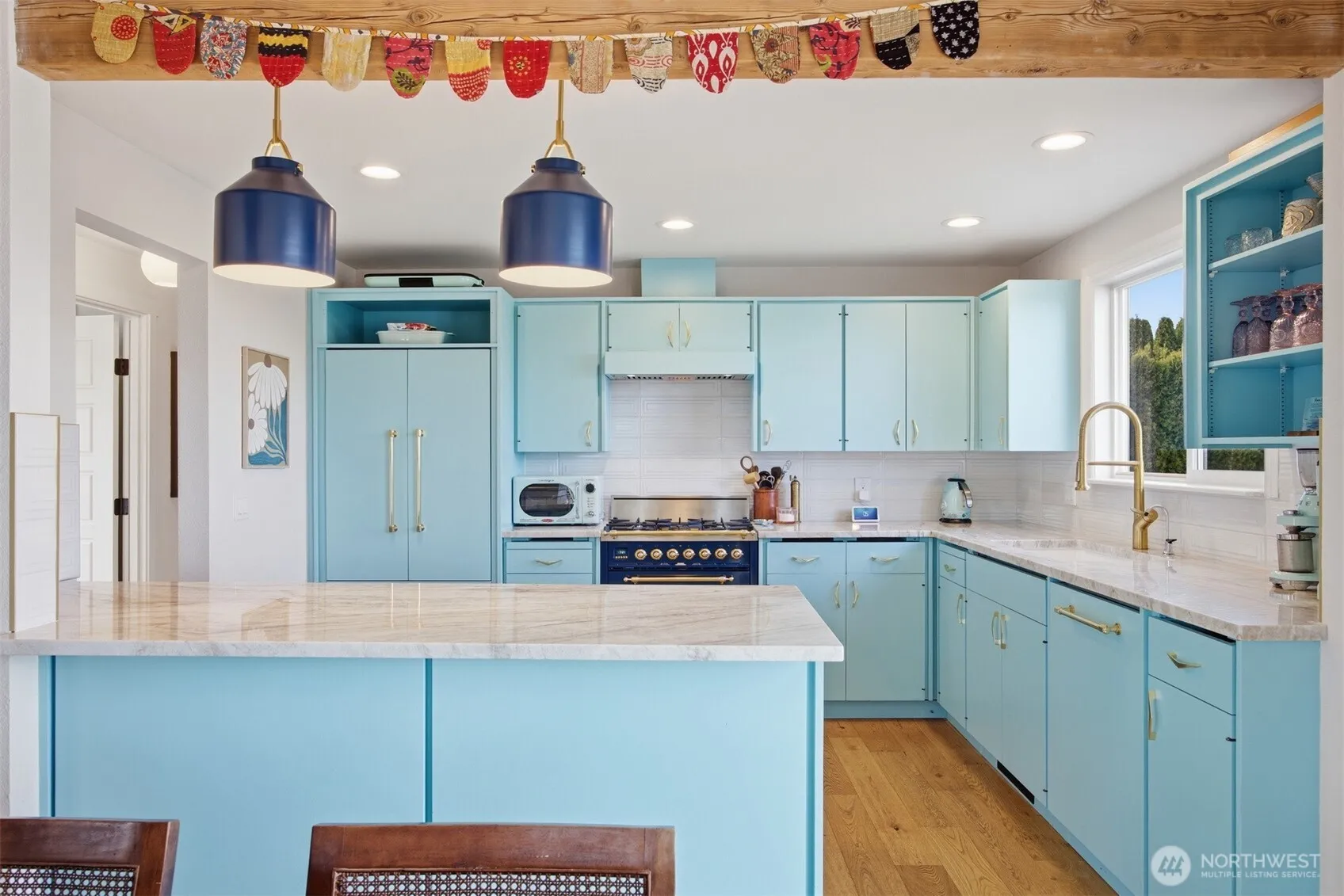 That charming single-level home you’ve been looking for has arrived, and it comes with an amazing view! Meticulously updated and garnished with impeccable style, this inviting 3-bed / 2-bath rambler is waiting for you on a large sunny lot offering VIP seats to exhilarating sunrises over Mt Baker. The kitchen is gorgeous, standing vibrantly against a market full of neutral palettes. It boasts high-end touches including Taj Mahal quartzite counters, a Majestic gas range, built-in fridge + dishwasher, and mountain views through the window. The layout allows for easy communion with both the dining and living rooms, with the latter boasting vaulted ceilings, big picture windows, and a cozy fireplace. Beautiful hardwood floors stretch throughout the home including all three bedrooms. The primary bedroom comes with a full en-suite bathroom which, along with the full guest bath, are beautifully designed and feature radiant heated tile floors. The backyard is a dream for play, hosting, or just relaxing. A concrete patio stretches the full width of the home, with room for dining, a fire pit, and hot tub with plenty of space remaining. From there, step down to a sprawling, fully-fenced back yard overlooking the verdant valley between you and the mountains. Additional updates include lighting + plumbing fixtures, new interior + exterior paint, A/C, cabinets + epoxy floors in the attached 2-car garage, and more. All this just minutes from parks, I-5, and downtown Ferndale.