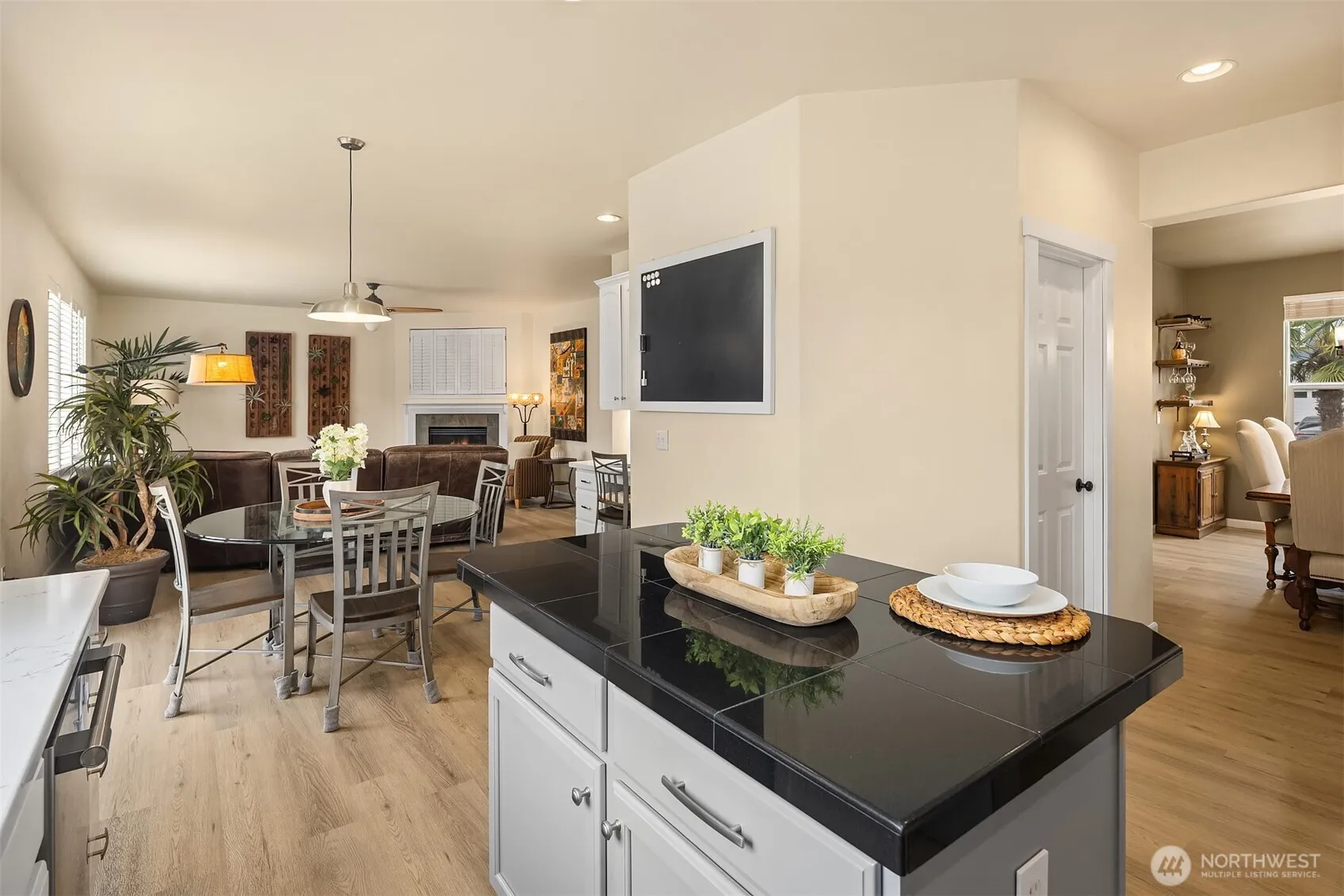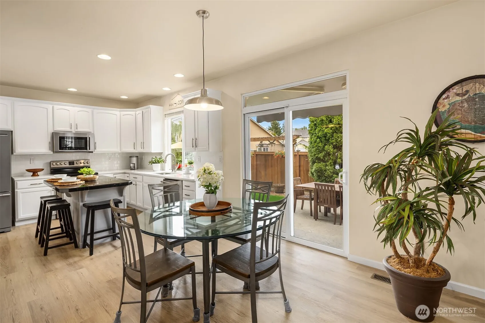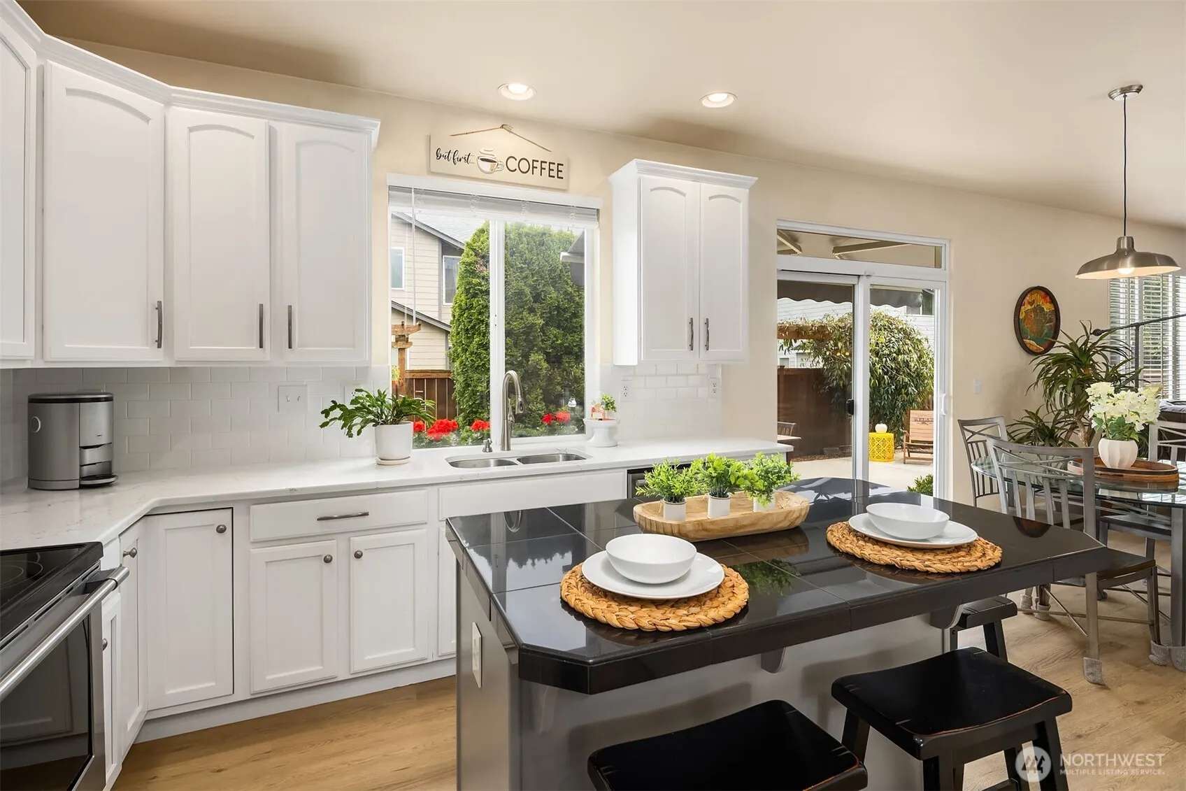 Meticulously maintained and lovingly cared for by its original owner, this home truly shines. The main floor features 9-foot ceilings, creating an open, light-filled living space. The kitchen offers ample cabinetry, quartz countertops, stainless steel appliances, a center island, built-in desk, and a sunny breakfast nook. It flows seamlessly into the inviting family room with a gas log fireplace—perfect for everyday living and entertaining. Step outside to an entertainment-sized patio with a retractable awning, ideal for year-round casual living. A main-floor den provides a perfect work-from-home space. New luxury vinyl plank flooring enhances the main living areas with both style and durability. The formal living room, complete with a gas log fireplace, and dining room are perfect for gatherings and more formal entertaining. Upstairs, the spacious primary suite features vaulted ceilings, a walk-in closet, Cali bamboo flooring, and a relaxing ensuite bath with a soaking tub and separate shower. Skylights bring in abundant natural light, and the generously sized bedrooms provide comfort and flexibility. The level, fully fenced yard is complemented by thoughtfully placed landscaping for added privacy. 9 ft X 9 ft shed designed to blend in with the house. New roof in 2023 and exterior newly painted with in the last 5 years. Located in the desirable Issaquah School District and near local parks. Outside the RTA car tab tax, offering potential savings.