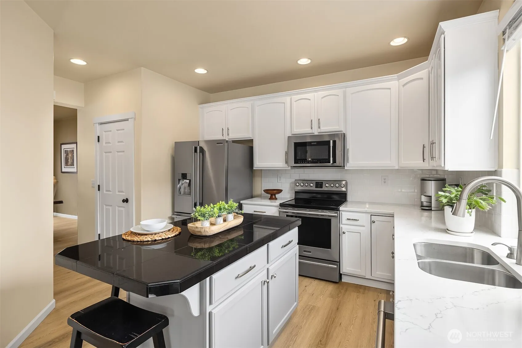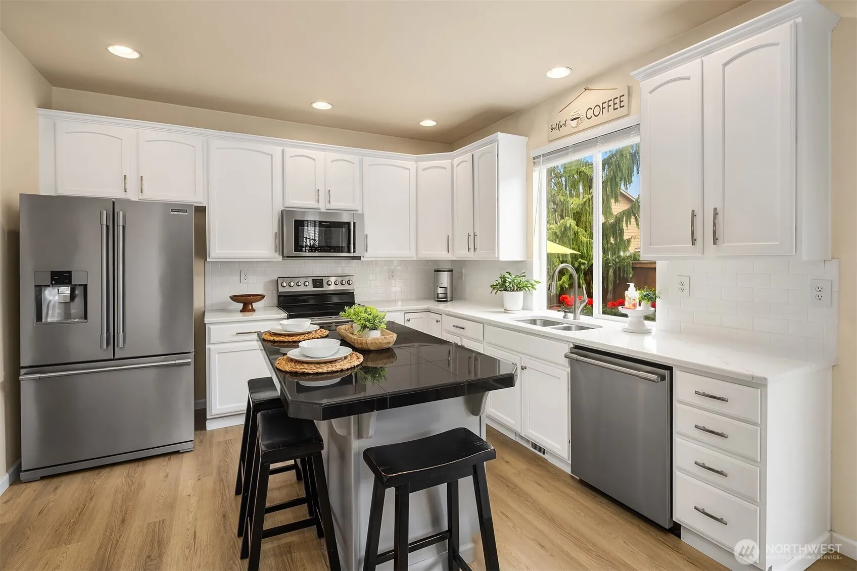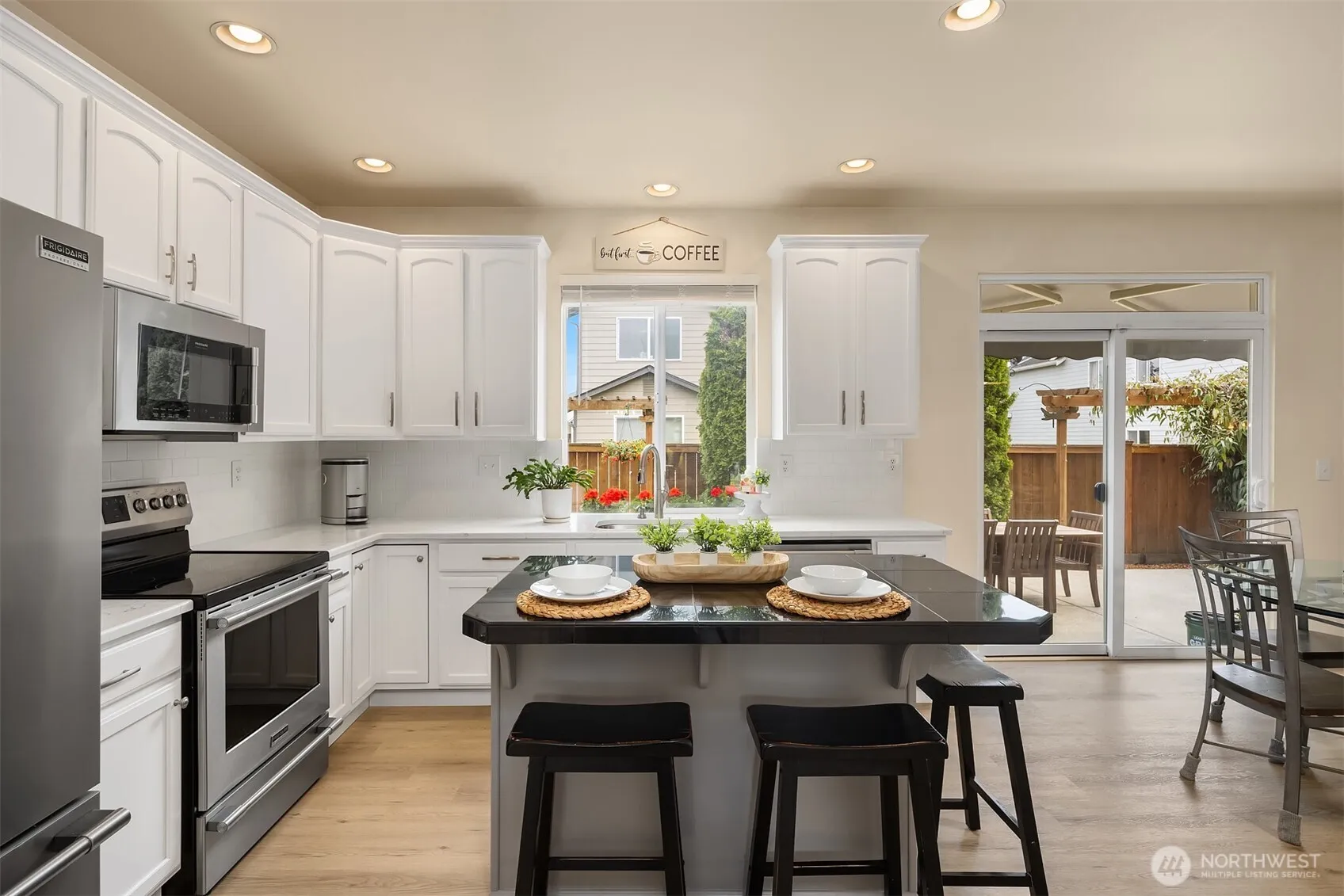 Meticulously maintained and lovingly cared for by its original owner, this home truly shines. The main floor features 9-foot ceilings, creating an open, light-filled living space. The kitchen offers ample cabinetry, quartz countertops, stainless steel appliances, a center island, built-in desk, and a sunny breakfast nook. It flows seamlessly into the inviting family room with a gas log fireplace—perfect for everyday living and entertaining. Step outside to an entertainment-sized patio with a retractable awning, ideal for year-round casual living. A main-floor den provides a perfect work-from-home space. New luxury vinyl plank flooring enhances the main living areas with both style and durability. The formal living room, complete with a gas log fireplace, and dining room are perfect for gatherings and more formal entertaining. Upstairs, the spacious primary suite features vaulted ceilings, a walk-in closet, Cali bamboo flooring, and a relaxing ensuite bath with a soaking tub and separate shower. Skylights bring in abundant natural light, and the generously sized bedrooms provide comfort and flexibility. The level, fully fenced yard is complemented by thoughtfully placed landscaping for added privacy. 9 ft X 9 ft shed designed to blend in with the house. New roof in 2023 and exterior newly painted with in the last 5 years. Located in the desirable Issaquah School District and near local parks. Outside the RTA car tab tax, offering potential savings.