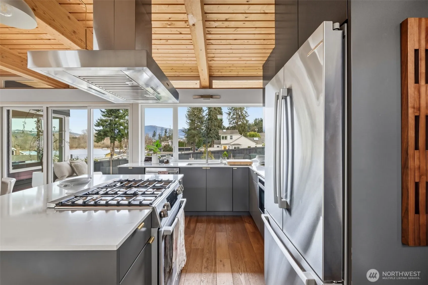 Welcome to Sammamish View Retreat, a serene, light-filled modern home overlooking Lake Sammamish with shared beach and moorage! Expansive picture windows and walls of glass capture breathtaking water and mountain views while filling the home with natural light year-round, creating a warm, uplifting atmosphere. Designed with a stunning great room layout, the home offers open, flowing living with clean lines, warm wood accents, and seamless indoor-outdoor connection. A large glass door opens to a covered view deck—perfect for enjoying morning sunrises, evening sunsets, and peaceful moments surrounded by nature. The thoughtfully designed layout lives larger than its footprint, with private bedroom spaces and additional living areas that open directly to beautifully landscaped outdoor settings. Multiple patios and a fire pit create inviting spaces to relax and unwind. Extensive, thoughtfully curated landscaping. This home truly lives like a retreat—offering the feel of a vacation getaway in every season. Enjoy summer days on the water with private beach access, moorage, paddleboarding, or simply taking in the views. In cooler months, the home remains cozy and connected to the outdoors, with radiant heat and abundant natural light throughout. High-end finishes include stone surfaces, custom tile, and a finished garage with heat/AC for flexible use. Ideally located just minutes to Issaquah, and an easy commute to Seattle, while still enjoying a quiet, nature-filled setting.
