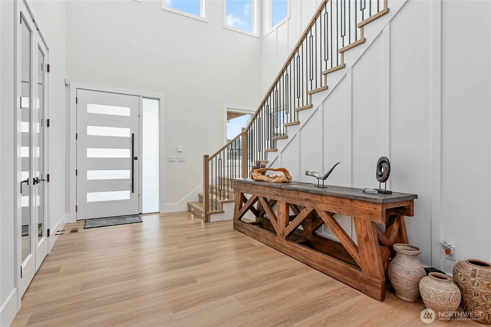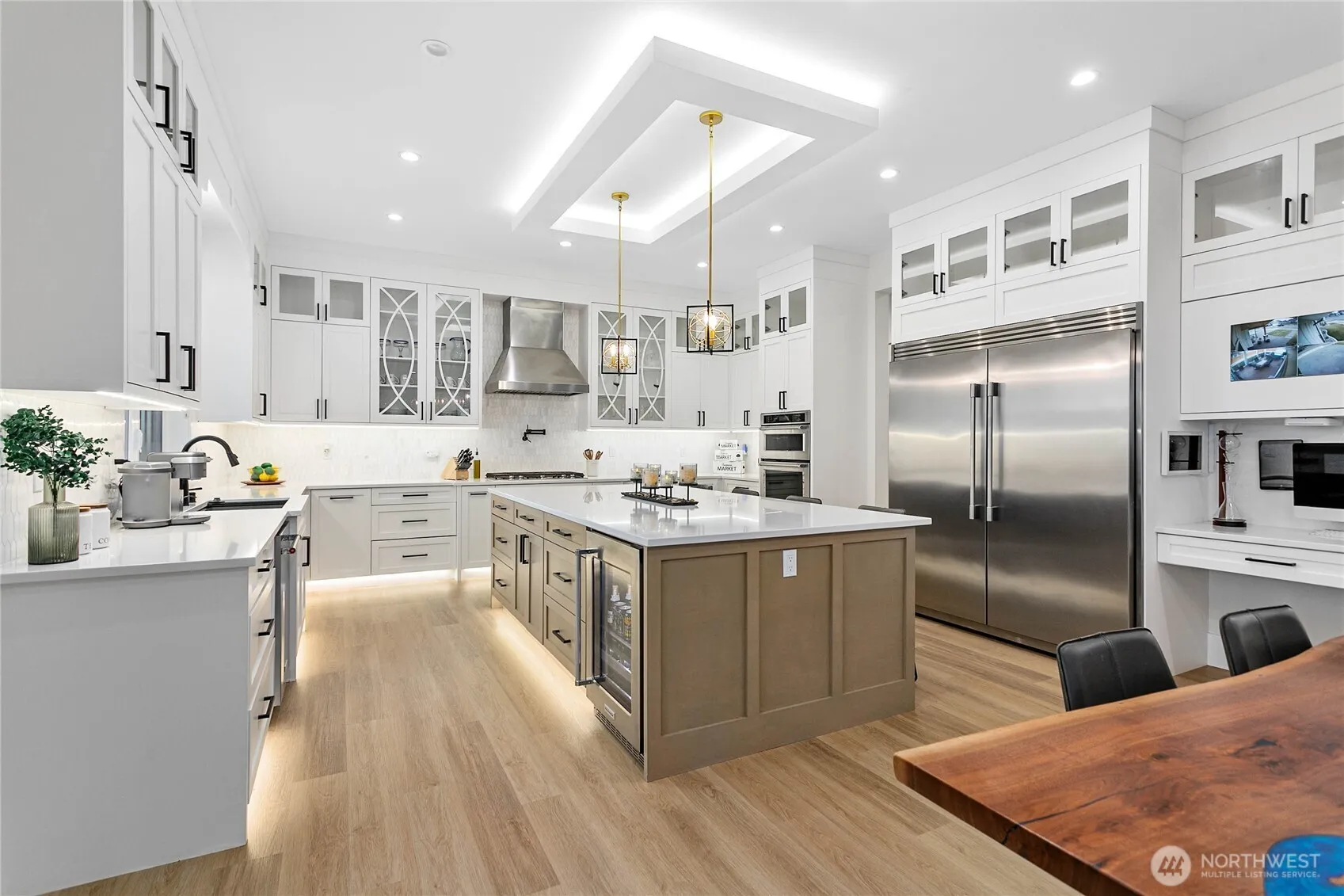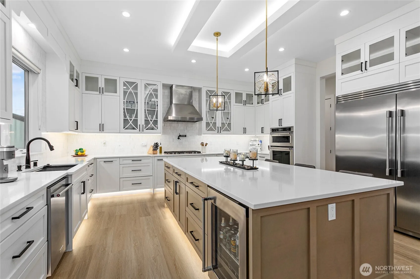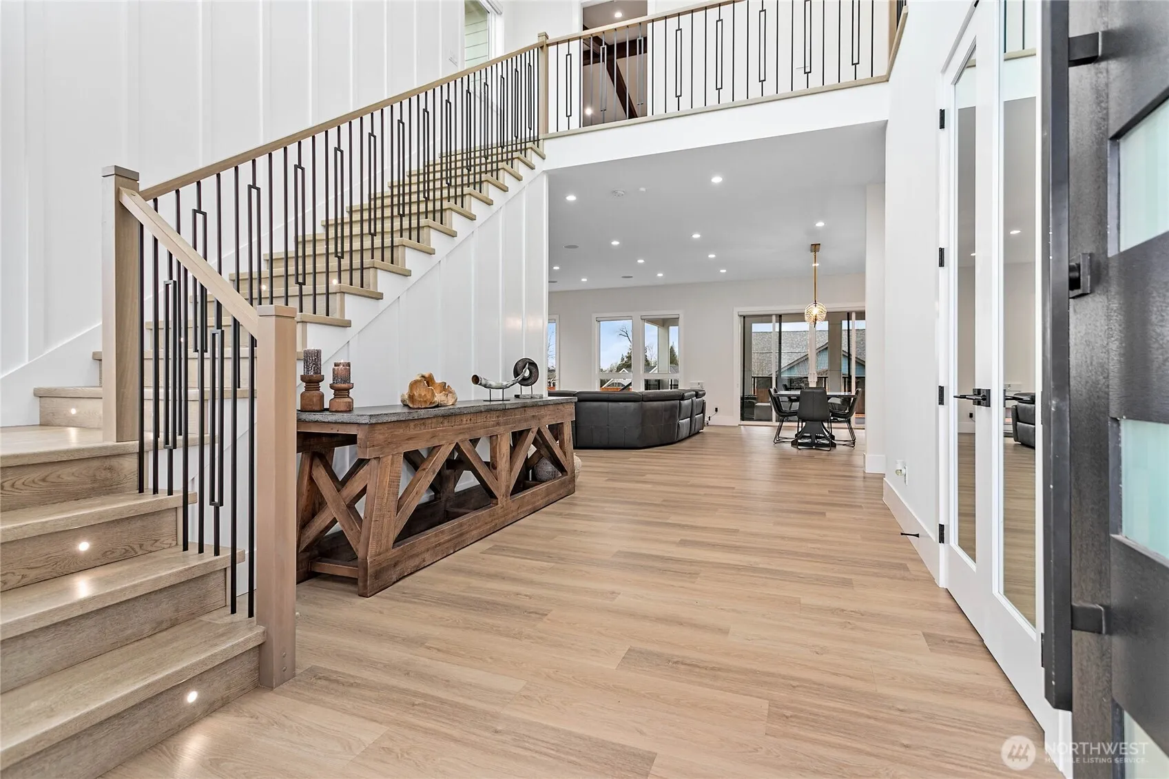 Elevated living in one of Ferndale’s most desirable neighborhoods, this like-new luxury home in The Meadows offers Bellingham Bay views, refined finishes, and a rare dual primary suite design ideal for multi-generational living or hosting guests in style. Spanning 3,514 sq ft, this 4-bedroom, 3.5-bath home with a dedicated office blends thoughtful design with everyday functionality. The open-concept main level features soaring 10’ ceilings, expansive windows, and a statement fireplace, flowing seamlessly into a chef’s kitchen with a massive quartz island, double refrigerator, high-end appliances, and extensive cabinetry storage. LVP flooring runs throughout, creating a cohesive and low-maintenance living space. A true standout, TWO spacious primary suites each offer larger walk-in closets and spa-inspired en-suites with tile showers and soaking tubs. One suite opens to a private deck with sweeping bay views, while both upper and lower decks are equipped with natural gas stubs and power, perfect for outdoor entertaining year-round. Additional highlights include A/C, a security system, fully fenced, beautifully landscaped grounds with a putting green, a huge storage shed, and a 3-car garage with epoxy floors, lots of storage, and EV charging. Lots of community walking trails are just steps from your door. Located just minutes to I-5, Ferndale schools, and Bellingham, this home delivers a rare combination of luxury, flexibility, and location in the Whatcom County market.