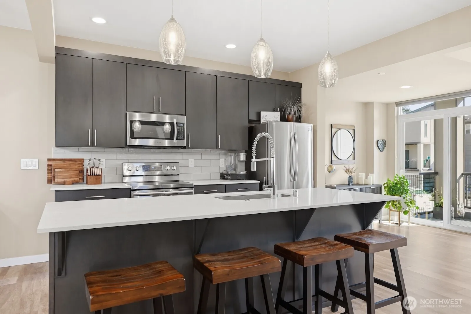 Like-new in Lynnwood! Welcome to Andoria, the park-like location you’ve been searching for, only moments away from all the amenities of both Lynnwood & Mill Creek! This standalone home has all the benefits of single-family living without the yard maintenance! An open concept main level is light, bright & inviting, with abundant space for effortless day-to-day flow or hosting friend groups of any size. Luxe vinyl plank flooring sparkles in warm sunlight pouring in through floor-to-ceiling windows & a centerpiece fireplace creates cozy ambiance. Pull up a seat at the roomy island to watch the chef at work in the beautifully appointed kitchen, equipped w/ stainless steel appliances, quartz counters, tile backsplash & abundant storage in sleek custom cabinets. All 3 bedrooms are upstairs, including an impressively spacious primary suite complete w/ vaulted ceilings, a walk-in closet & an ensuite bath. Mini-splits provide efficient heat & A/C for year-round comfort. Extra-deep 2-car garage + 2 addl covered driveway spaces. Low-maintenance HOA w/ friendly neighbors, a playground, 20+ guest parking spaces, & landscaping done for you. Easy access to bus lines, freeways, light rail & park-n-ride for a low-stress commute in any direction. Shopping, dining, groceries, beloved Martha Lake Park & all the amenities of Alderwood & Mill Creek are at your doorstep. Lynnwood is blossoming into Snohomish County’s destination for culture & connection; turn the key, move in & become a part of it!