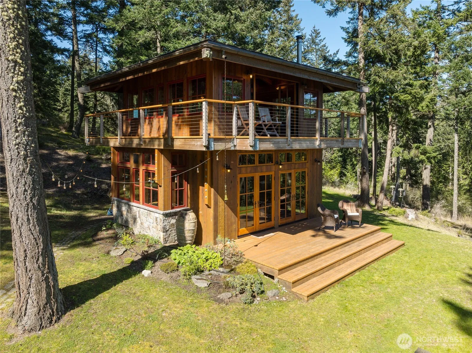 This one-of-a-kind timber frame home rises above the treetops like a modern forest lookout, offering rare privacy, all-day sun, and a setting defined by natural beauty. Reclaimed beams, history-rich fir floors, soapstone counters, and hand-crafted stonework create a quiet sense of luxury rooted in authenticity and craftsmanship. Wraparound windows and a dramatic opening glass wall erase the boundary between indoors and out, framing sweeping views of Rosario Strait and Lopez Island. The second-floor primary suite feels like a private hideaway, with windows in every direction and a partially covered wraparound deck perfect for sunlit mornings.A solar array powers the boiler that feeds the main-floor radiators and heated floor, while a European wood stove adds warmth and atmosphere, keeping the home comfortable year-round. Every detail reflects thoughtful design and enduring quality.The guest cabin is equally enchanting—a serene retreat with a cozy sleeping loft, window seat, wood stove, and a spa-like bath with custom finish work and clawfoot tub. Guests will never want to leave. Both dwellings include generous window seats that double as storage and additional sleeping space.Perched on a sunny south-facing hillside and bordered by 30 acres of shared forestland, the property feels profoundly secluded. Owners enjoy access to the Decatur Shores deep-water dock, private airstrip, and waterfront park, all just a quick 20-minute boat ride from Anacortes.