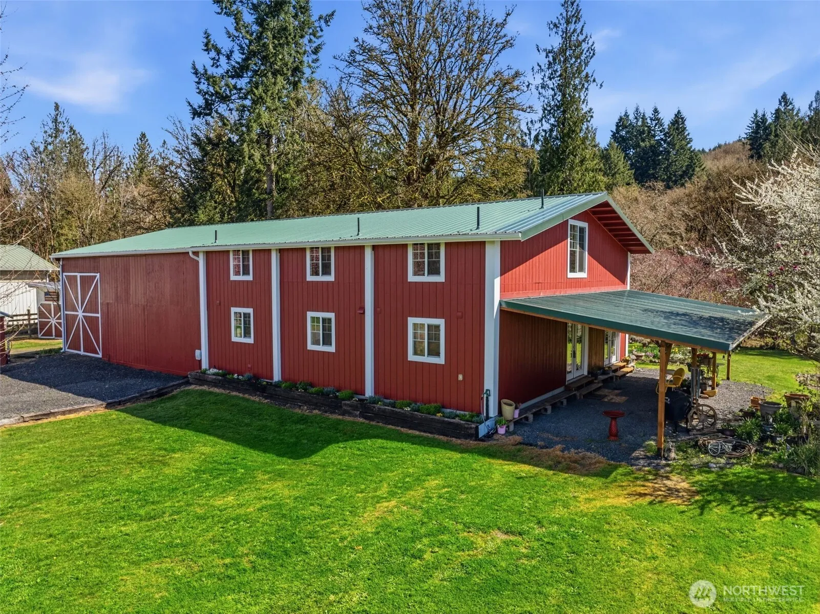 Live off the land with modern amenities in this gorgeous, spacious, thoughtfully planned & dreamy home in fashionable BARNDO-style! Enjoy 353 frontage feet of tranquil, serene Olequa Creek! Flat 5-acre plat with expansive greenhouse for seasonal & year-round gardening pleasure; 3 varieties of grapes – perfect table fare, bottle some wine, juice, or simply eat off the vine; healthy and reg orchard plus the luscious green pasture is well-maintained and ready for the livestock of your choice. Relish in the wildlife that visits this private paradise situated at the end of a private road. Garden space, flower beds, peaceful pavered areas dabbled about – read a book surrounded by nature, jump on your tractor and work your ground, nurture your plantings & then feast in homegrown bounty! HUGE 1296′ shop w/2592 sq ft of living quarters, 4 bedrooms, 2 spacious baths (one on each level) FLEX space that seems endless plus a true mudroom complete with half-bath that’s centrally located off shop/outside entrance. Gorgeous timbers grace the great room w/high ceilings, ultra efficient wood burning stove & wood floors. A dream of a kitchen appointed w/farm sink, granite tops, white cabinetry, beautiful tile backsplash & appliance suite. The pantry is purposefully GIANT! Don’t forget the shed & barn, 2nd greenhouse; fish, float or stroll the creek & relish the privacy & beauty of this amazing retreat w/light, protective CCRs, NO HOA; good-hearted, old-fashioned, simple valley life in Winlock.