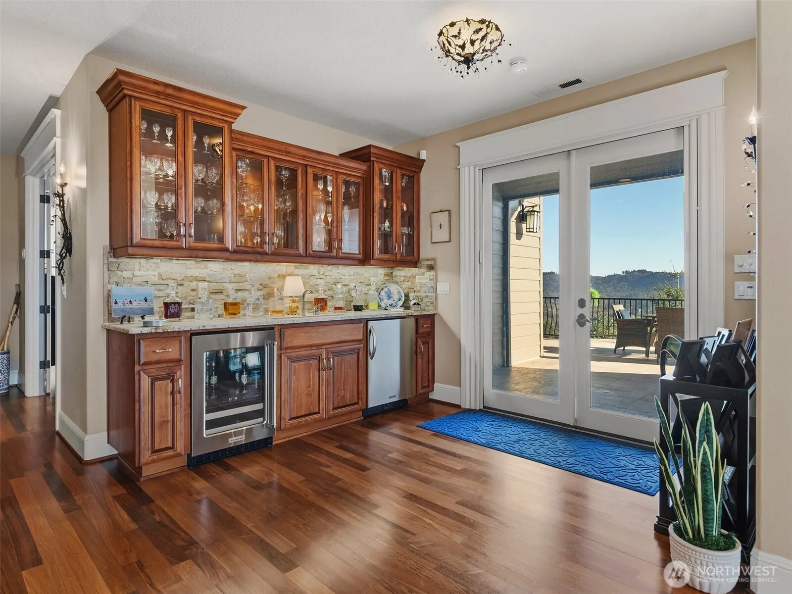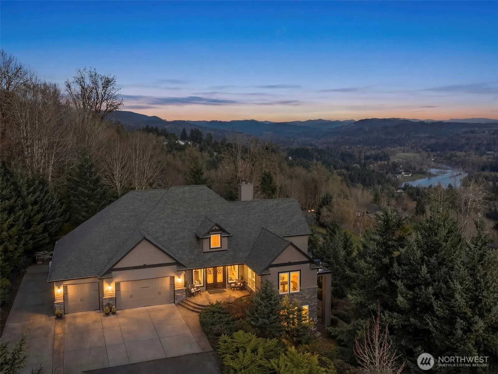 Perched to capture sweeping views from nearly every room, this stunning custom residence delivers an exceptional blend of craftsmanship, and serenity. A grand entry welcomes you with soaring ceilings and luxury hardwood floors that lead gracefully into an elegant formal dining area, perfectly sized for gatherings. The great room exudes warmth with a cozy gas fireplace wrapped in custom granite, crown molding, and beautifully integrated built-ins that elevate the space. The kitchen is a true showpiece, offering double dishwashers, built-in oven, six-burner range with an additional oven, expansive island, massive walk-in pantry, and a wet bar designed for entertaining. The bar features two beverage refrigerators, glass-front cabinetry for display, and sink that doubles as an ice well. The main-level primary suite is a private retreat, anchored by a double-sided fireplace and framed by breathtaking views. The ensuite invites relaxation with a large temperature-controlled jetted tub, spacious walk-in shower, and refined finishes throughout. The daylight basement is an entertainer’s dream, featuring a state-of-the-art home theater, family room, kitchenette, and 3 additional bedrooms and ensuites. Direct access to the lower patio creates seamless indoor-outdoor living. The property is equally impressive outdoors, offering RV parking with hookups, and a massive five-car garage. The panoramic vistas stretch across PDX, Lewis River, and mountains. A must-see!