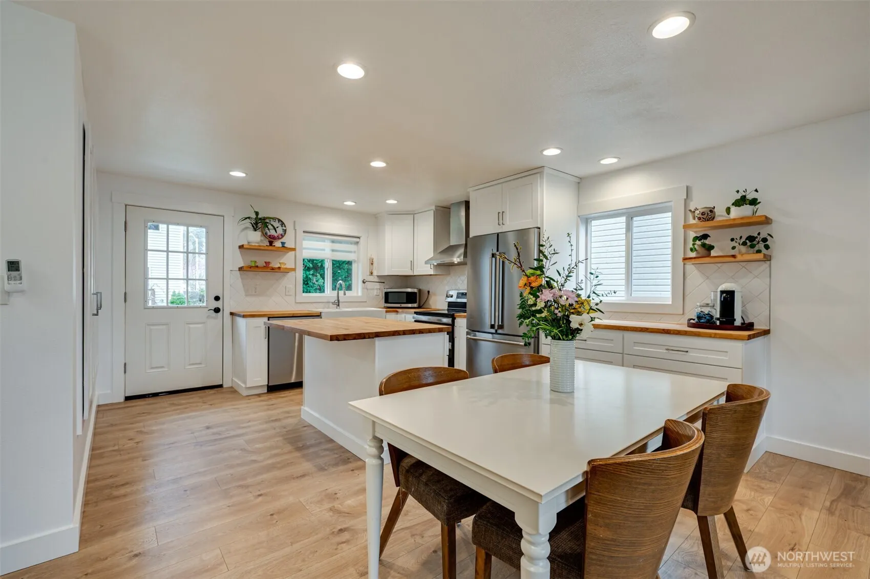 Beautiful single-story home with RV parking, in a quiet neighborhood with a fully fenced backyard. Great room concept floor plan featuring white oak style LVP flooring, and mini-split heating and A/C for year-round comfort. Three bedrooms, two bathrooms, and a kitchen offering stainless steel appliances, an island, butcher block countertops, tile backsplash, and a double oven. The kitchen flows into the family and dining areas with direct access to the backyard and patio. Additional features include double-pane vinyl windows, recessed lighting, and a laundry room with a utility sink. Recent updates include a newer roof, appliances, exterior paint, fencing, decks, and siding. Move-in ready and well maintained.