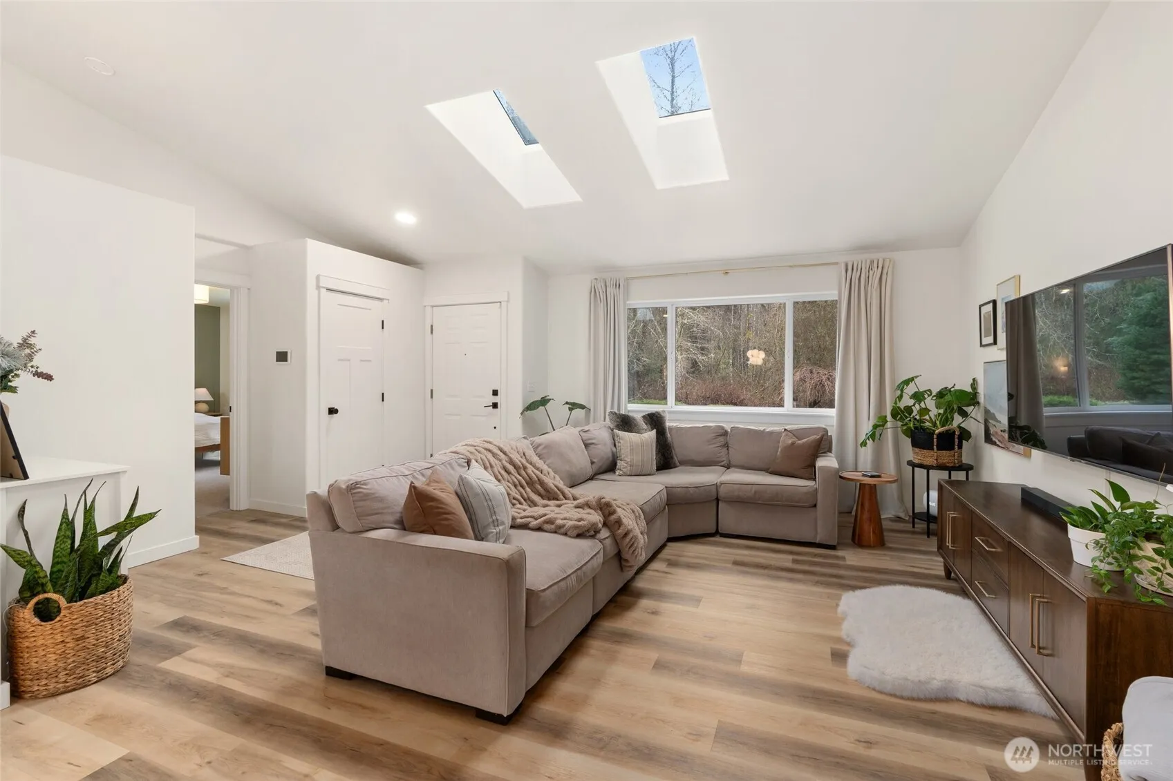 Polished Arlington rambler on a massive 5 + acre lot. This beautifully updated 3 bedroom 2 bath home offers almost 1500 square feet of living space with fresh interior updates throughout. LVP flooring, new interior doors and trim, custom two tone cabinetry with new hardware, granite countertops + kitchen-Aid appliances give the home a modern and refined feel. The primary suite features an attached bath with dual sinks, a sage accent wall, and new carpet, while the additional bedrooms also have new carpet and plenty of natural light. Vaulted ceilings with skylights enhance the bright open floor plan, highlighted by a West Elm dining fixture, built-in accent walls, and charming shiplap details. The updated secondary bath boasts a modern vanity and tile. New windows, tankless water heater and a high-efficiency heat pump + furnace with air conditioning provide comfort year round. Outside, a 2 car garage, additional outbuilding, and storage shed offer plenty of space for projects, hobbies, or storage. This home is on a 4 bed septic system that could be ideal for future DADU or addition. This home blends thoughtful updates, modern style, and a serene private setting on a generous lot, ready to be enjoyed as your forever home.