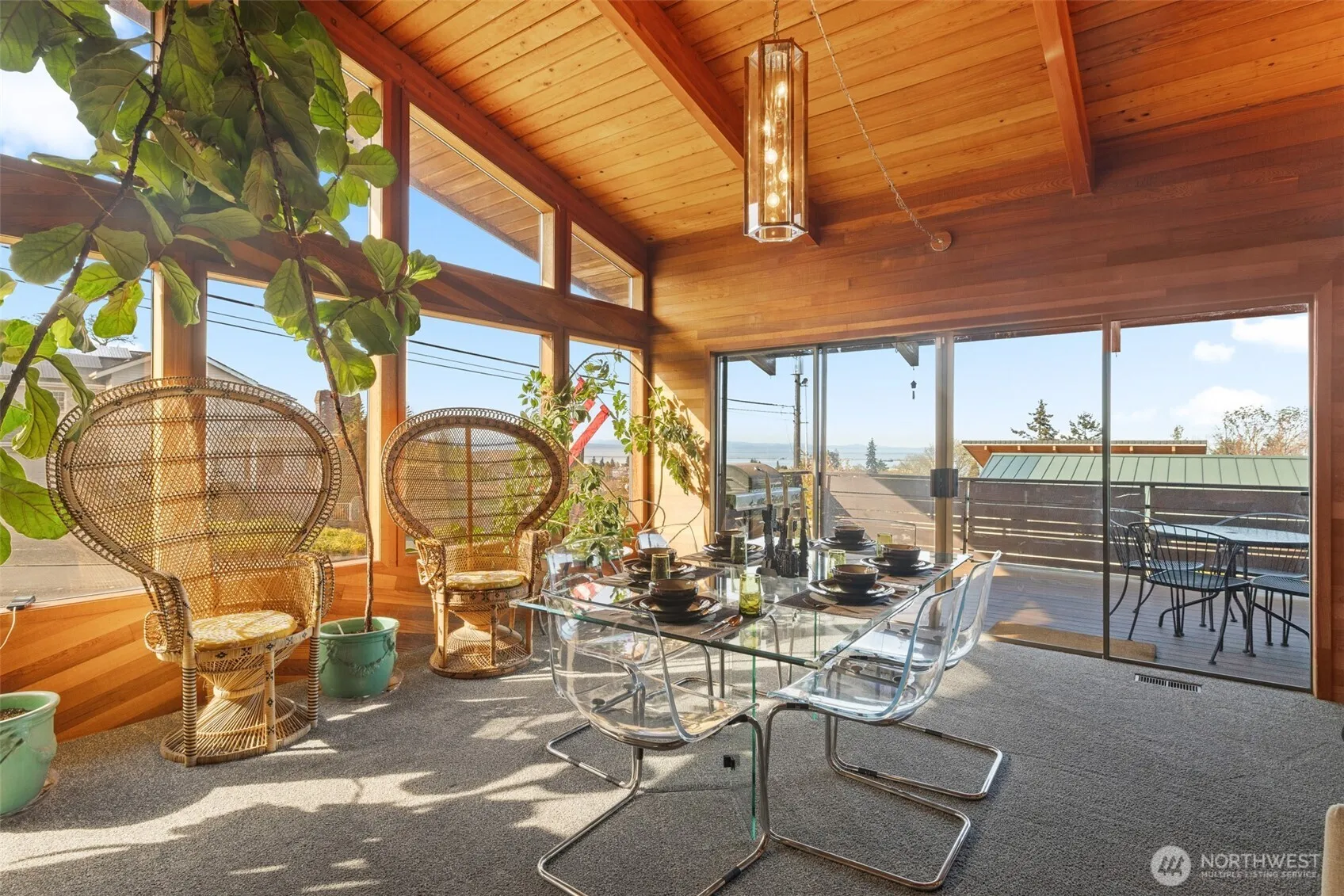 Experience a rare intersection of 1970s contemporary architecture and Pacific Northwest natural beauty. This DelGuzzi-built legacy home, located in the highly desirable Cresthaven neighborhood, is a meticulously preserved split-level masterpiece that channels a sophisticated post-modern, mid-century California vibe. The journey begins with grand stairs leading to a dramatic entry. Inside, the residence reveals soaring interiors characterized by vaulted wood ceilings and rich cedar paneling. The light-filled floor plan is defined by massive windows that frame the rugged beauty of the PNW, offering a front-row seat to stunning sunrise and sunset views over the Strait of Juan de Fuca. At the heart of the home sits an original, full-wall stone fireplace, serving as a monumental focal point for the main living area. Every corner of this property reflects the intentional design and quality craftsmanship of a bygone era, kept in pristine condition for the modern connoisseur.