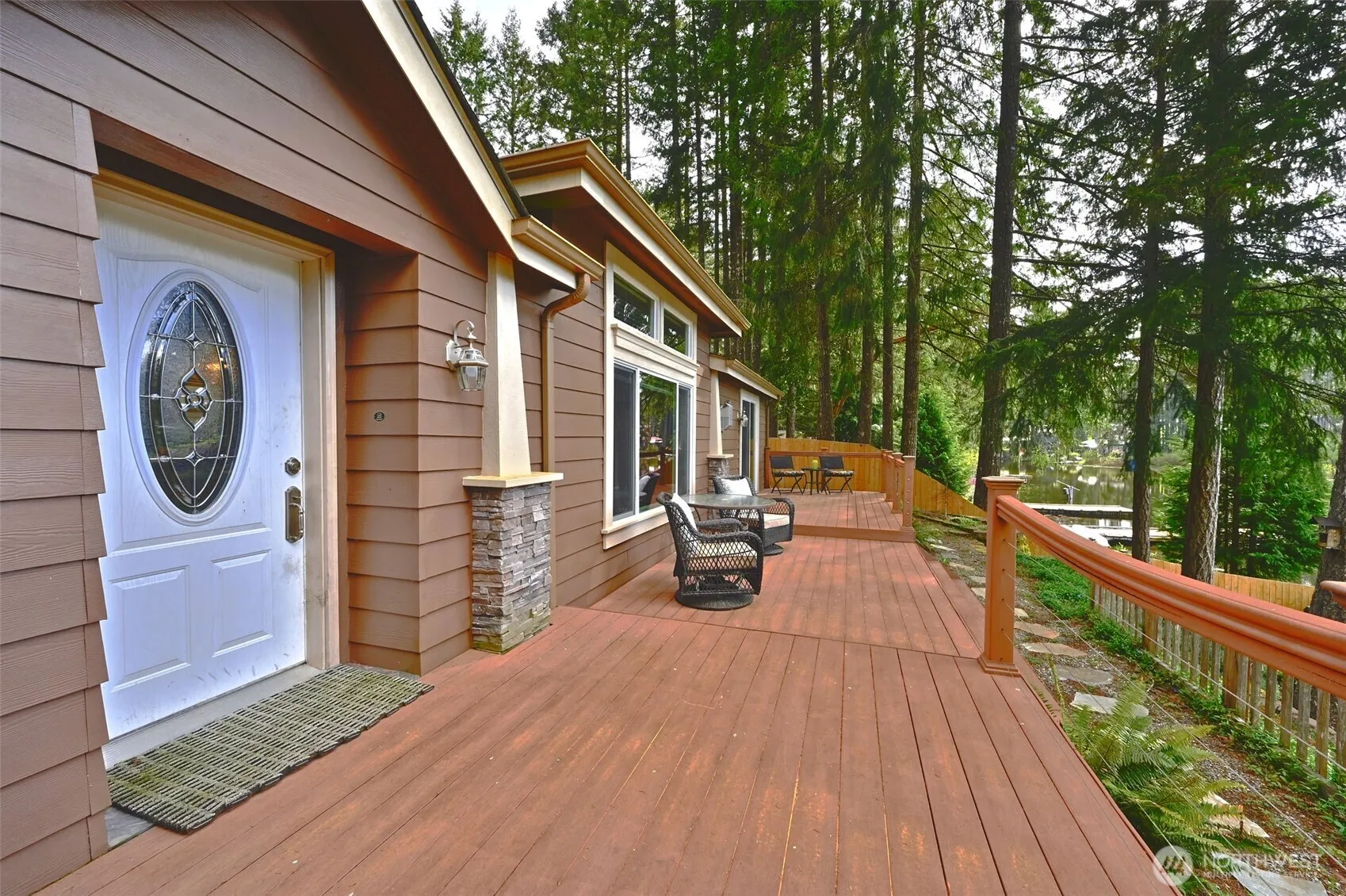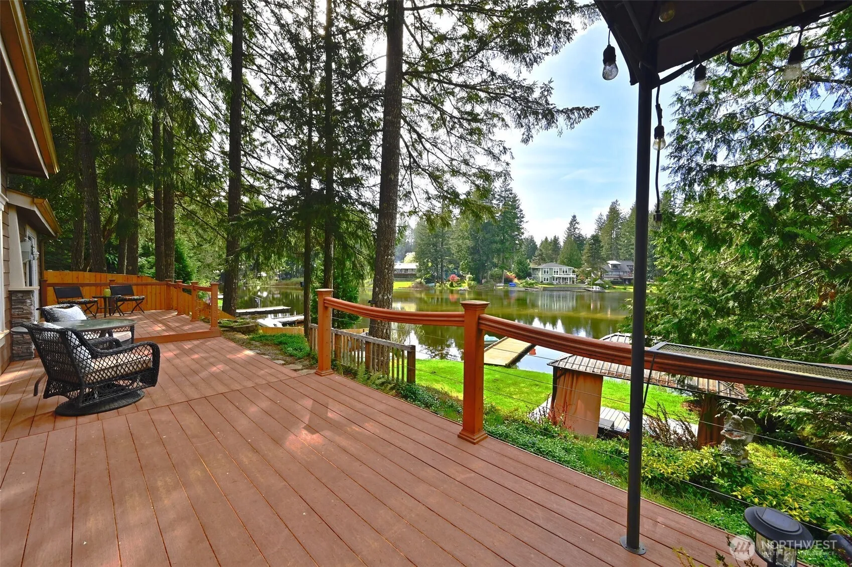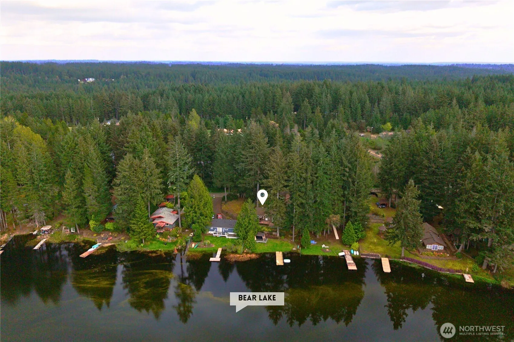 Private dock and 71 ft of no-bank frontage on sought-after Bear Lake set the stage for true lakefront living, where you can fish for stocked bass and trout, paddle, or simply relax right from your backyard. This pristine, turn-key 3-bedroom home showcases pride of ownership throughout with new vinyl flooring, new carpet in the primary, vaulted ceilings, and a light-filled layout enhanced by a solar tube. The spacious kitchen features hickory cabinetry, stainless appliances, a walk-in pantry, and flows seamlessly into the dining and living areas with a cozy propane fireplace. The primary suite offers a spa-like bath with dual vanities, while additional upgrades include a new heat pump (2024) and generator hookup for added peace of mind. Outdoor living shines with a new Trex deck, gazebo, landscaped yard, playset, and direct lake access. The detached shop features durable Hardie Plank siding, and the oversized garage includes a finished flex space above with a propane stove, ideal for a studio, guest space, or home office. Just minutes to Hwy 16 and 3, with no CC&Rs, Group B water ($115/2 months), and all appliances included. Enjoy peaceful, quiet lake living with nearby trails and community park access, where days are spent on the water and evenings unwind in a truly serene setting.