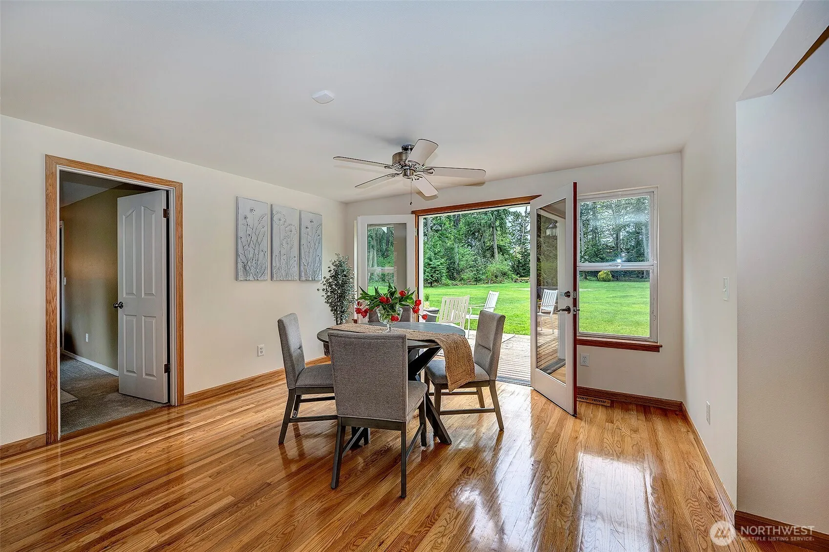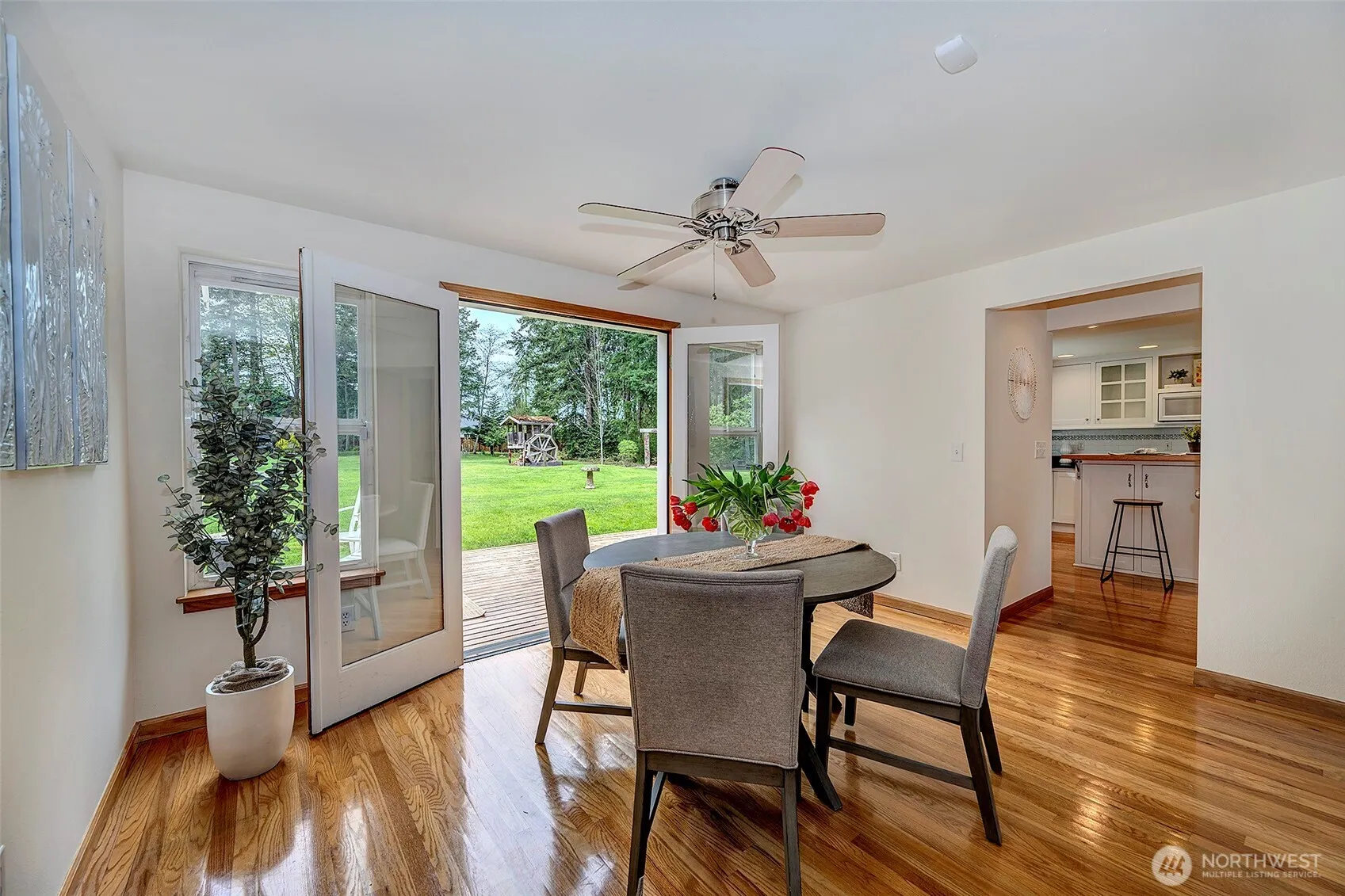 Experience the beauty & privacy of this exceptional Camano Island property on the highly desired north end of the island. Nestled on 2.5 park-like acres, this meticulously maintained 3-bed, 2.5-bath, 2,071 sq ft home offers thoughtfully designed living spaces & an attached oversized 2-car garage. Main level features a spacious primary suite with ensuite bath & walk-in closet, along with a gorgeous kitchen with custom cabinets & an adjoining dining area. You’ll also find a dedicated office, an oversized laundry room with half bath, and an inviting living room with warm wood floors. French doors open to a large deck with an automatic retractable awning—perfect for those sunny days. Upstairs are two bedrooms, both with walk-in closets, connected by an adjoining full bath. Outside, enjoy a private retreat with scenic walking trails, a built-in fire pit, & a charming working water wheel. Bonus features include a massive 4-bay shop & separate workshop with ADU/MIL (mother-in-law) potential, ideal for hobbies or storage, plus a fully automatic Cummins generator. Minutes to beach access, golf, coffee shops, Cama Beach State Park & Camano Island State Park, everyday conveniences, & no ferry. Just over an hour to Seattle & Bellevue.