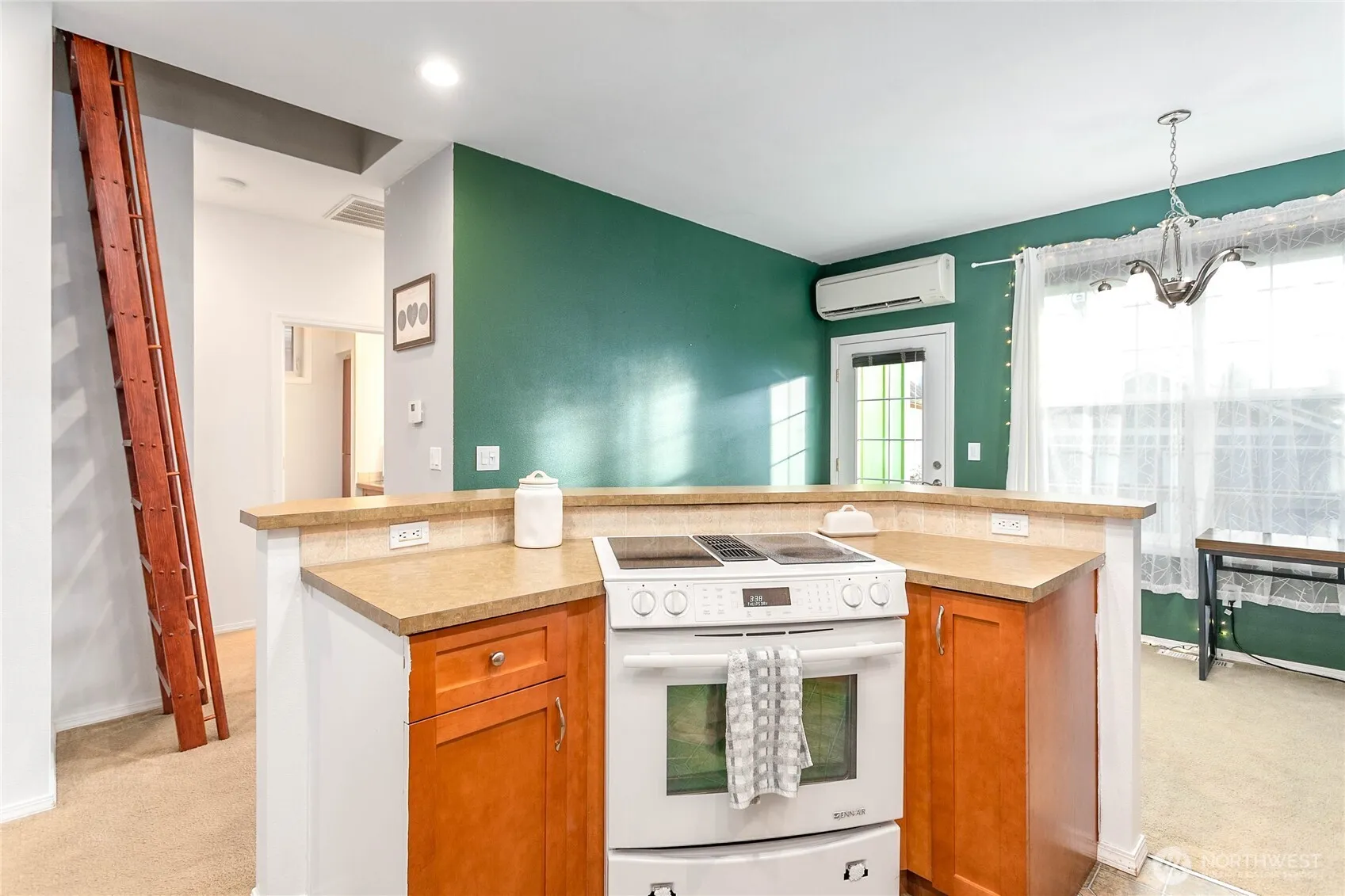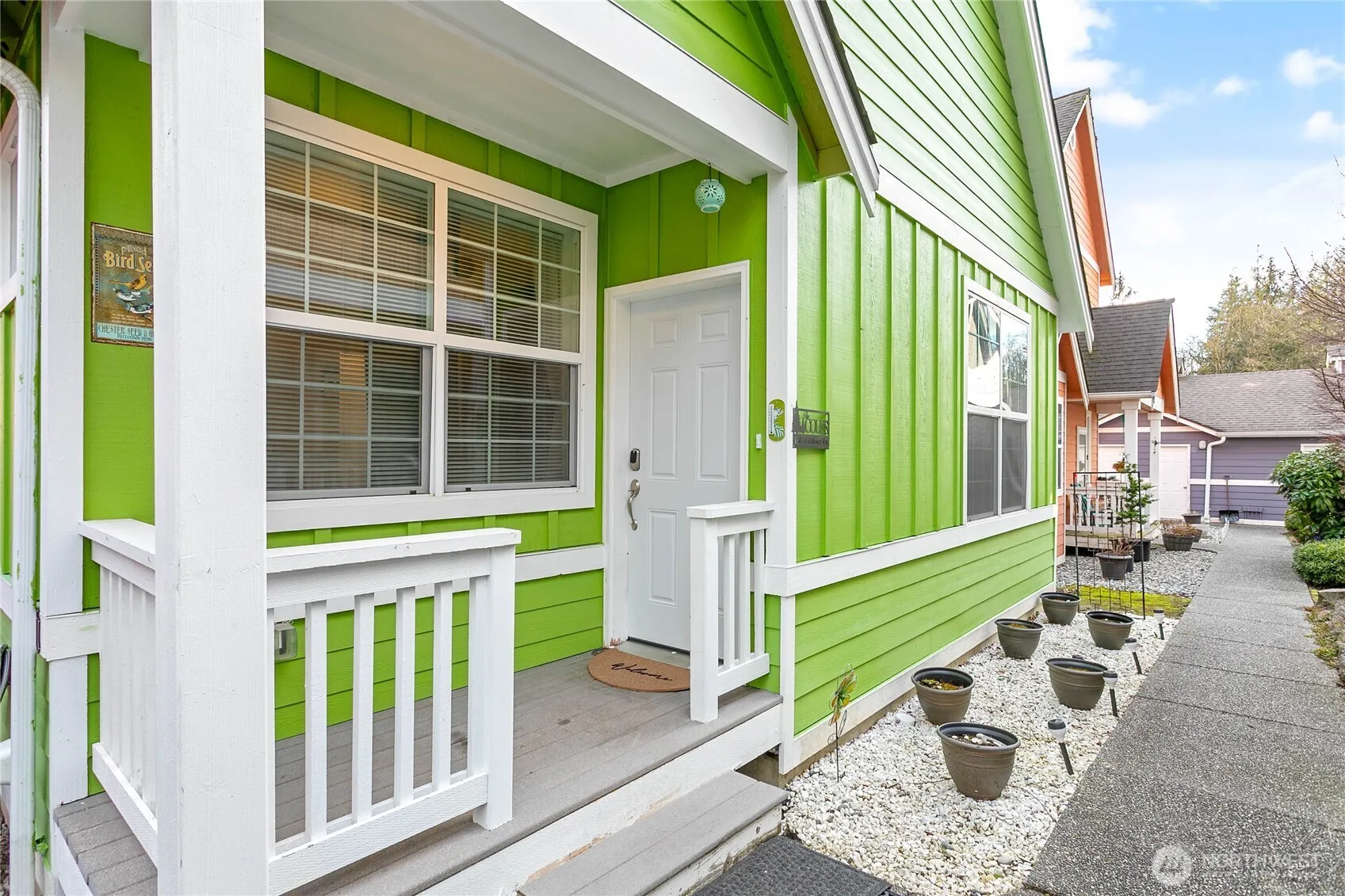 Charming cottage with standout curb appeal, ideal for first-time buyers or those seeking an approachable path to homeownership. A vibrant exterior and welcoming front porch set the tone for this cheerful home. Inside, vaulted ceilings and an open-concept layout create a bright, airy feel, centered around a cozy gas fireplace. The kitchen flows into the dining area with direct access to the deck, supporting easy indoor-outdoor living. A flexible loft/office space adds versatility for remote work or relaxation. Comfort and efficiency are covered with a ductless heat pump for heating and A/C, plus updates including a tankless water heater, new carpet, and updated appliances. Detached one-car garage (5D) provides added storage and convenience. As a single-family residence (not a condo), enjoy the independence of owning your own home. USDA financing eligible (buyer to verify), with potential zero-down options for qualified buyers. Located in Sedro-Woolley, where small-town charm meets Cascade Mountain views. Directly across from Olmsted Park—14 acres featuring Thompson Pond and seasonal activities—and near access to the Cascade Trail for miles of walking, biking, and recreation. HOA-maintained lawns simplify upkeep, and a shared community gardening shed with tools supports individual flower beds, adding a thoughtful neighborhood touch.