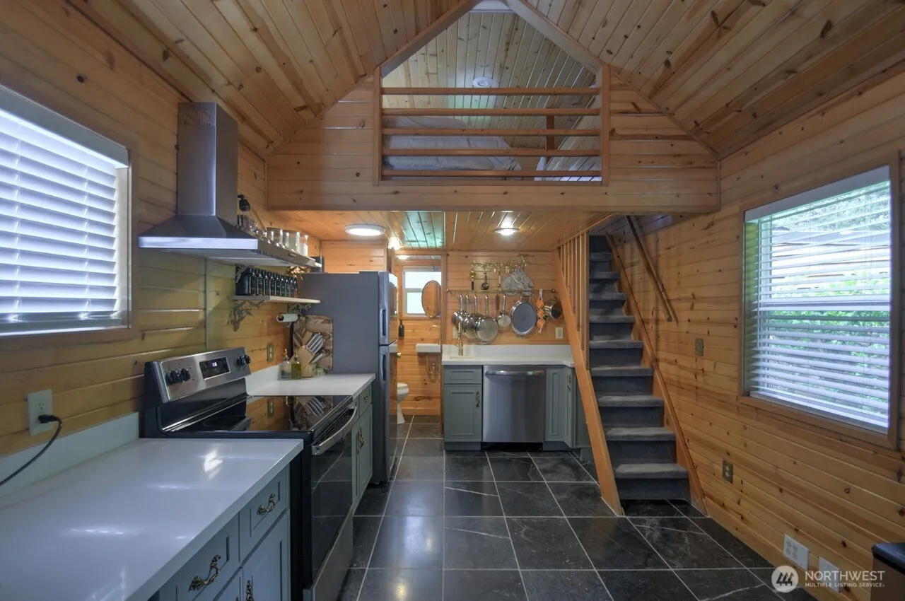 Hemlock 44 Tucked away in beautiful Lost Lake Resort, this cabin has a loft bedroom overlooking the living, dining area. Recently remodeled kitchen with quartz counters, tile floor, all new fixtures and lighting. The bathroom remodel making it a larger shower with rain shower head. The loft has all new carpet. Bedroom is currently up in the loft but can be arranged in the living area (Old Photo to show). New appliances include electric stove top, refrigerator, microwave and diswasher. New mini split heat and A/C.This property has a shed with newer washer/dryer. great storage and a covered carport for 2 cars. Beautifully landscaping around the entire property. The amenities include indoor/outdoor swimming pool, pickle ball, putt putt golf, workout room, with access to hiking trails. The Lost Lake Clubhouse is great for swimming/fishing or just relaxing on the dock.
