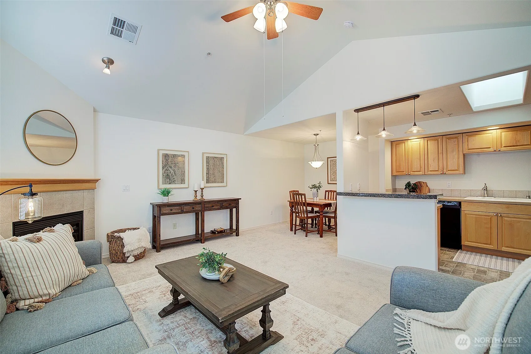 Enjoy the harmonious blend of convenience and flair. Beautifully filled with natural light, as it floods the nicely sized open concept spaces. Large living room with fireplace. Adjoining dining, and nicely appointed kitchen. The nearby deck is a perfect space for a great book and your favorite beverage. The primary suite is very generous in size ~ large walk-in closet, and bath complete this area. Guest bedroom, and bath area compliment this very special place to call home. New carpeting throughout. Located near shopping and dining. Walking trails nearby. Norwood Glen is a 55+ community. Welcome home.