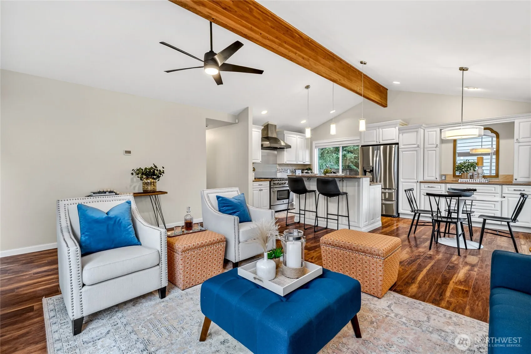 Not your average home—and that’s exactly the point. With mid-century influence and a layout you don’t see every day, this home is designed around connection, light, and space. A private courtyard entry welcomes you in, while a glass-encased breezeway links two distinct wings—creating a seamless indoor-outdoor flow. Vaulted ceilings and an airy layout lead into a remodeled kitchen featuring a large island, commercial BlueStar range, and extensive cabinetry—ready for everything from quiet mornings to a full house. Both bathrooms have been fully remodeled, including a primary suite with its own ¾ bath. A 2016 addition introduces a spacious bonus room—ideal for movie nights, game days, or a space that finally flexes the way you need it to. Step outside and the property truly shines. A terraced backyard rises behind the home, offering layered garden views, privacy, and multiple outdoor spaces—including a courtyard-style retreat with hot tub. A detached shop with power, water, and garage door adds incredible flexibility for projects, hobbies, workspace—or potential future ADU. Brand new roof (April 2026), remodeled bathrooms, new lighting, and fresh interior paint throughout—walls, trim, doors, and ceilings—paired with new lighting and laminate flooring, completes the home. Located in Fairwood West with a 2-car garage and generous driveway parking. A home that stands apart and that you won’t forget.
