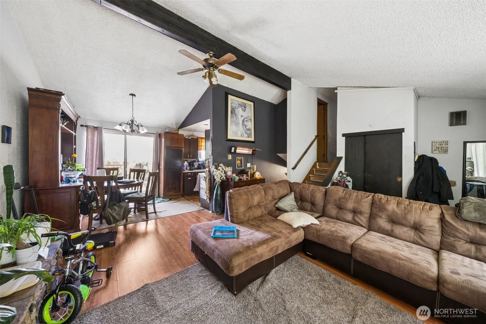 Tri-level NW Contemporary home in the Redondo area with 1,530 sq ft on a 6,679 sq ft lot. Built in 1977, this 3-bedroom, 1.75-bath home features vaulted ceilings, a daylight basement, and a wood-burning fireplace. Main level includes living room, dining area, and kitchen, with additional finished space and bonus room flexibility. Attached garage plus driveway and off-street parking. Partially fenced yard with level lot, territorial views, and location on a paved street with curbs. Utilities include public water and sewer, electric heating, and composition roof. Property is a fixer and offers potential for renovation or customization.