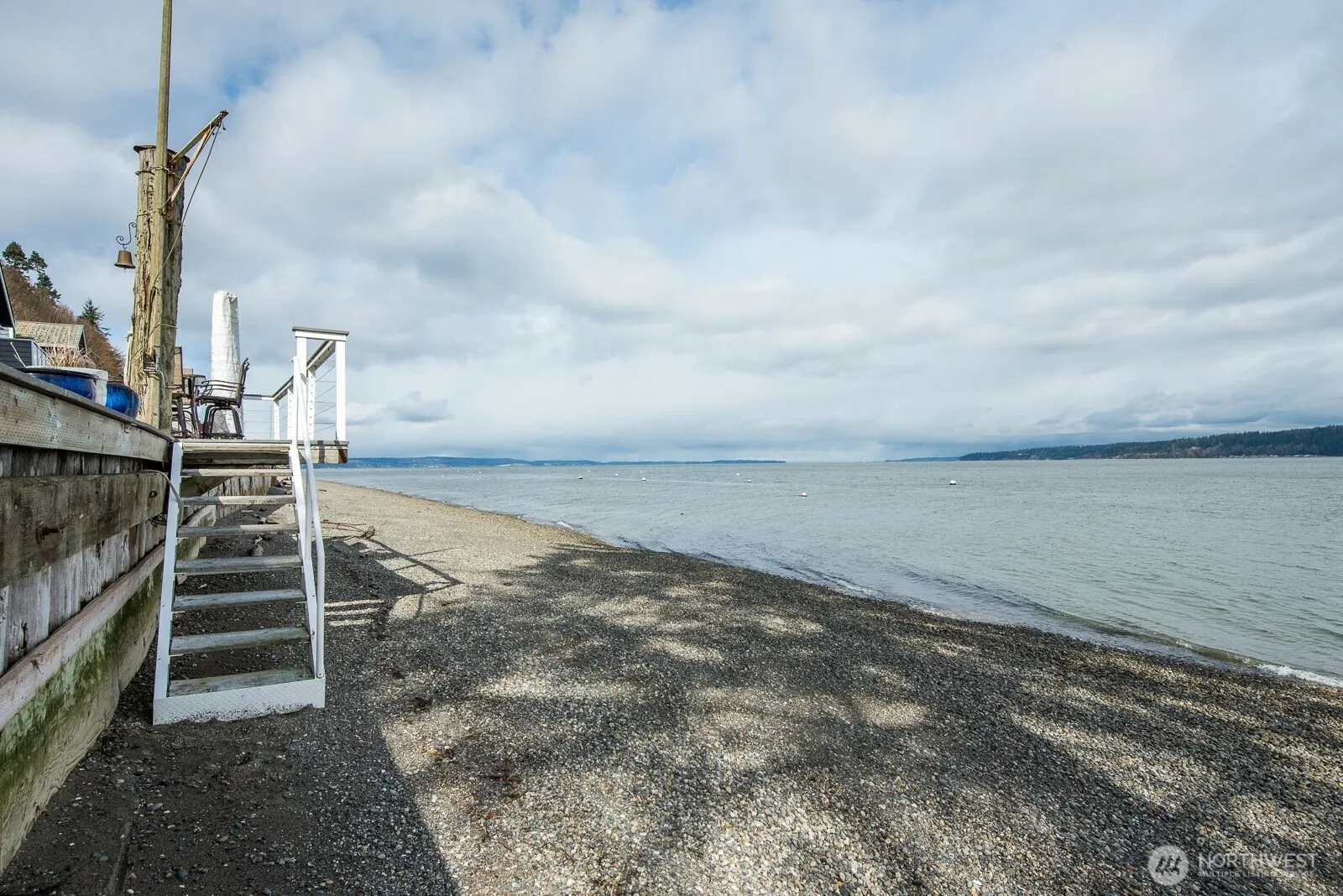 Fantastic beach cabin with 58’ of level waterfront, bulkhead! Enjoy whales, seals, and abundant birdlife right from your own beach. This well-maintained 1,184 sq ft cabin has been thoughtfully updated throughout and offers 1 bedroom plus a spacious den and 1.75 baths. The kitchen features soft-close cabinetry with pull-out drawers, Maytag stainless appliances, quartz countertops, and tile backsplash. The primary suite includes a ¾ bath with tile floors and a tile and stone shower. A large den provides great space for guests, and the full bath includes built-ins for extra storage. Vaulted ceilings with a fan and skylight, along with large windows and sliding glass doors, fill the home with natural light. All built in TV’s stay. Enjoy expansive outdoor living with a huge composite deck, fire pit, bulkhead, and retractable stairs to the beach. The cabin faces east, offering stunning Cascade Mountain views and incredible sunrises. Includes a mooring buoys. Just in time for Summer whale watching right from your deck! Sold fully furnished and would make a great VRBO. You can also purchase with the lot next door for a total price $1,795,000.