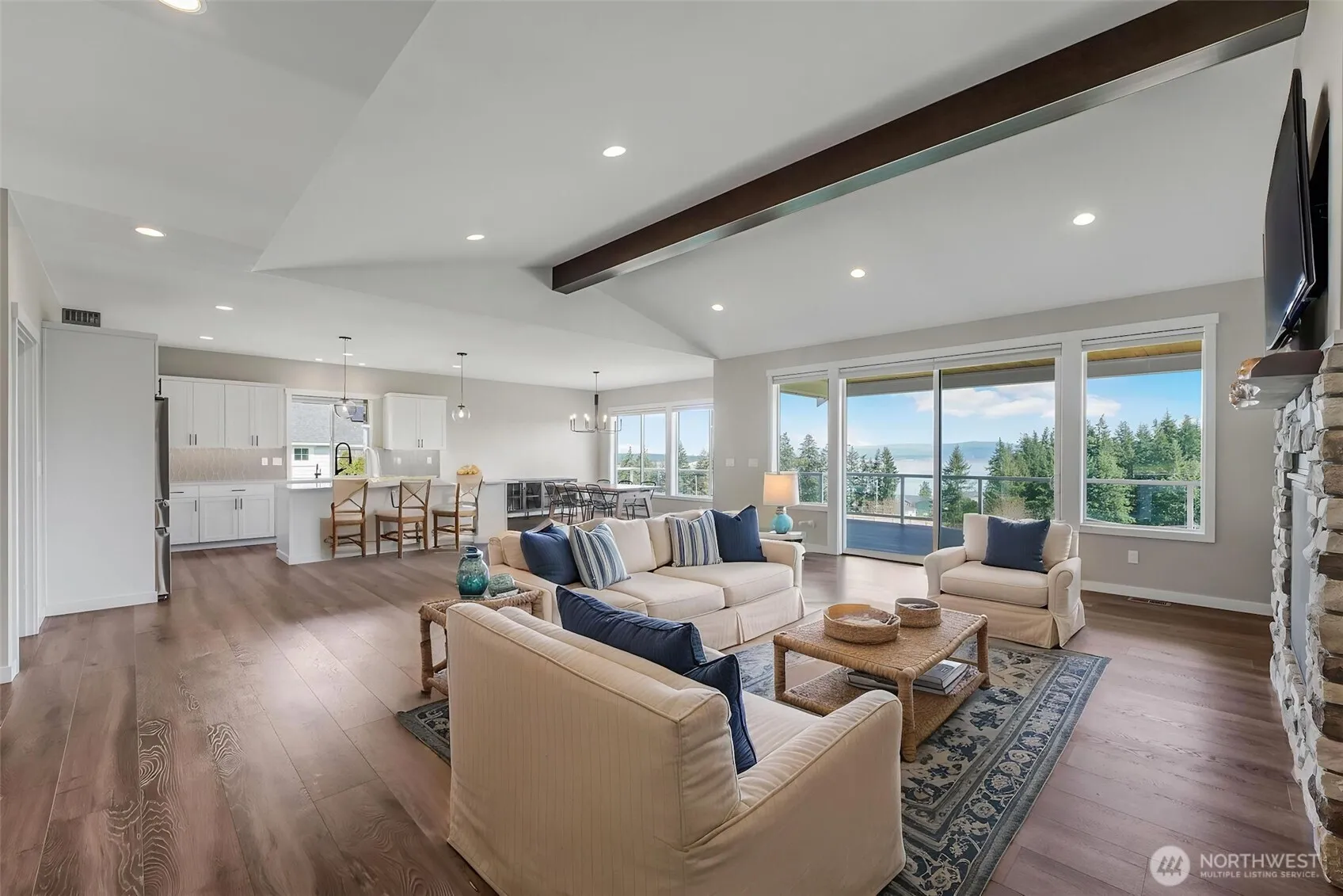 Breathtaking, panoramic views of Mt. Baker, the Cascade Mountains, and Port Susan serve as the daily vista for this 2,515 sqft. luxury home. Centrally located on Camano Island within a gated community, this 4-bedroom, 2.25-bathroom home perfectly balances style with the tranquility of island living. Enjoy the open concept living space with vaulted ceilings, gourmet kitchen, huge Great room and dining room that all open to the expansive deck with the views as your backdrop from every corner. Set on 2 pristine acres, the property includes a large, fenced yard, greenhouse and dedicated garden space. The primary bedroom is a true retreat with incredible views and features deck access, a spacious walk-in closet, and a lovely ensuite. 3 more bedrooms, full bath, powder room, laundry room and walk-in pantry complete the space. Sustainability meets luxury with solar power to offset energy costs, plus a 3-car garage for all your Pacific Northwest gear. Luxury finishes throughout including LVP flooring, quartz countertops, high end appliances and top of the line Lutron smart blinds. Enjoy the optional access to three private Camano Country Club beaches. Live the island lifestyle with the convenience of no ferry and still be close to all amenities. Welcome home. Some images are virtually staged.