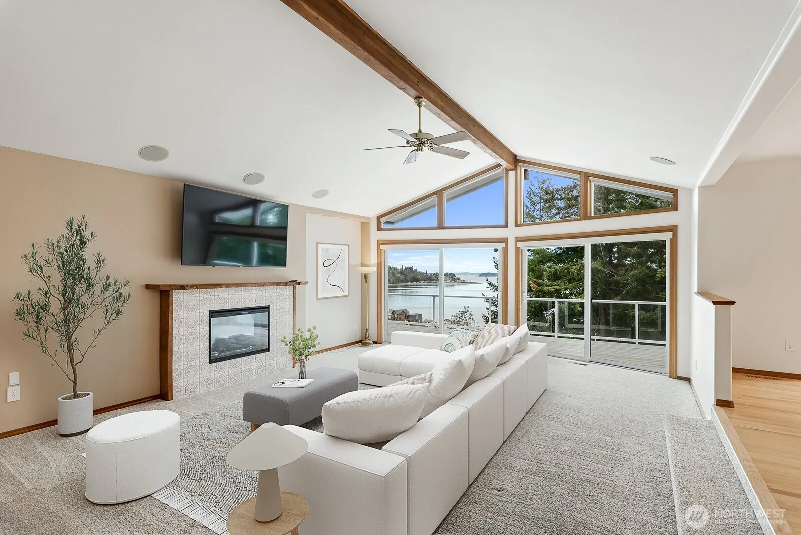 Nestled in a private, prime north-end location, this beautifully updated 3-bed + den, 3.5-bath home offers the perfect blend of comfort & style. Enjoy two spacious ensuites, an expansive open-concept great room, & a huge kitchen ideal for entertaining or everyday living. The layout is ideal for multi-generational living, featuring a separate lower-level living space that can function as a fully private retreat, perfect for extended guests, rental potential, or independent living. Recent upgrades shine throughout, including a brand-new roof (2026), a stunning kitchen, new carpet & countertops, and recently sealed hardwood floors. The exterior has been thoughtfully enhanced with hydro-seeded lawn and easy-maintenance artificial turf, creating a lush, low-maintenance outdoor space year-round. Central A/C, generator, & solar panels (56 panels @17.43KW)add energy efficiency with low PUD bills, while the generous .61-acre lot showcases sweeping views over Utsalady Bay & breathtaking sunsets that create a true retreat-like atmosphere. The garage is heated and air-conditioned. With thoughtful updates, designer touches, and nearby beach rights, this home offers peace, privacy, & proximity to all amenities on Camano Island. Don’t miss this rare opportunity to own a slice of paradise in a sought-after neighborhood!