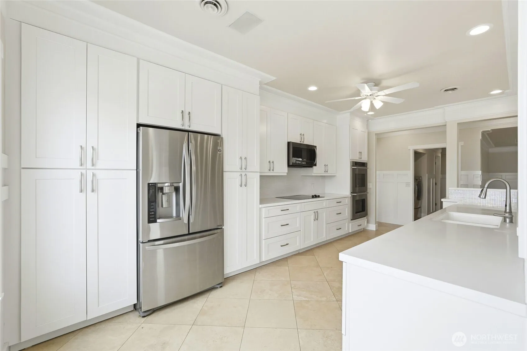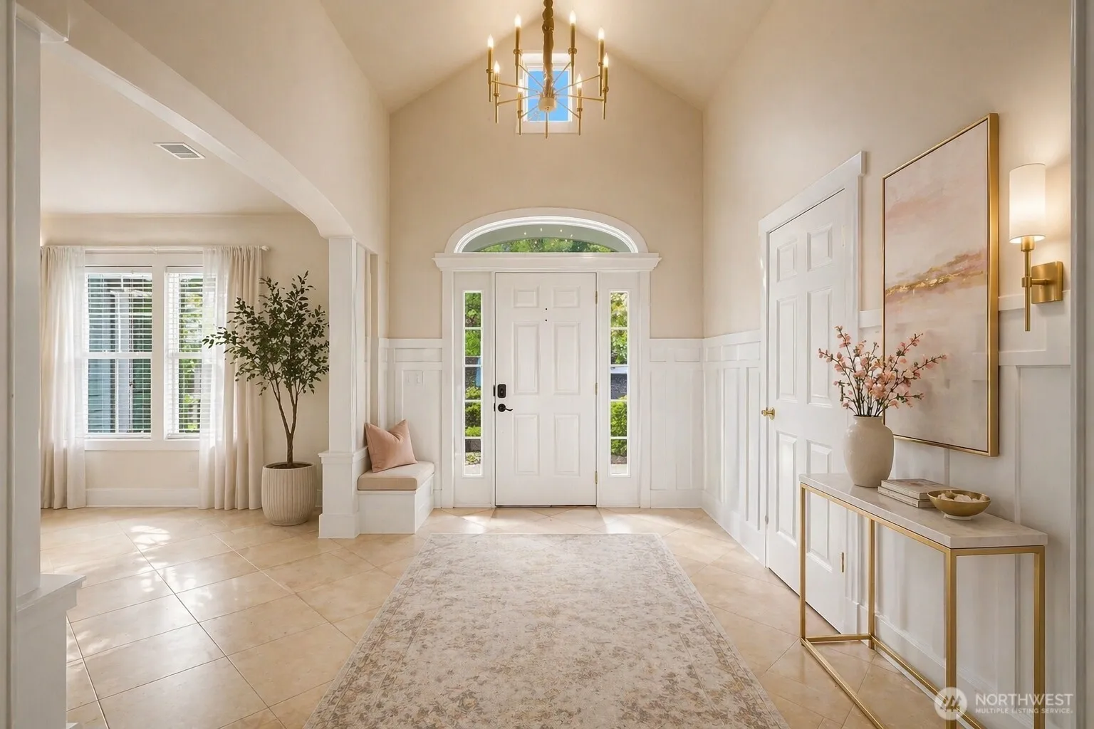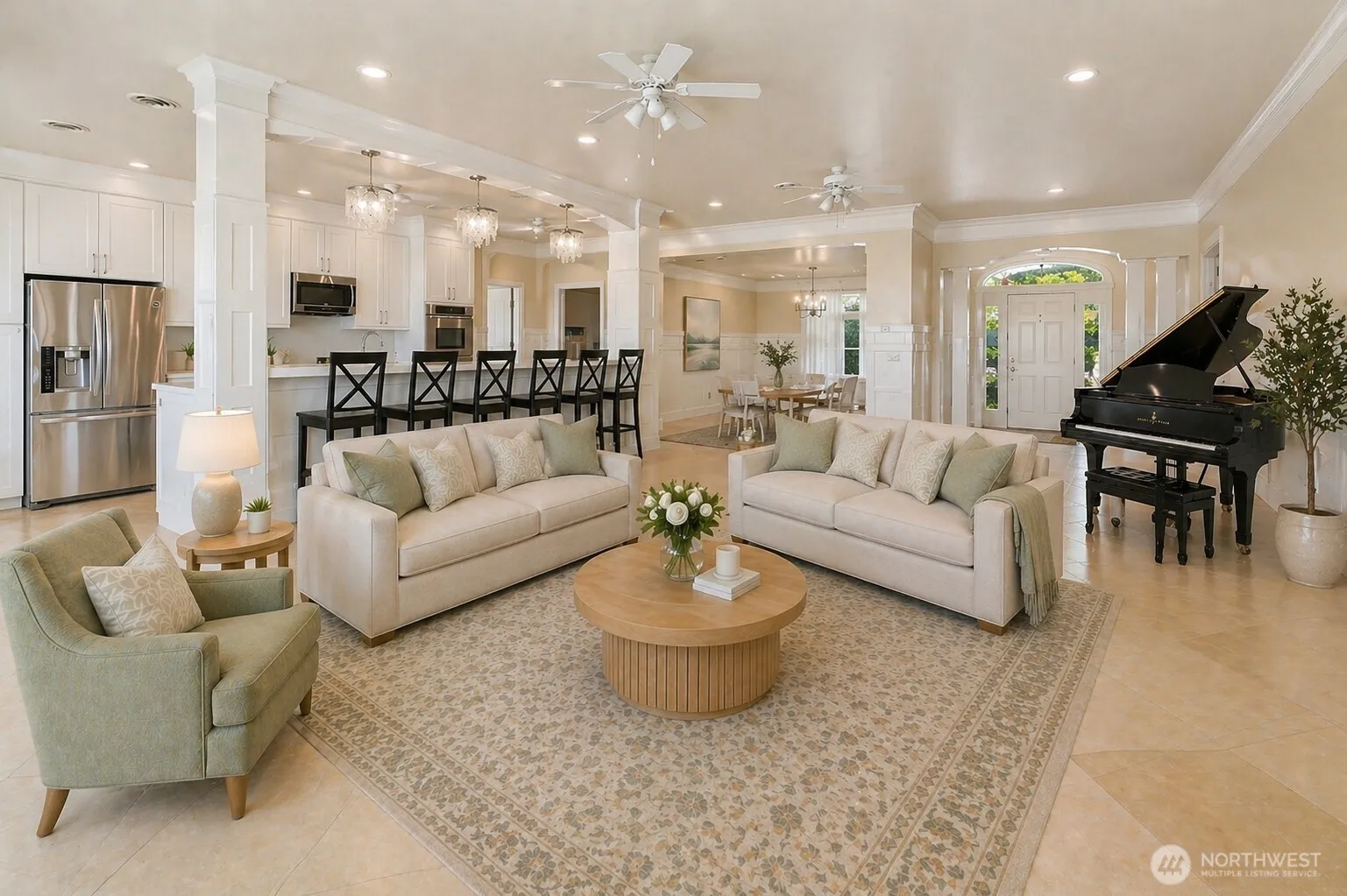 Perched above Skagit Bay on a rare half-acre/double lot, this exceptional 5,200 sq ft daylight rambler commands 180-degree water views from every room, creating a daily backdrop of shimmering blue, glowing sunsets, and the snow-capped rise of Mt. Baker. Designed for those who value elevated living and effortless entertaining, the home blends luxurious finishes, distinguished millwork, and travertine floors with bright, open-concept spaces that frame the coastline at every turn. The gourmet main-floor kitchen flows seamlessly to an expansive view deck—your front-row seat to passing boaters, sailboats gliding across the bay, and even paragliders tracing the island sky. Two refined primary suites, two additional bedrooms, a flexible craft/hobby/multi-use room, and oversized mudroom, offer exceptional comfort and versatility for modern living. The fully finished lower level extends the lifestyle experience with a second kitchen, a spacious bonus room with wet bar, and direct access to a covered patio – an ideal MIL suite or guest retreat. Just steps from your back door, enjoy private community beach access for member-only recreational privileges such as crabbing, swimming, and shoreline adventures. Spend endless, effortless time on the water completes this rare offering of space, sophistication, and iconic Camano Island views.