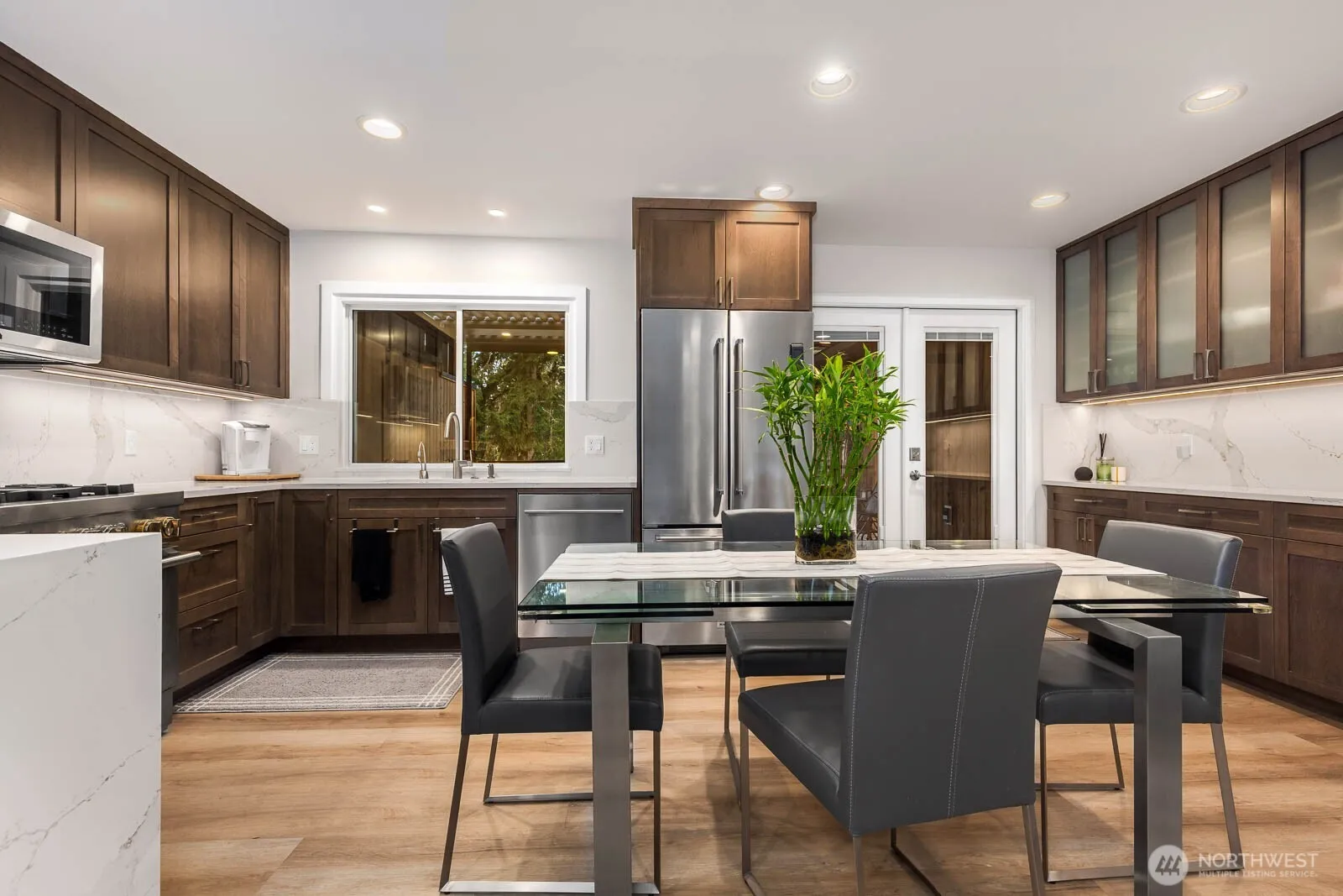 Tucked at the end of a quiet cul-de-sac in the coveted Northshore School District, this Bothell residence rests on a lush quarter-acre greenbelt, offering rare privacy and versatility with a fully permitted ADU. Thoughtfully curated updates and refined indoor-outdoor living create a move-in ready retreat suited for multigenerational living, income potential, or elevated entertaining. Light-filled main living spaces open to a showstopping covered patio featuring articulating louvers, automated screens, a high-output gas heater, and rich cedar accents. A pass-through bar connects seamlessly to the kitchen, creating an effortless year-round entertaining experience. Refreshed baths, a spacious primary suite, and tranquil tree-lined outlooks enhance the home’s sense of comfort and seclusion. The lower-level ADU offers a private, self-contained living experience with a full kitchen, laundry, flexible bonus space, and separate entrance—ideal for guests or premium rental income. Outdoors, enjoy professionally designed landscaping, and a 200 sqft future-ready pad for a luxury outdoor kitchen, or studio. Ideally located near parks, trails, and commuter routes, this is a rare blend of privacy, sophistication, and modern Northwest living.