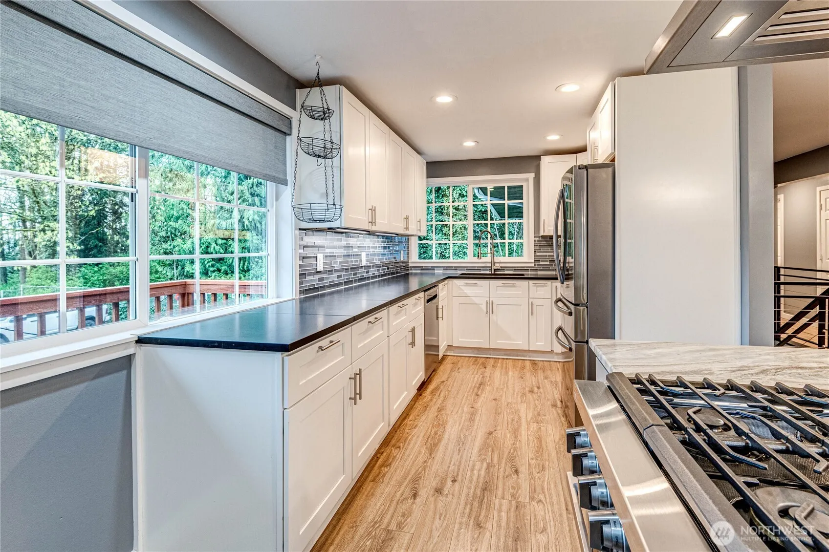 Welcome to a truly exceptional home where thoughtful design, high-end upgrades, and flexible living come together in one of Everett’s most peaceful settings. Tucked away on a quiet dead-end road, this corner-lot property offers rare privacy as it backs to a lush greenbelt while still delivering those stunning, snow-capped mountain views that greet you as you enter the neighborhood. Inside, the home has been extensively upgraded with both comfort and quality in mind. The expansive kitchen is a true centerpiece, featuring beautiful granite surfaces and a premium Dacor 6-burner range with steam functionality, perfect for everyday living or entertaining at a higher level. Modern conveniences are woven throughout, including WiFi-enabled controls, a tankless water heater, and upgraded 200-amp electrical service to support today’s lifestyle with ease. The property shines just as much outdoors as it does inside. The professionally landscaped backyard is designed for both enjoyment and peace of mind, complete with a drainage system that enhances usability year-round. A 50-year metal roof adds long-term durability, while RV parking provides additional flexibility for storage or adventure. One of the standout features of this home is its versatility. The lower level offers a full studio with a private exterior entrance, ideal for multigenerational living, guests, or potential rental income, while still maintaining interior access if desired.