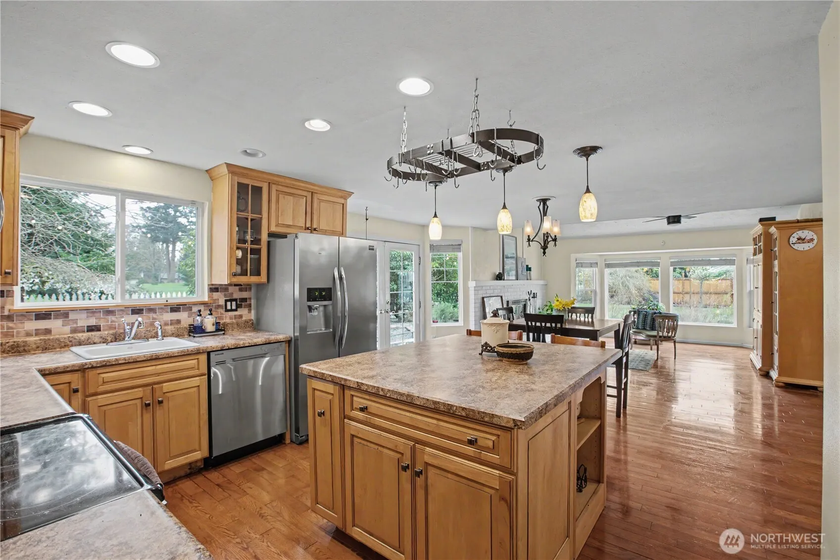 This stunning golf course property offers plenty of privacy and elbow room, with 200 feet on the 11th fairway of Oakbrook Golf Course. Nicely updated, the home flows effortlessly for easy living. Kitchen has a large island and seamlessly flows into the great room and backyard. Wine/beverage bar with refrigerator, lends a perfect setting for entertaining or just relaxing. Plenty of windows allow the natural light and beauty of the backyard to shine on in. Formal dining room and living room. Den/4th bedroom on the main floor is a perfect location for telecommuting. The generous primary bedroom offer a luxury bathroom with a walk-in closet. Large 2nd and 3rd bedrooms and hall bath complete the the upstairs. At nearly a 1/2 acre the yard has lots of space for gardening, entertaining and privacy and extends far beyond the fences. 2 garages, one which is currently setup as a hobby space, and a storage shed give ample storage room. Large driveway provides plenty of room for parking. Close to the Steilacoom waterfront, nearby lakes, shopping, restaurants and schools make this a perfect location to be your new home!