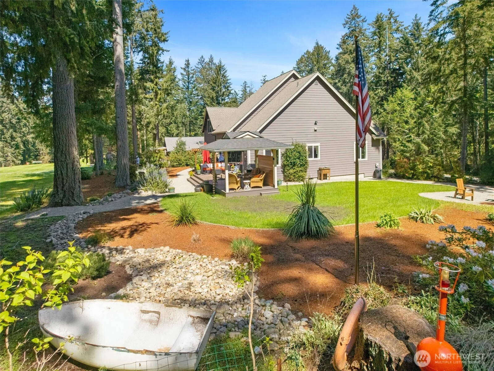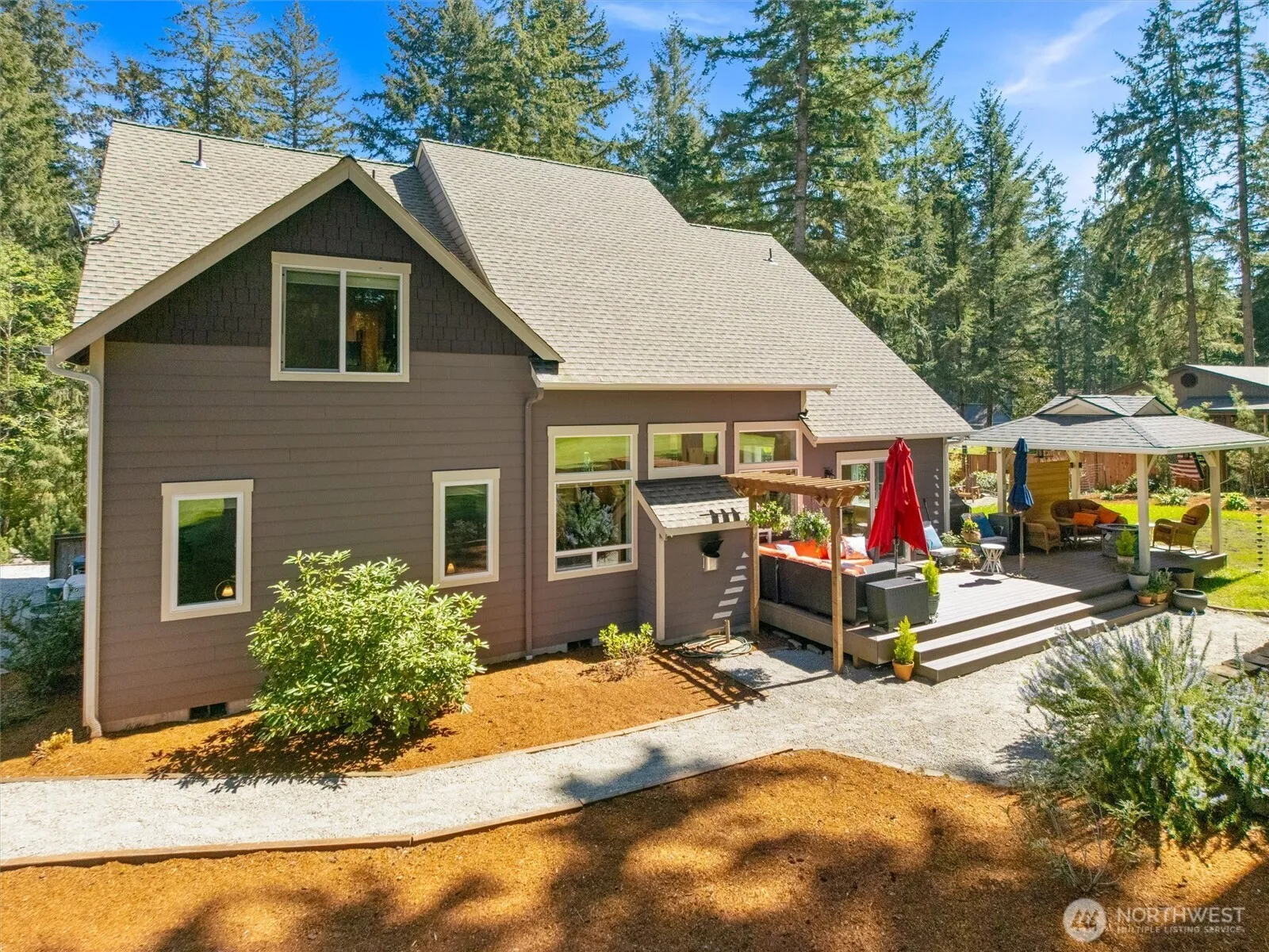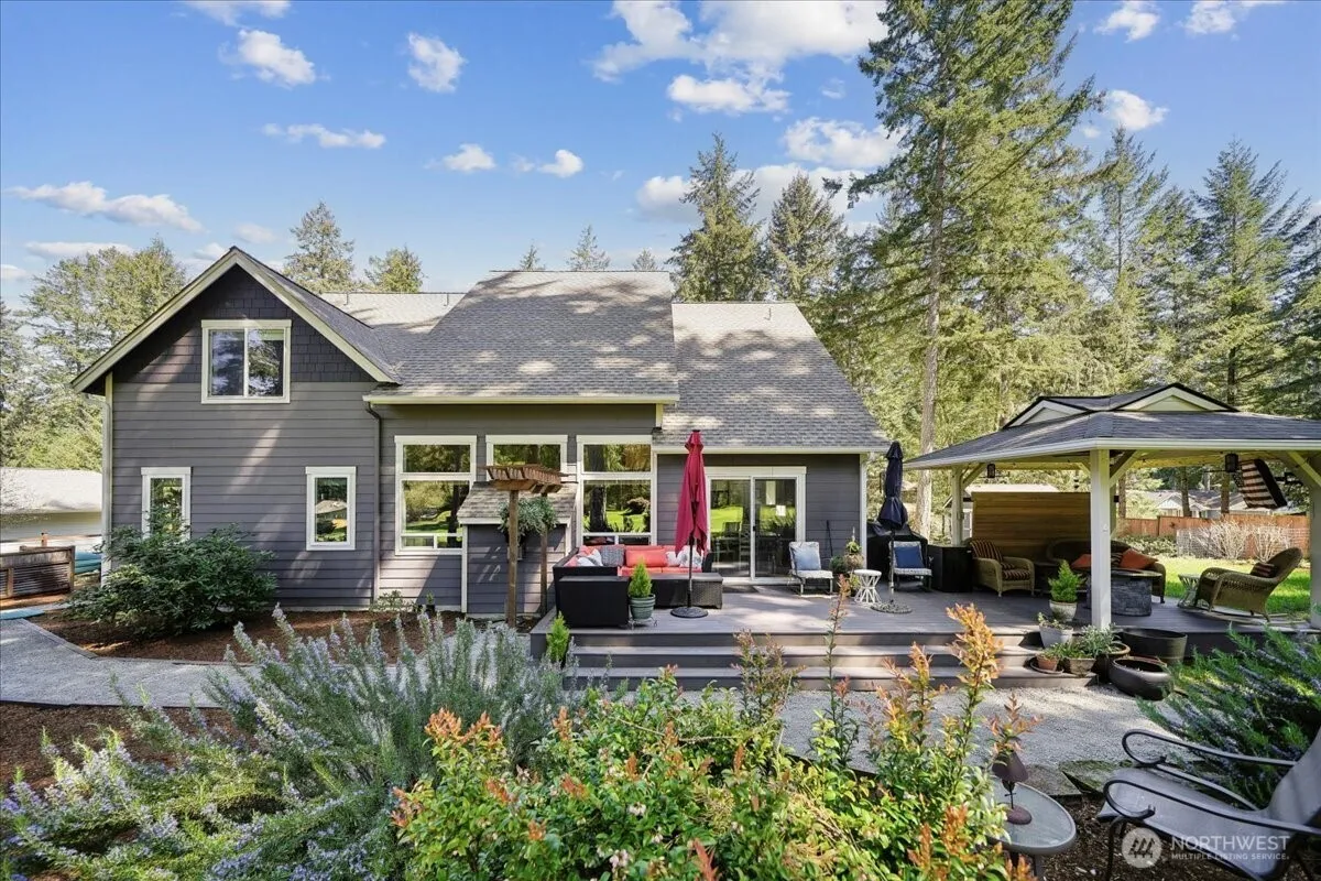 Indulge in sophisticated golf-course living in this stunning custom 2016 home, perfectly situated on a shy 0.4 acre double lot on the 6th fairway of Anderson Island’s Riviera Golf Course. Designed with luxury in mind, the expansive open-concept living area boasts soaring ceilings, wood floors, & a cozy propane fireplace w/tile surround, creating an inviting atmosphere for entertaining & quiet evenings. The chef’s kitchen is a masterpiece of function & style, featuring granite countertops, walk-in pantry, soft-close cabinetry, and peninsula w/ breakfast bar seating. The main-floor primary suite serves as a true sanctuary, offering sweeping views of the fairway & a spa-inspired 3/4 ensuite designed for ultimate relaxation in the custom walk-in tile shower or the private, built-in Finnish sauna. Upstairs, the home provides versatility with 2 additional bedrooms, a full bath, and a sprawling bonus room—perfect for a game room, crafting, or guest retreat. The outdoor living space is equally impressive, with a large composite deck & custom gazebo equipped with power, ideal for year-round enjoyment. Plus, 10X10 storage shed, Generac auto-generator, & RV parking. With Riviera HOA membership, enjoy ample amenities: Executive 9-hole course, 2 freshwater lakes, saltwater marina, campground, & tennis/bocce ball courts. Whether you’re relaxing after a round of golf or enjoying the natural beauty & wildlife, this home offers an unmatched island lifestyle just a 20-minute ferry ride away.