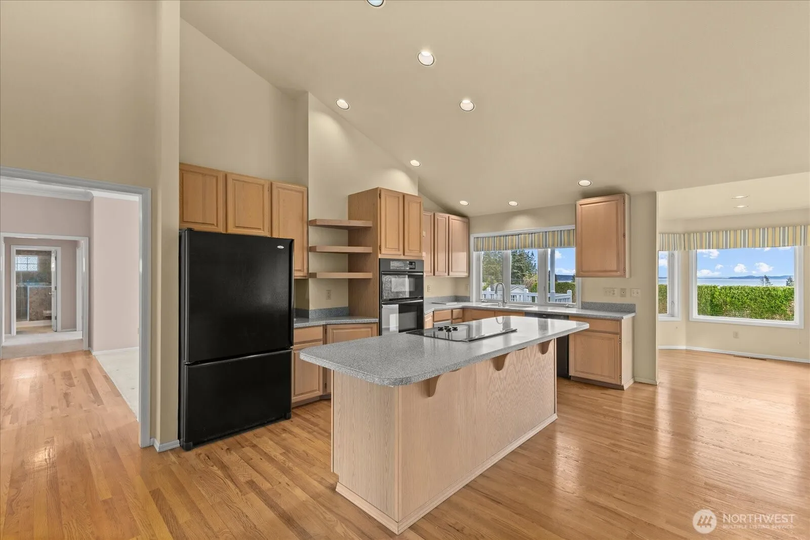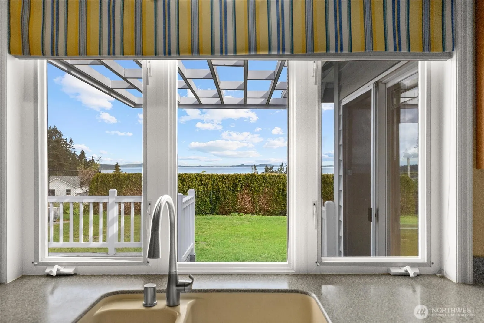 Perched in a desirable neighborhood on a generous lot, this beautifully maintained home offers breathtaking views of Utsalady Bay, the Olympic Mountains, and Mount Baker. Established landscaping paired with a full sprinkler system enhances the home’s curb appeal and keeps the grounds looking effortlessly pristine, while an expansive deck invites easy outdoor living and entertaining. Inside, rich hardwood floors, vaulted ceilings, and crown molding set a warm, elevated tone. The formal living room is anchored by a marble fireplace, perfect for gatherings both intimate and lively. Built-in shelving throughout adds charm and function, while a dedicated office provides space to work or create. The layout includes three generously sized bedrooms, including a roomy primary suite with a large walk-in closet. The secondary bathroom has been tastefully updated, blending modern touches with timeless appeal. A heat pump ensures year-round comfort, and a newer roof offers peace of mind. Meticulously maintained and thoughtfully designed, this home combines comfort, beauty, and practicality. A spacious three-car garage adds flexibility for storage or hobbies. Enjoy the ease of Camano Island living with no ferry required and two nearby state parks offering crabbing, boating, and fishing.