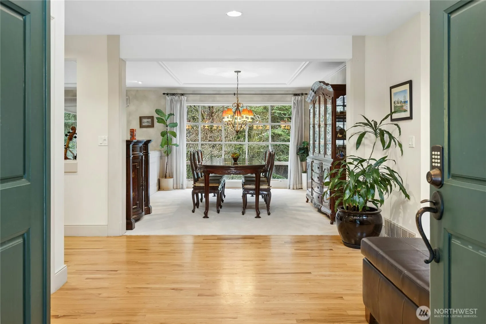 Sun-drenched lot in the SaddleBrook community of four estate homes, backing to a serene creek and offering exceptional privacy in a true Pacific Northwest setting. Lush grounds and a circular drive create a striking first impression. This beautifully appointed Northwest Traditional home features 4 bedrooms, a spacious bonus room, and 2.25 baths. Light-filled interiors, walls of windows, and a French door seamlessly connect indoor and outdoor living. Open living and dining spaces are ideal for entertaining, highlighted by an elegant gas fireplace. The kitchen features a 5-burner gas range, double oven, island, and breakfast nook opening to a 690 sq ft Trex deck—perfect for outdoor dining. The family room, adjacent to the breakfast nook, includes built-ins and a second fireplace, creating a warm and functional gathering space. A main-floor office adds flexibility for work or guests. The main-level primary suite features a walk-in closet, fireplace, spa-like bath with heated floors, and a private deck. Upstairs offers a bonus loft, 3 bedrooms, a full bath, and storage. Large, level backyard with beautiful landscaping. 3-car garage with EV charger. Great location near top schools, Bellevue, Kirkland, and Bridle Trails. Welcome home.