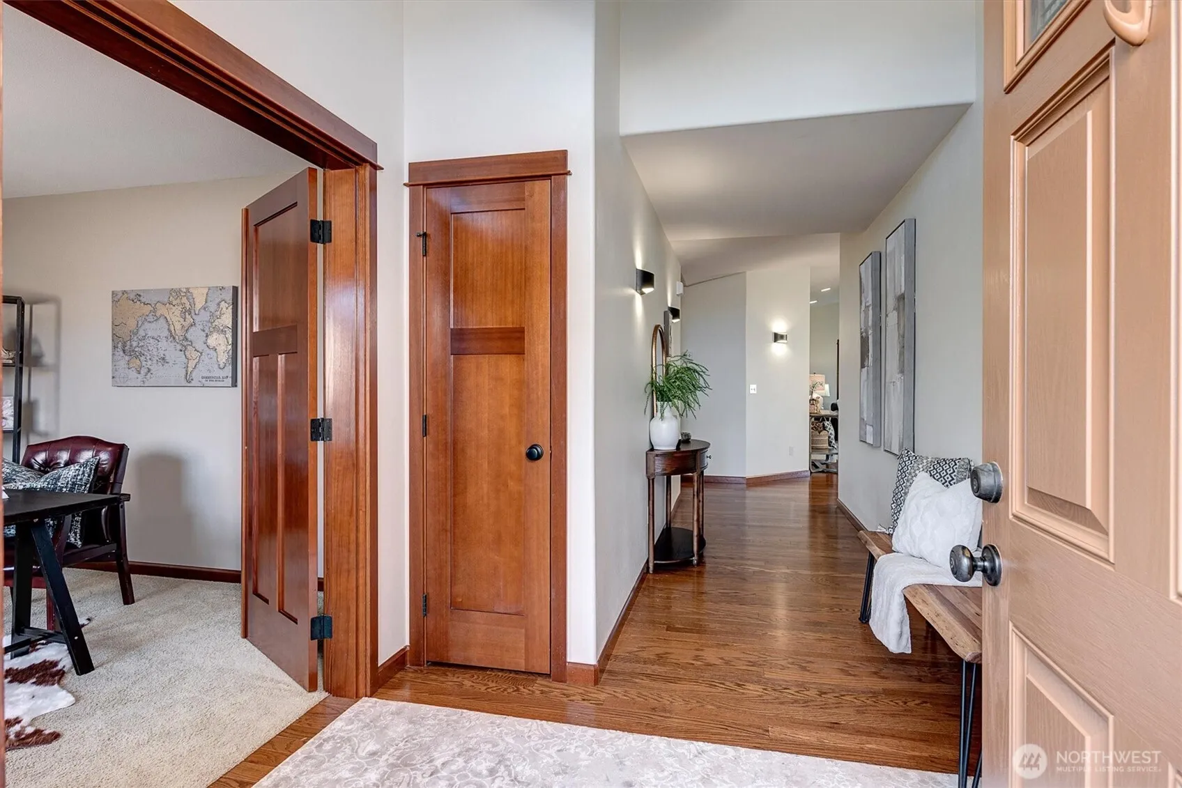 A rare opportunity to own a newer-built, recently updated true single-level rambler that seemlessly blends style and comfort. An open-concept layout enhances both entertaining and everyday living, offering a natural flow between spaces. The gas fireplace creates year-round warmth and ambiance. The kitchen features granite countertops, a spacious center island and a new LG SS appliance suite including a microwave, refridgerator, oven w/air fry & convection options and dishwasher. The primary suite offers a private en-suite bath complete with a soaking tub, Two additional bedrooms are thoughtfully arranged on a single level with no interior stairs for effortless living. Just off the entry, a dedicated office or bonus room adds flexibility. A rare 3-car garage provides abundant parking and storage. Recent updates include fresh interior and exterior paint, along with energy-efficient solar panels, skylights that bring in natural light, and stylish updated sconce lighting throughout the hallways. This home is ideally positioned adjacent to a private spacious community lawn, perfect for large gatherings and entertainment. A spacious workshop and an additional storage shed. Covered outdoor areas provide the perfect setting for BBQ’s, as well as a firepit for summer nights or year-round enjoyment. Just minutes from Mill Creek shopping and amenities. EZ access to I-5 & I-405 ensures seamless commuting and connectivity!