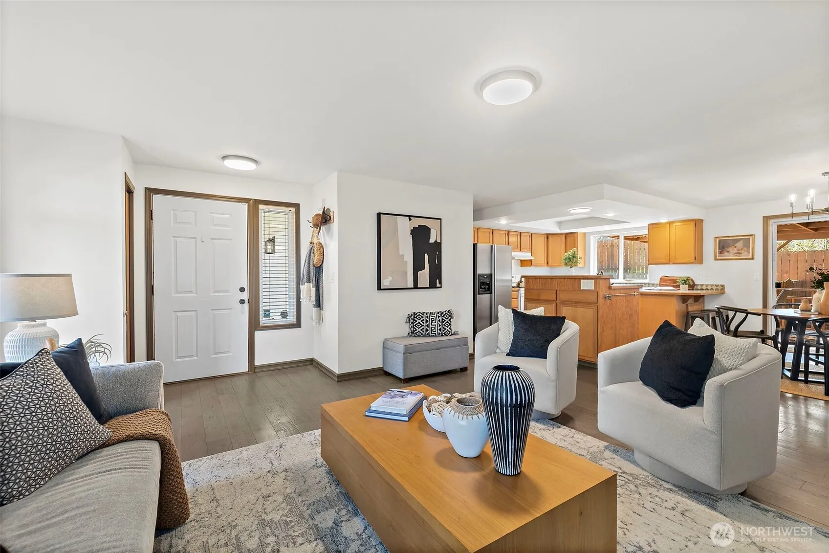 Experience refined single level living in this lovely 3-bedroom, 2-bath rambler, ideally situated on a flat, private corner lot complete with a shed. Freshly painted throughout, the home showcases an airy open-concept layout filled with natural light, creating a seamless flow for both everyday living and effortless entertaining. Step outside to a spacious covered deck—perfect for year-round gatherings or peaceful moments of relaxation—offering a true indoor-outdoor lifestyle. Thoughtful updates, including a newer roof, garage door, furnace, and water heater, provide comfort and peace of mind for years to come. The spacious 462 sqft garage offers exceptional versatility, ideal for multiple vehicles, abundant storage, or a custom workshop. Tucked away in a quiet, secluded setting, this property delivers a rare sense of privacy while remaining conveniently located, with View Ridge Elementary just beyond the backyard. Blending convenience and functionality this lovely home presents a rare opportunity to enjoy living in a desirable setting.