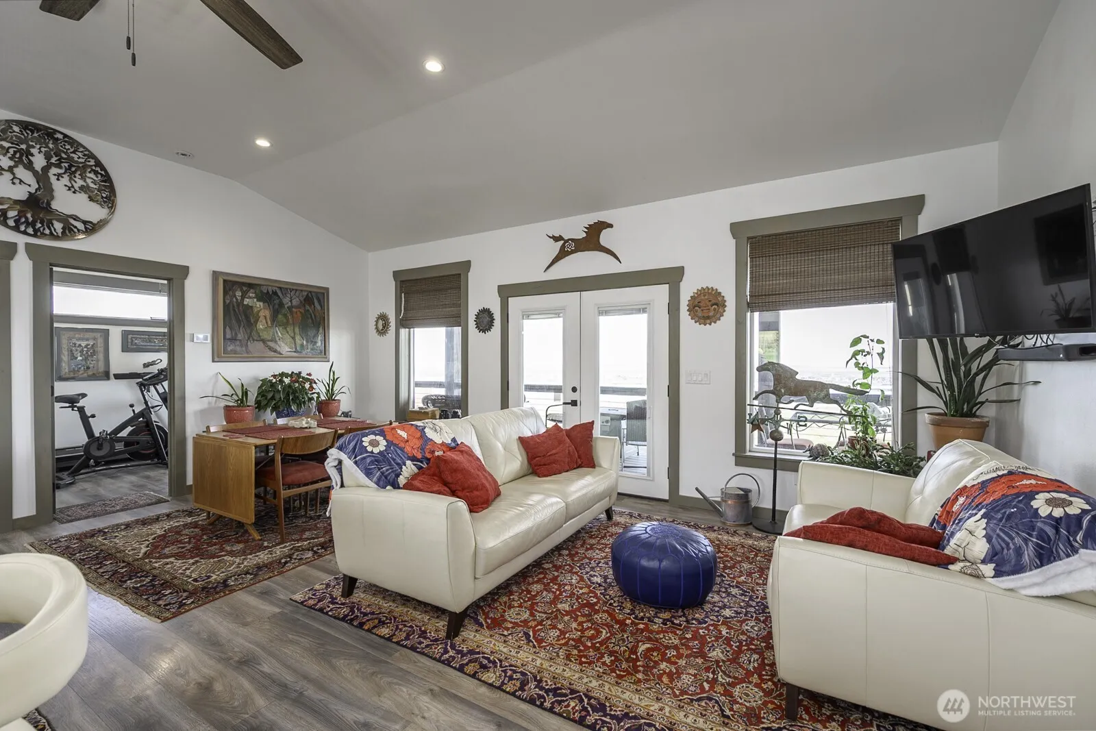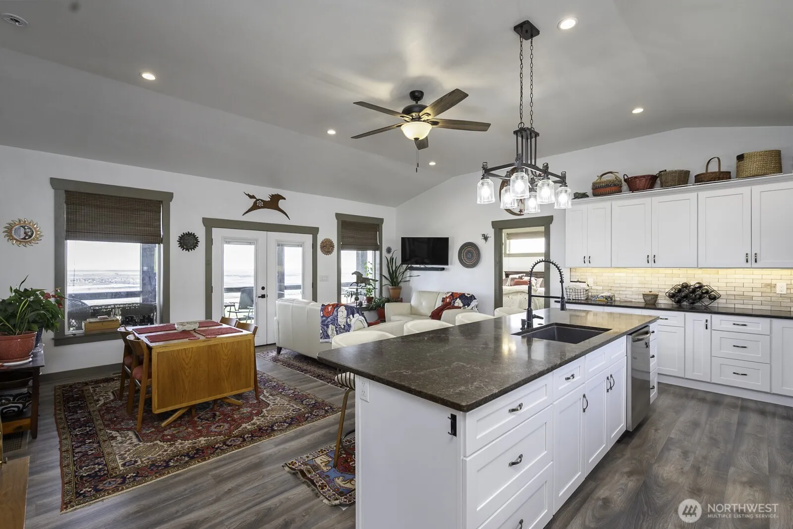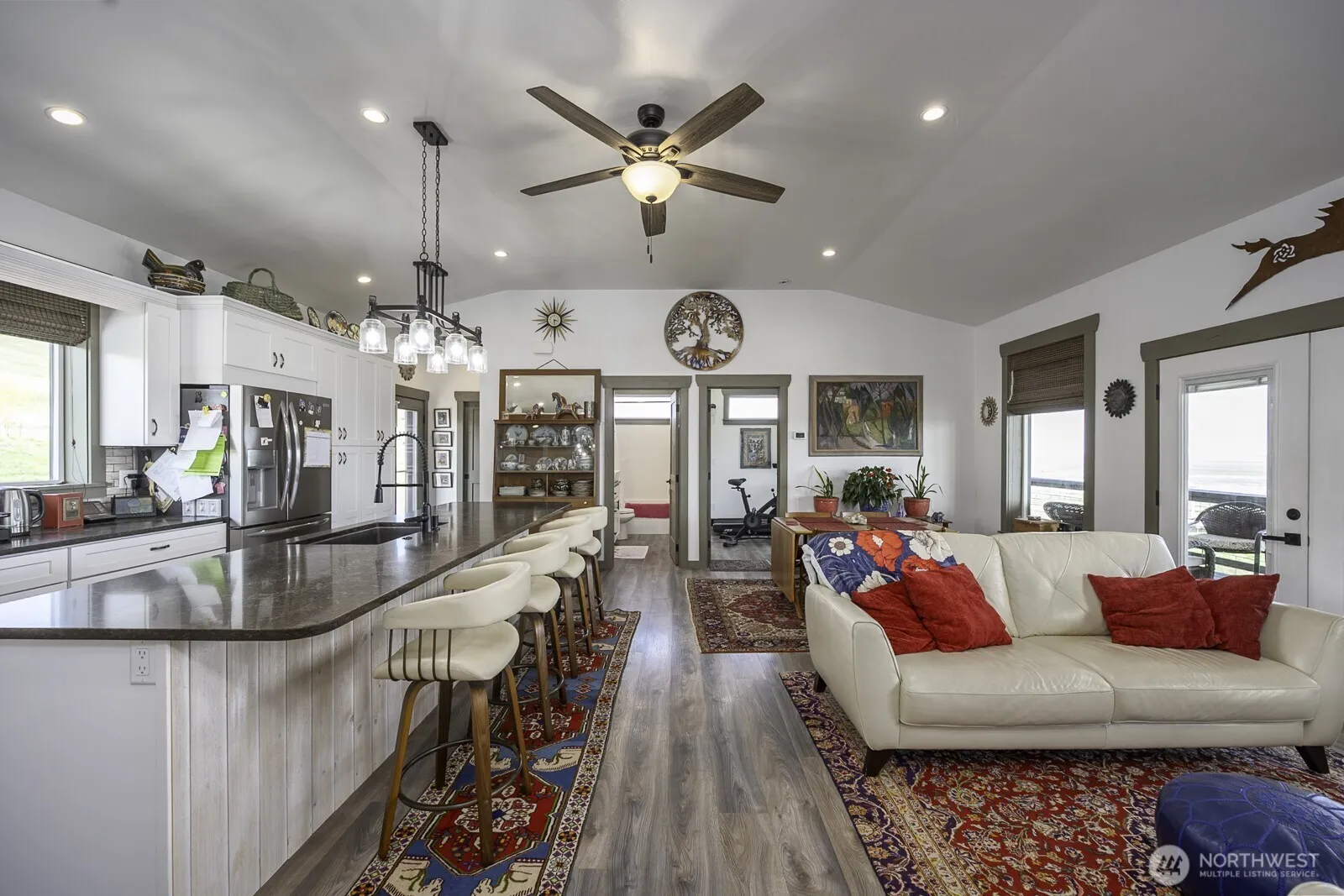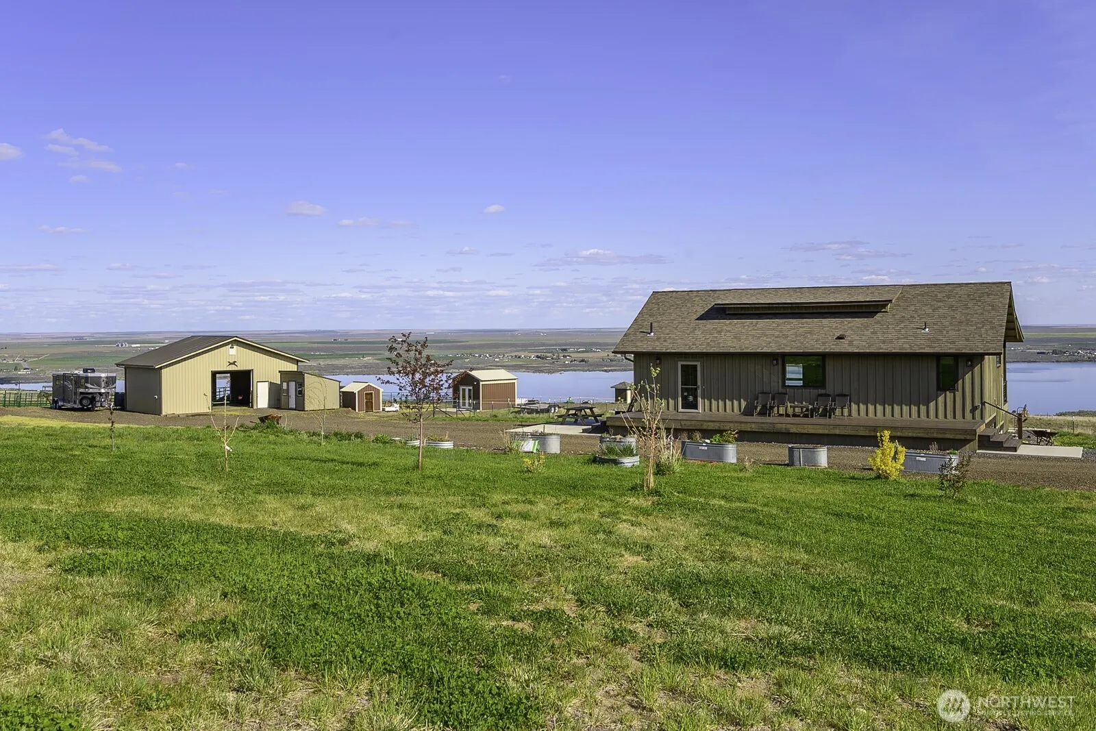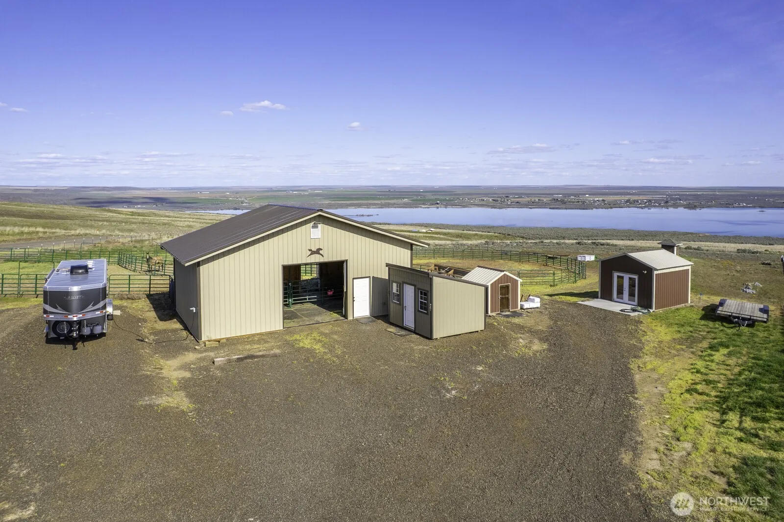 Beautifully positioned on 20 fully fenced acres with sweeping views of Banks Lake, this 2-bed, 2-bath home offers comfort, privacy, and exceptional country living. The spacious kitchen features a large island with double sink, & soft-close cabinetry. The primary suite includes double sinks and a walk-in shower. Enjoy outdoor living on the expansive deck with steps leading to a concrete patio—perfect for relaxing or entertaining while taking in the panoramic scenery. Property includes an insulated shop with 3 stalls and 200-amp service. The barn features a concrete floor with rubber matting, 100-amp service, RV hookups, and a separate tack room. Currently used as a barn but easily adaptable as an additional shop. A second RV hookup with water and sewer adds versatility for guests or extended stays! Lots of trees enhance the acreage. Ideal for horse enthusiasts or anyone seeking peaceful country living with room to grow.