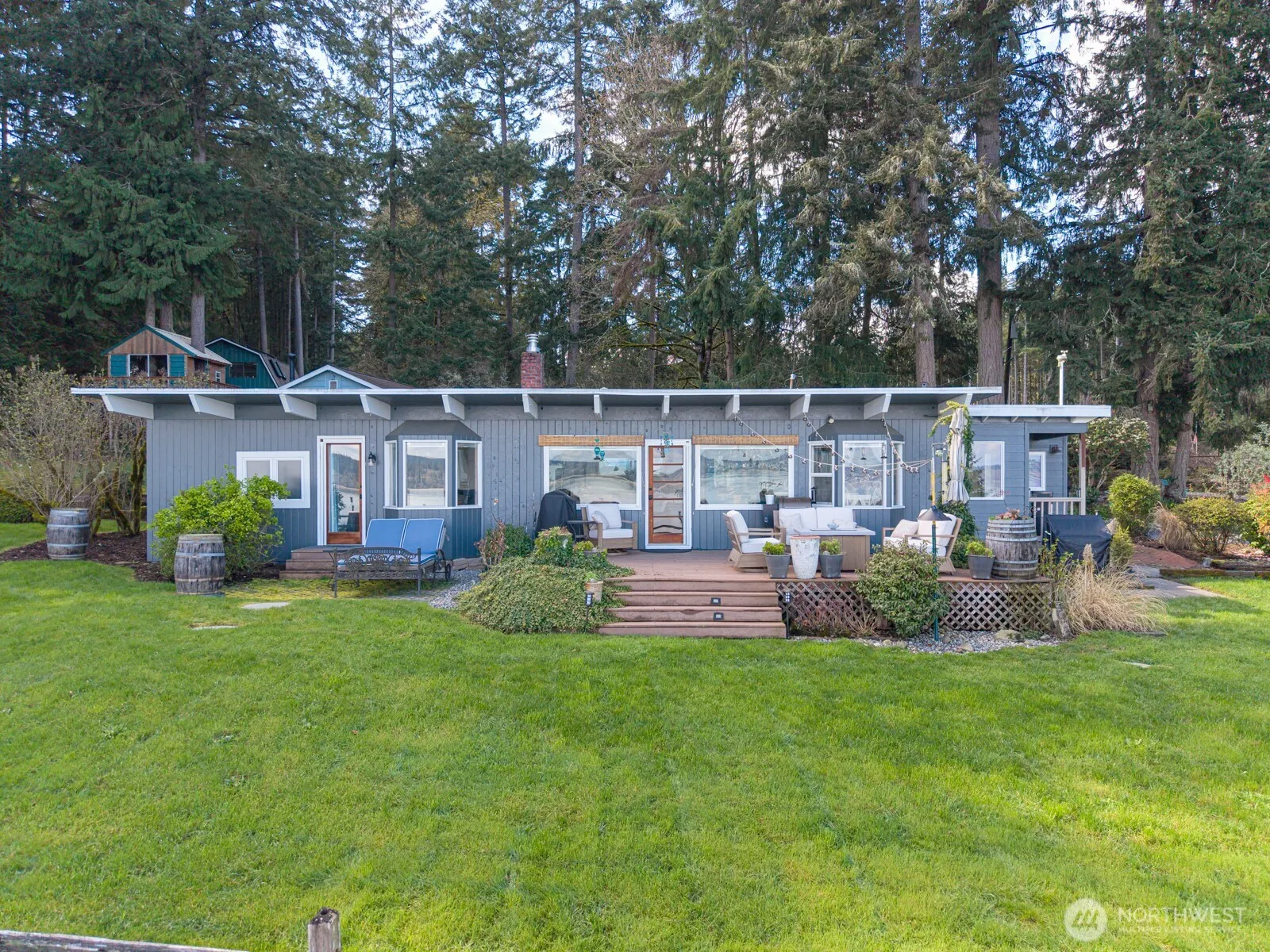Unobstructed views of Mount Rainier over Puget Sound with stunning sunrises—set on private acreage offering seclusion—surrounded by nature rather than neighboring homes. Just a short walk to the ferry. The main home features hardwood floors, shiplap walls, and beamed ceilings. The living room features a fireplace and connects to the dining area – and opens to the view deck. The primary suite hosts two walk-in closets and en-suite bath with soaking tub and separate shower. The barn features a finished loft with kitchenette and Juliet-style balcony—an inspiring, private space with beautiful views, ideal for a studio, office, or creative retreat—along with a partial bath and two horse stalls. The detached guest home features an open living space with wood stove, kitchen, and full bath—well-suited for guests or potential vacation rental use. A charming, rustic treehouse adds a whimsical touch.