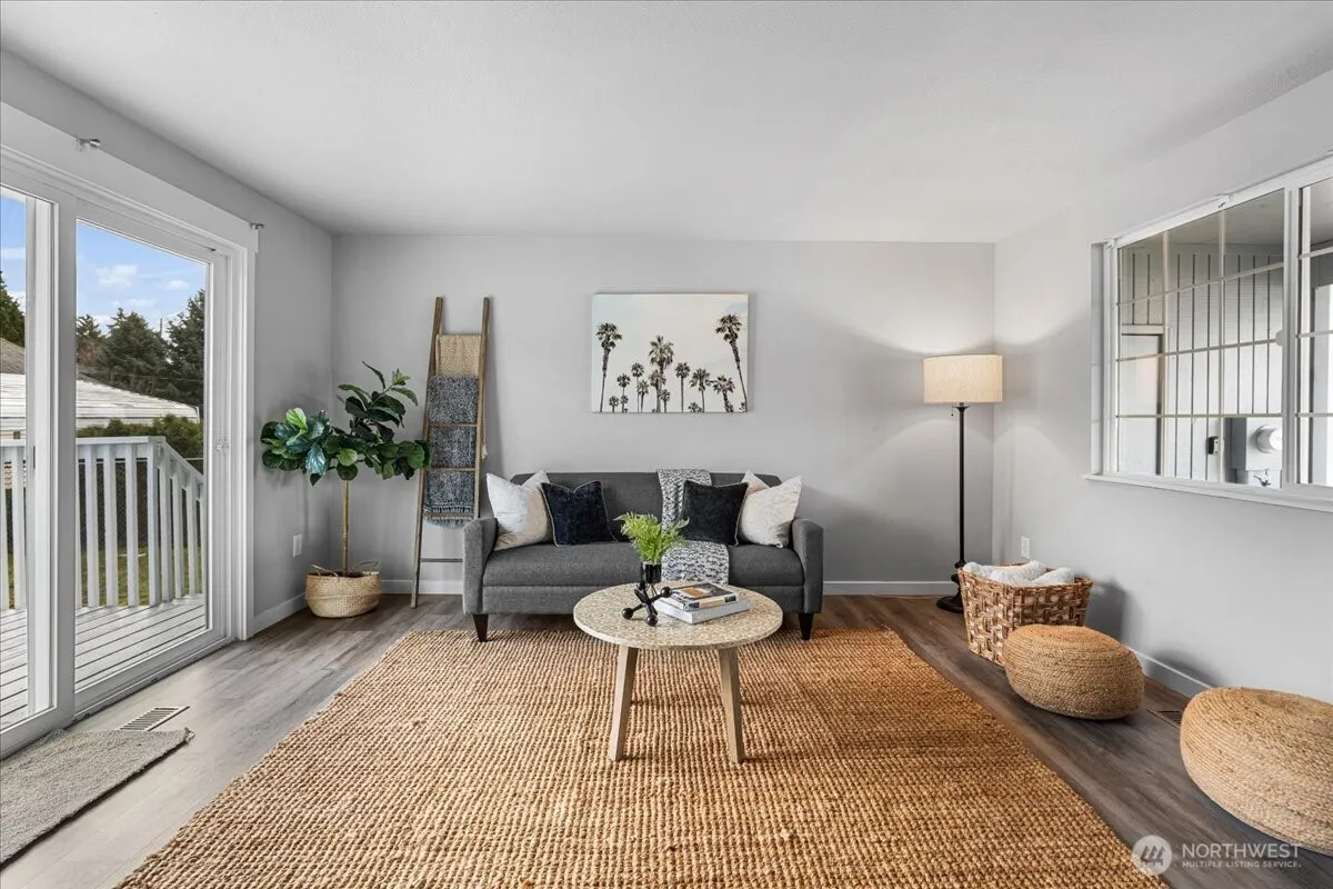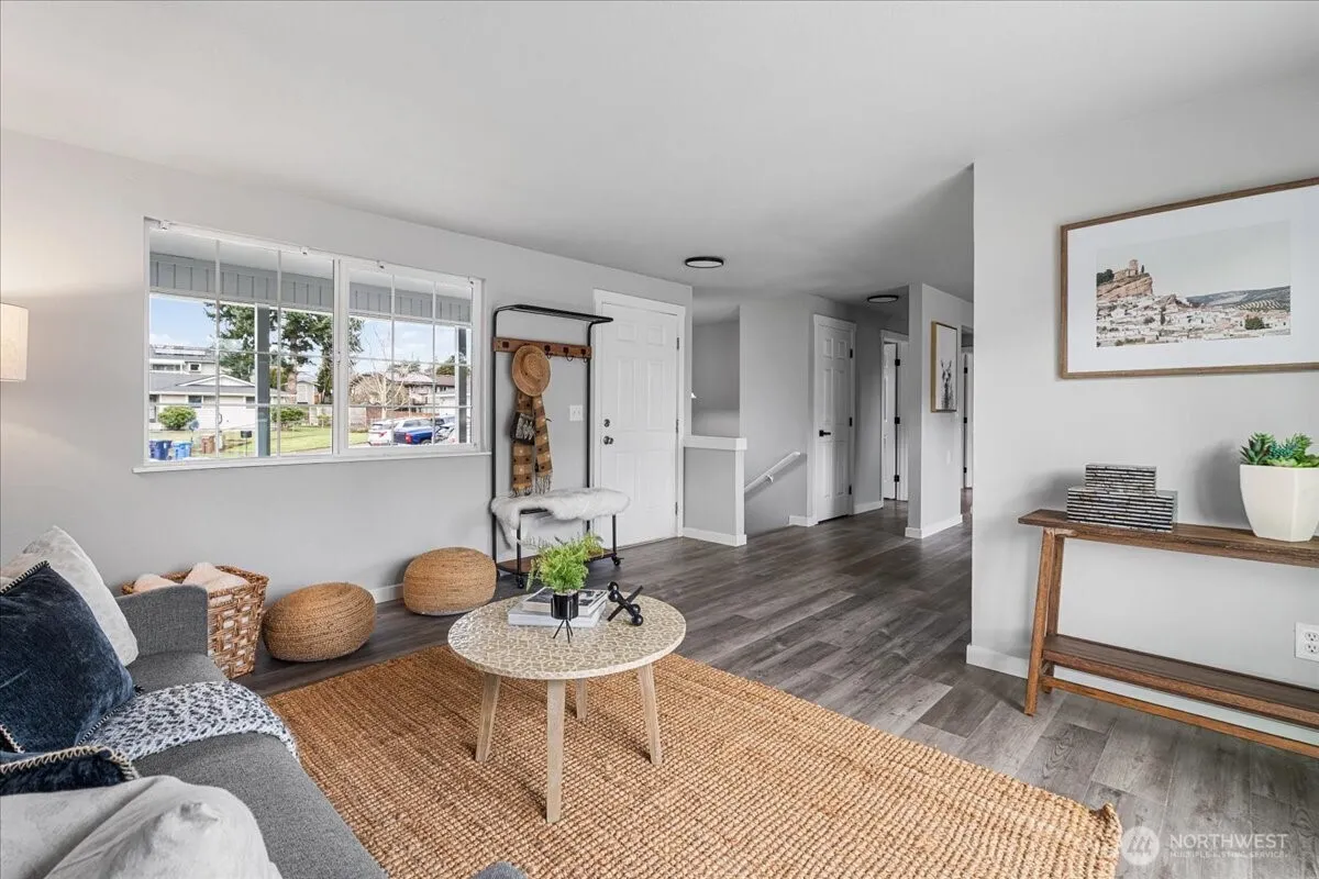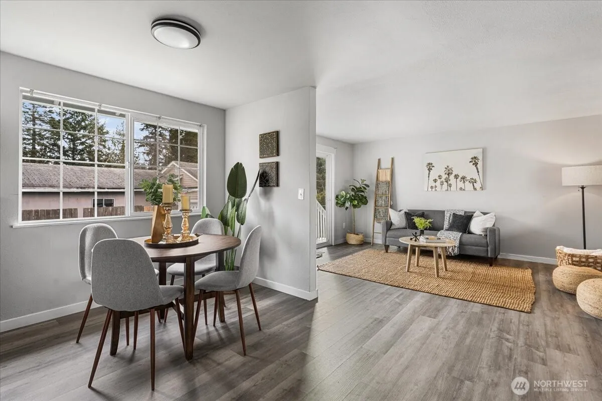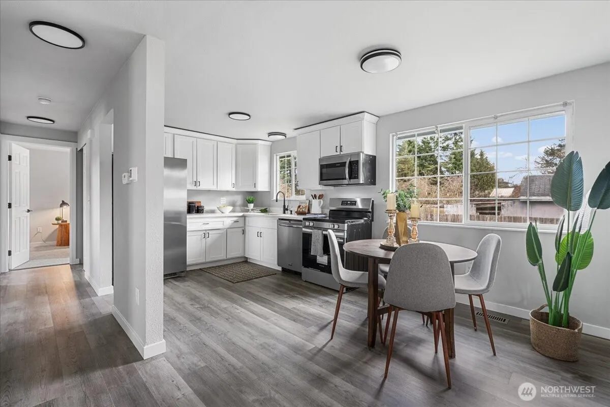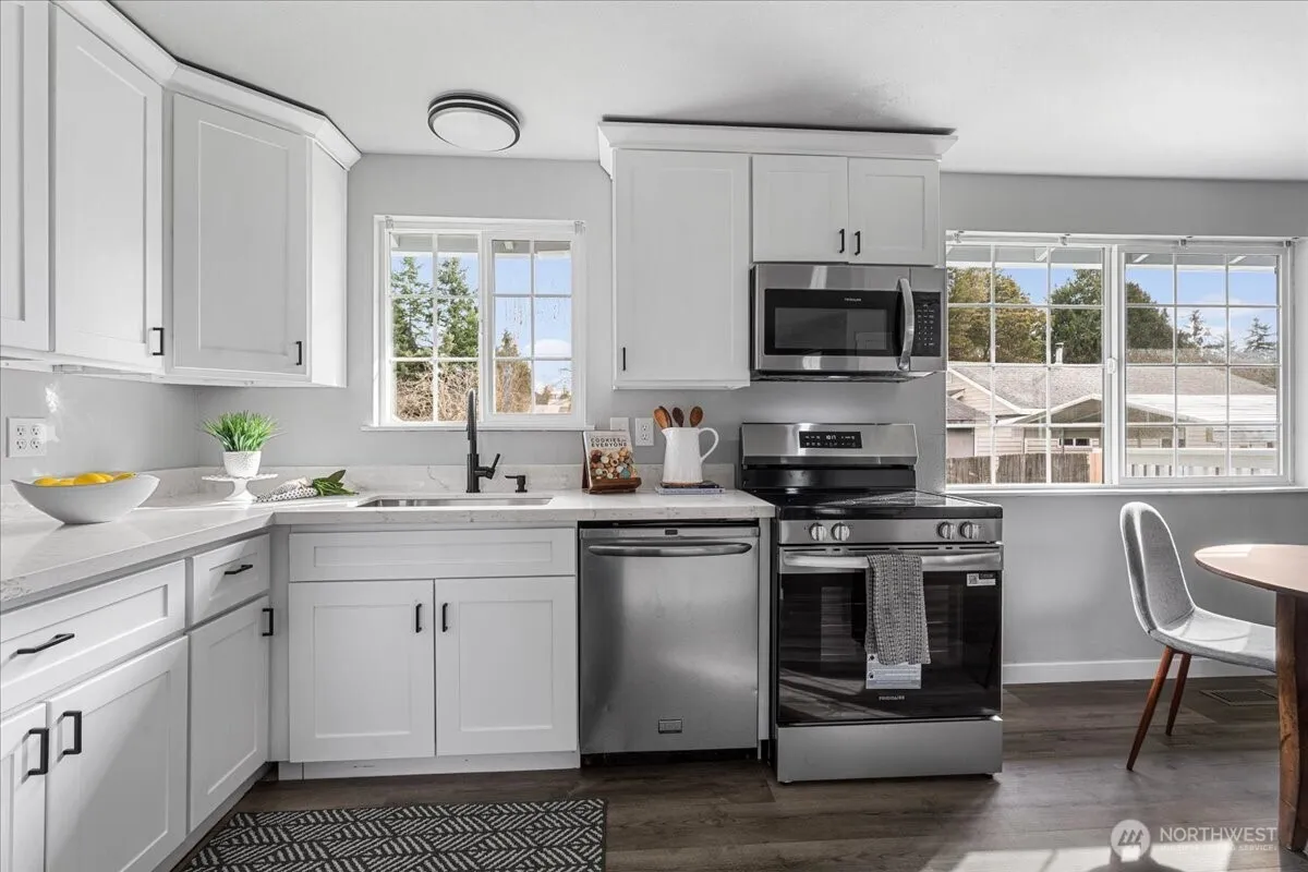 Enjoy easy living in this beautifully refreshed home featuring a bright, open layout and thoughtful updates throughout. This 5-bedroom, 2-bathroom property offers inviting living spaces with updated flooring, abundant natural light, and a seamless flow between the living, dining, and kitchen areas. The kitchen has been updated with crisp white cabinetry, solid surface countertops, stainless steel appliances, and a clean, modern look that makes the space feel both functional and welcoming. Large windows in the main living areas bring in great natural light, while the layout offers flexibility for both everyday living and entertainment. The home also includes a spacious lower-level bonus area, ideal for a second living space, media room, home office, or playroom. Both bathrooms have been refreshed, including a full bath with subway tile surround. A dedicated laundry room adds convenience, while the attached garage provides additional storage and parking. Step outside to enjoy the large, fully fenced backyard with a deck and storage shed, offering plenty of room to relax, garden, or entertain. Conveniently located near shopping, dining, schools, and major commuter routes, this home offers a great combination of comfort, space, and functionality.