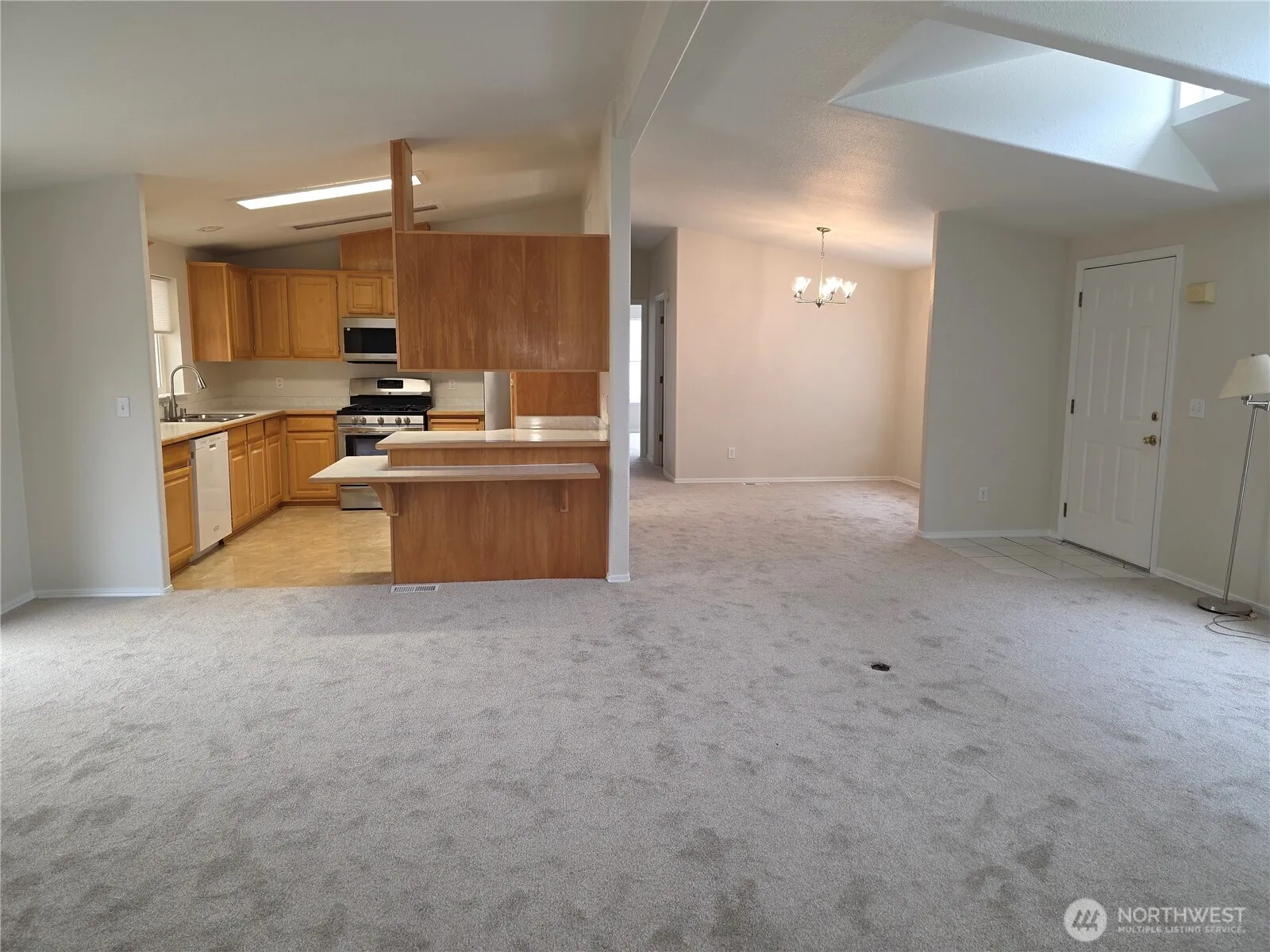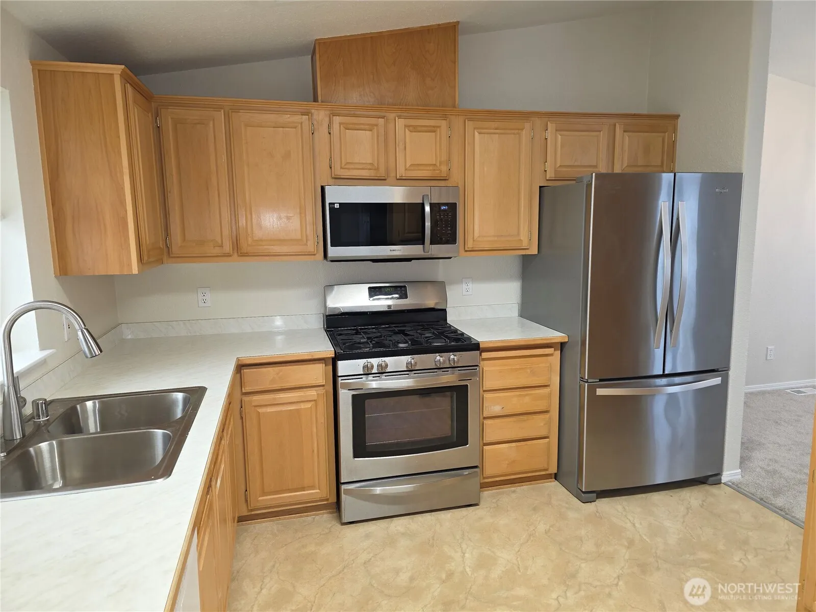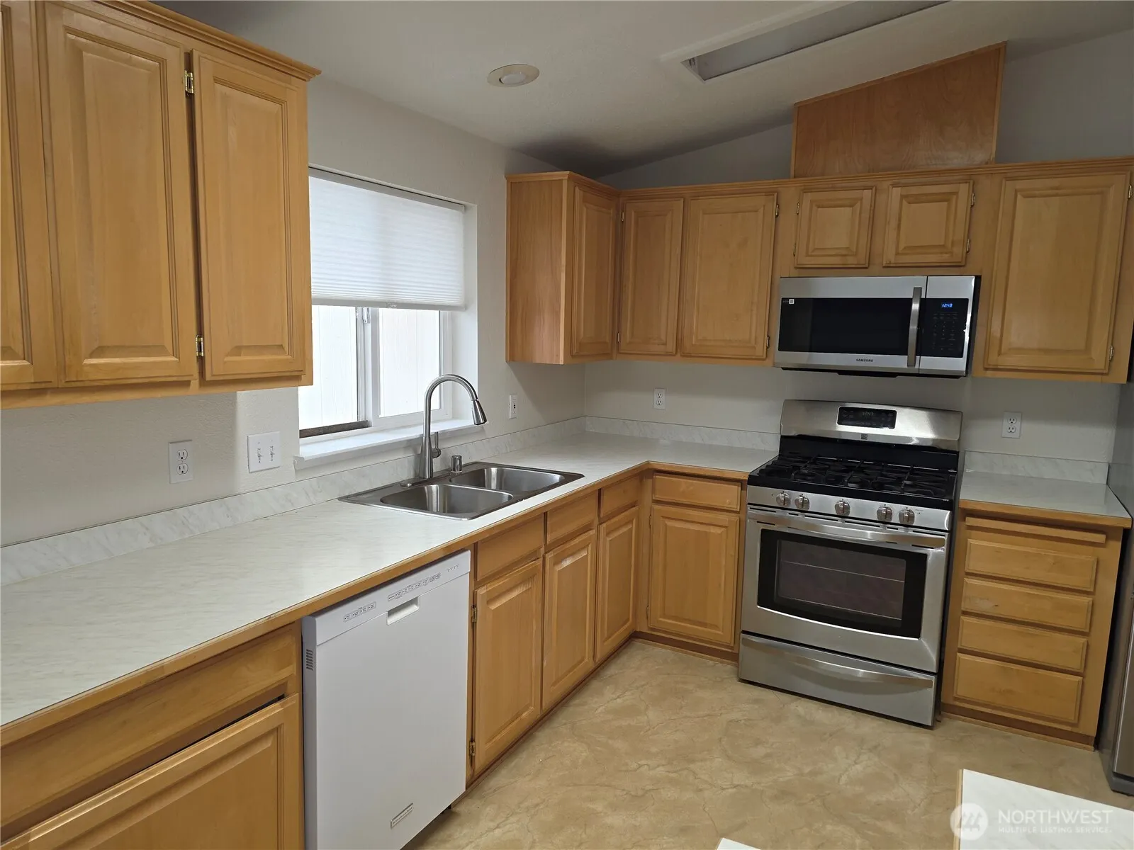 Welcome to Lake Wilderness Villa, a premier 55+ gated community in Maple Valley. This beautifully maintained neighborhood offers an exceptional blend of comfort, style, and an active social lifestyle, with convenient access to local shopping, the Lake Wilderness trails and much more. We are pleased to present this updated and bright three-bedroom, two-bathroom home. The interior features an open great room concept with cathedral ceilings, skylights, and a dedicated dining area. The spacious, bright kitchen is equipped with a breakfast bar, ample counter space, and all necessary appliances. In the primary suite, you will find a walk-in closet, double vanities, a Jacuzzi jetted soaking tub, and a separate shower. For added convenience, the home includes forced-air gas heat and A/C, a utility room with built-in storage, and a finished, oversized two-car garage (extra long). Outside, the property features a covered patio with and a fenced yard and dedicated garden space. As a resident, you will also have full access to the community clubhouse, which includes a library, pool tables, a putting green, and a covered BBQ area. Plenty of guest parking. RV parking is available as well. This Home is move-in ready.