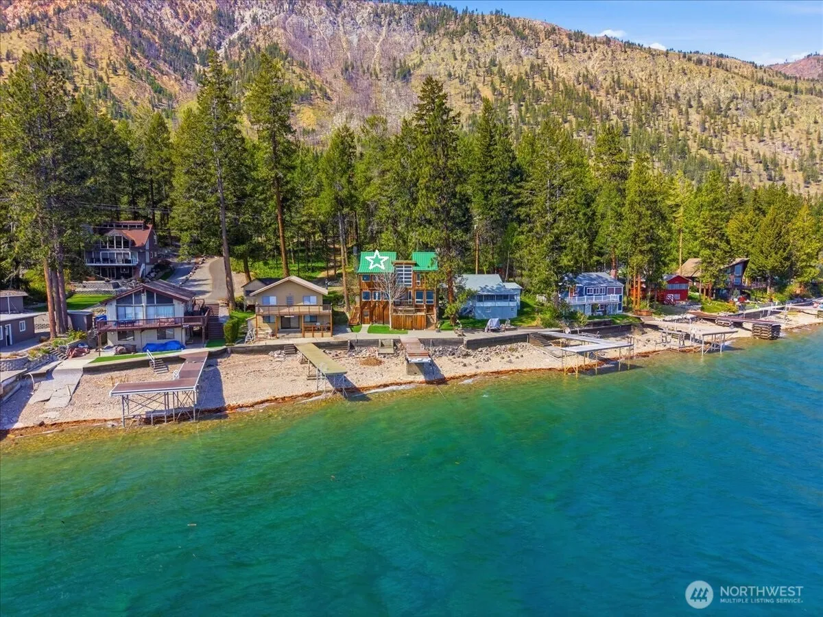 Quintessential South Shore Lake Chelan waterfront retreat with rare second parcel and charming guest cabin! Enjoy 50 ft of prime waterfront with private dock, bulkhead, and easy lake access via dock and steps into the water. The main home and guest cabin each offer 2 bedrooms, creating ideal space for hosting and multi-generational enjoyment. Architecturally pleasing design features abundant natural light, expansive lake-facing windows, and a cozy wood-burning fireplace. Outdoor living shines with a spacious patio, multiple deck areas, and plenty of parking. Set on .28 acres, the property is tucked among mature pine trees, offering privacy and a true getaway feel. Domestic water is sourced from Lake Chelan. Well maintained with a partially finished basement providing generous storage. A treasured property held in the same family for approximately 80 years—this is a rare opportunity to own a special South Shore legacy property. (Property addresses are 12632(Main Home) & 12624(Back Cabin) S Lakeshore Rd). Most Furniture & Furnishings are staying with home minus some excluded items.
