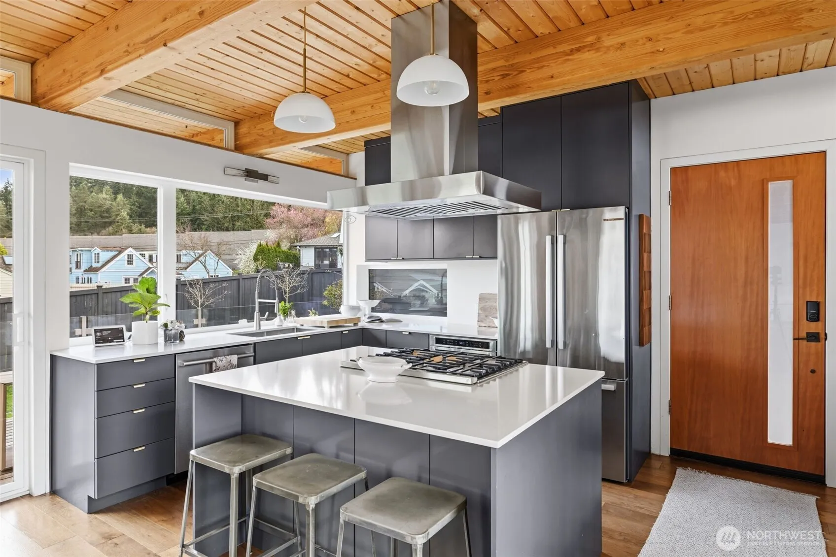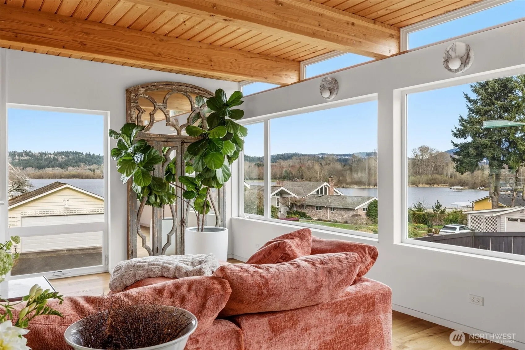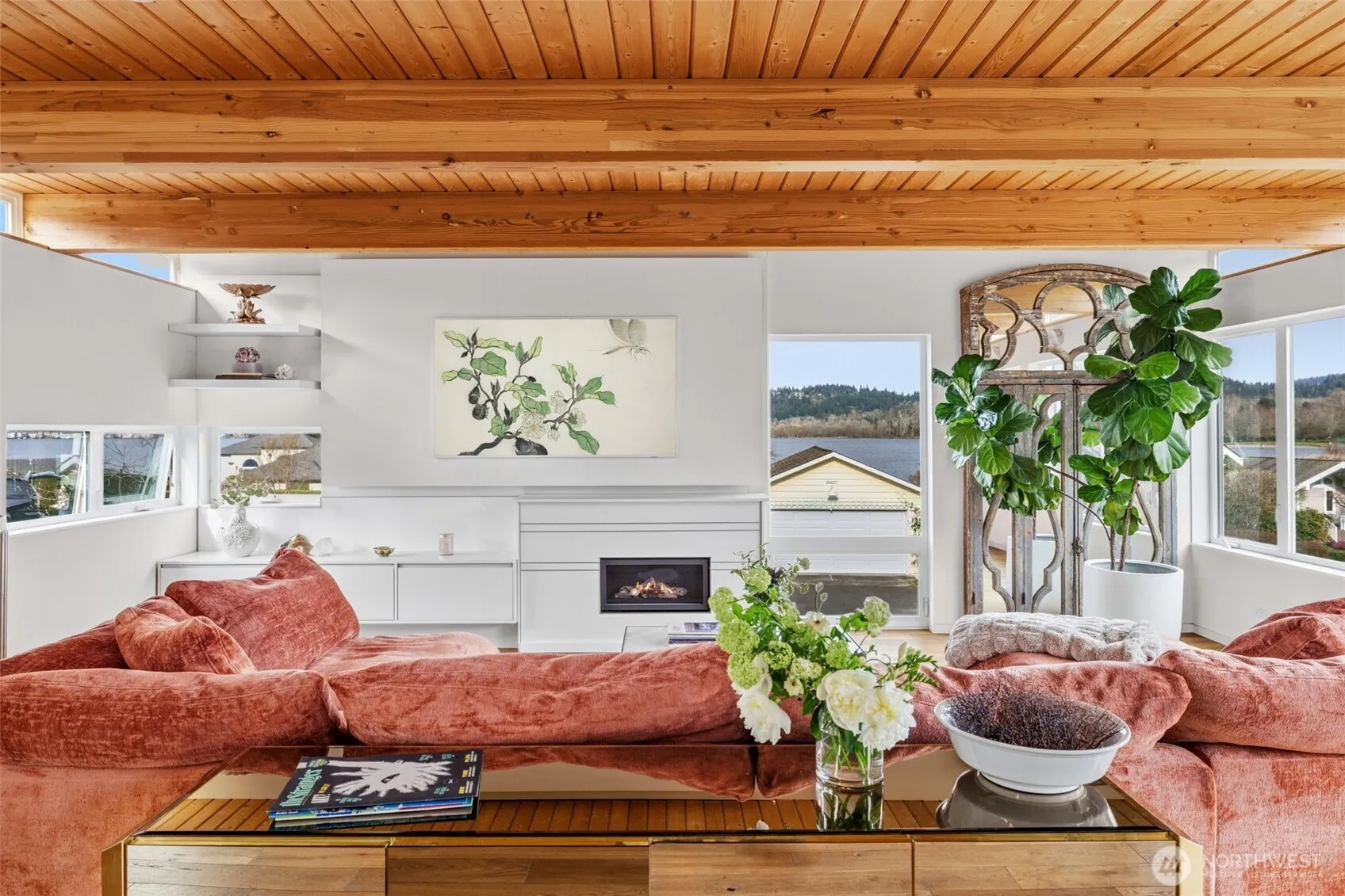 Welcome to Sammamish View Retreat, a serene, light-filled modern home overlooking Lake Sammamish with shared beach and moorage! Expansive picture windows and walls of glass capture breathtaking water and mountain views while filling the home with natural light year-round, creating a warm, uplifting atmosphere. Designed with a stunning great room layout, the home offers open, flowing living with clean lines, warm wood accents, and seamless indoor-outdoor connection. A large glass door opens to a covered view deck—perfect for enjoying morning sunrises, evening sunsets, and peaceful moments surrounded by nature. The thoughtfully designed layout lives larger than its footprint, with private bedroom spaces and additional living areas that open directly to beautifully landscaped outdoor settings. Multiple patios and a fire pit create inviting spaces to relax and unwind. Extensive, thoughtfully curated landscaping. This home truly lives like a retreat—offering the feel of a vacation getaway in every season. Enjoy summer days on the water with private beach access, moorage, paddleboarding, or simply taking in the views. In cooler months, the home remains cozy and connected to the outdoors, with radiant heat and abundant natural light throughout. High-end finishes include stone surfaces, custom tile, and a finished garage with heat/AC for flexible use. Ideally located just minutes to Issaquah, and an easy commute to Seattle, while still enjoying a quiet, nature-filled setting.