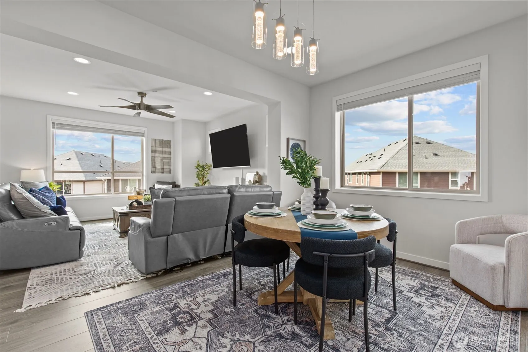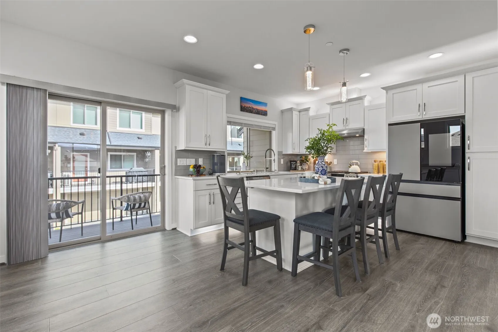 Exceptional townhome in the Westridge community at Issaquah Highlands offering abundant natural light and flexible living across four levels. Open-concept main floor features a gourmet kitchen with quartz counters, stainless appliances, and seamless flow to dining, living, and private deck. Upper level includes spacious primary suite with walk-in closet and two additional bedrooms. Top-floor bonus room opens to a west-facing rooftop deck with sunset views, Olympic Mountains on clear days, and prominent views of Lake Sammamish, along with additional outlooks toward the Cascade Range, Bellevue, and Issaquah, with the added bonus of viewing fireworks on the Fourth of July. Lower level provides private office or guest suite with en-suite bath and patio access. Double wall construction between units offers added sound separation, and fire sprinkler system throughout residence. Side-by-side two-car garage with storage. Convenient access to parks, shopping, dining, and I-90.