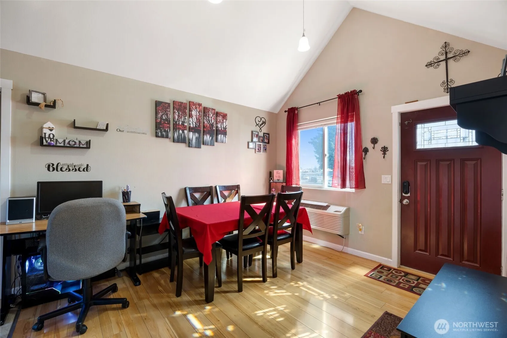 Charming 2-bedroom, one beautiful bath home featuring vaulted ceilings in the living room and kitchen, hardwood floors, and stainless steel appliances. The bathroom offers tiled floors and a tiled bathtub surround. A versatile 10×12 bonus room is perfect for an office, den, or hobby space. Situated on a spacious corner lot with fruit trees, garden space, and a shed and out building. Plenty of room for RV parking with convenient 50-amp power service. Move-in ready and full of charm.