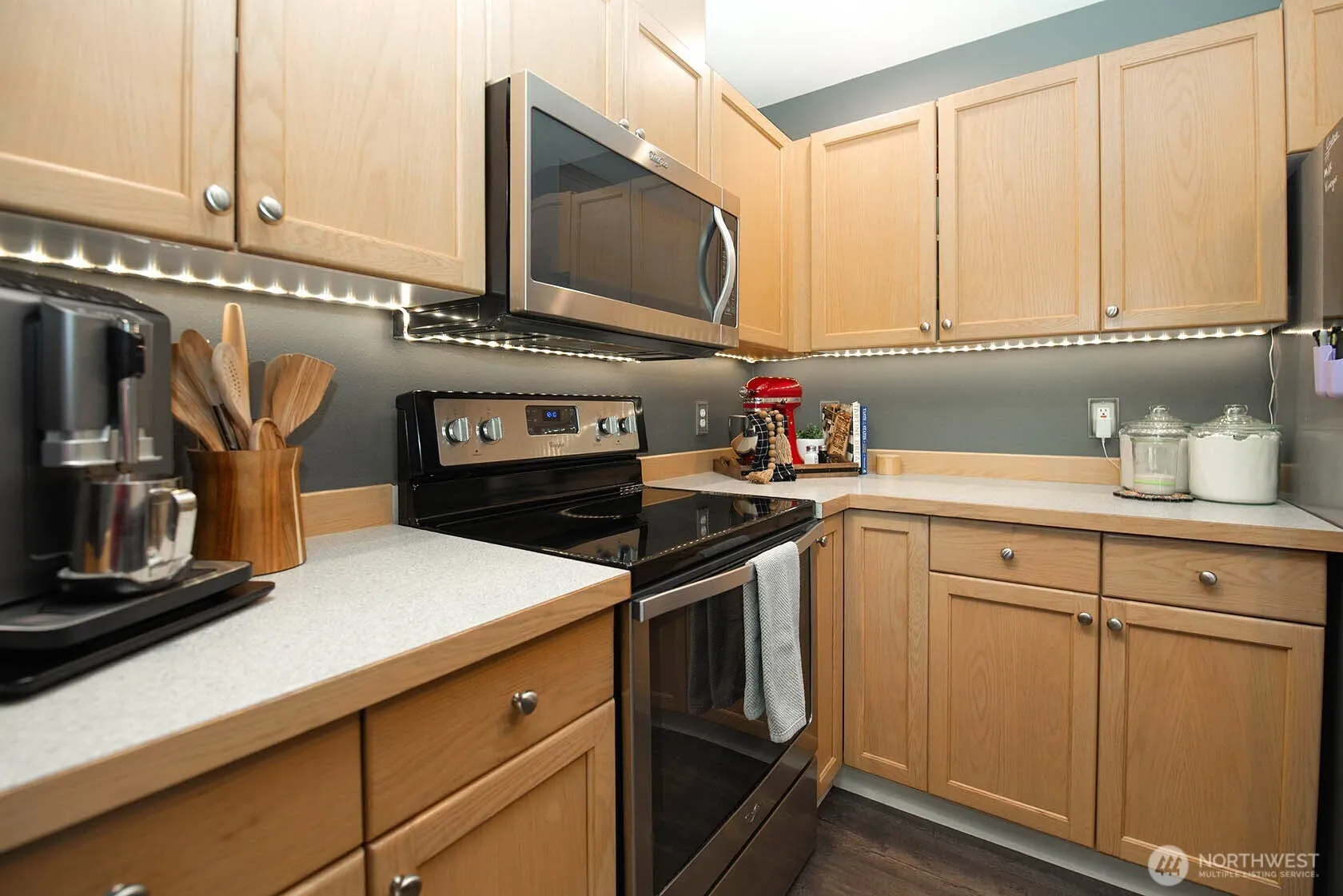 Welcome to this exceptionally maintained retreat with high end upgrades in the gated Village at Caspers Mill. This 3 bedroom, 2.5 bath townhouse style condo features new LVP flooring, carpeting, fresh paint, upgraded lighting, updated fixtures & a bright open layout centered around a cozy gas fireplace with a concrete mantle. The kitchen includes stainless steel appliances, a stainless steel sink with upgraded faucet, new ceiling cans, under the counter lighting & upgraded door hardware & electrical wall plates. Upstairs, enjoy a peaceful peek a boo view of Silver Lake. The private patio extends your living space with a tranquil fountain & a pond with steppingstones, perfect for morning coffee or unwinding at the end of the day. Walk 3 blocks to Emorys, explore 2 new playgrounds around the lake & enjoy the mile marked Silver Lake Loop Trail for walking, running & lakefront views. A bus stop sits just outside your back gate. Additional upgrades include an upgraded washer & dryer, a 65 gallon energy efficient hot water tank, a Wi Fi Genie garage opener & added fluorescent lighting in the garage. Community amenities include a clubhouse with gym, meeting room, BBQ area, pickleball & basketball court, playground, green spaces & a car wash station. Minutes to Interstate 5, shopping, dining, medical facilities & the Mill Creek Town Center.