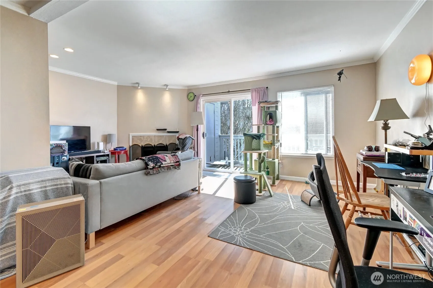 Remodeled condo featuring an open-concept layout connecting the kitchen, dining, and living areas—creating a bright and inviting space. Crown molding and recessed lighting add stylish touches throughout. Upstairs includes a spacious primary bedroom with walk-in closet and direct access to an upgraded bathroom featuring double sink vanities and dual shower heads. In-unit washer and dryer conveniently located upstairs. Updates include beautiful hardwood flooring and vinyl and fresh interior paint, giving the home a clean, modern feel. Ample storage with multiple interior closets plus two outdoor storage areas. Convenient location close to 99, i5 and grocery stores.
