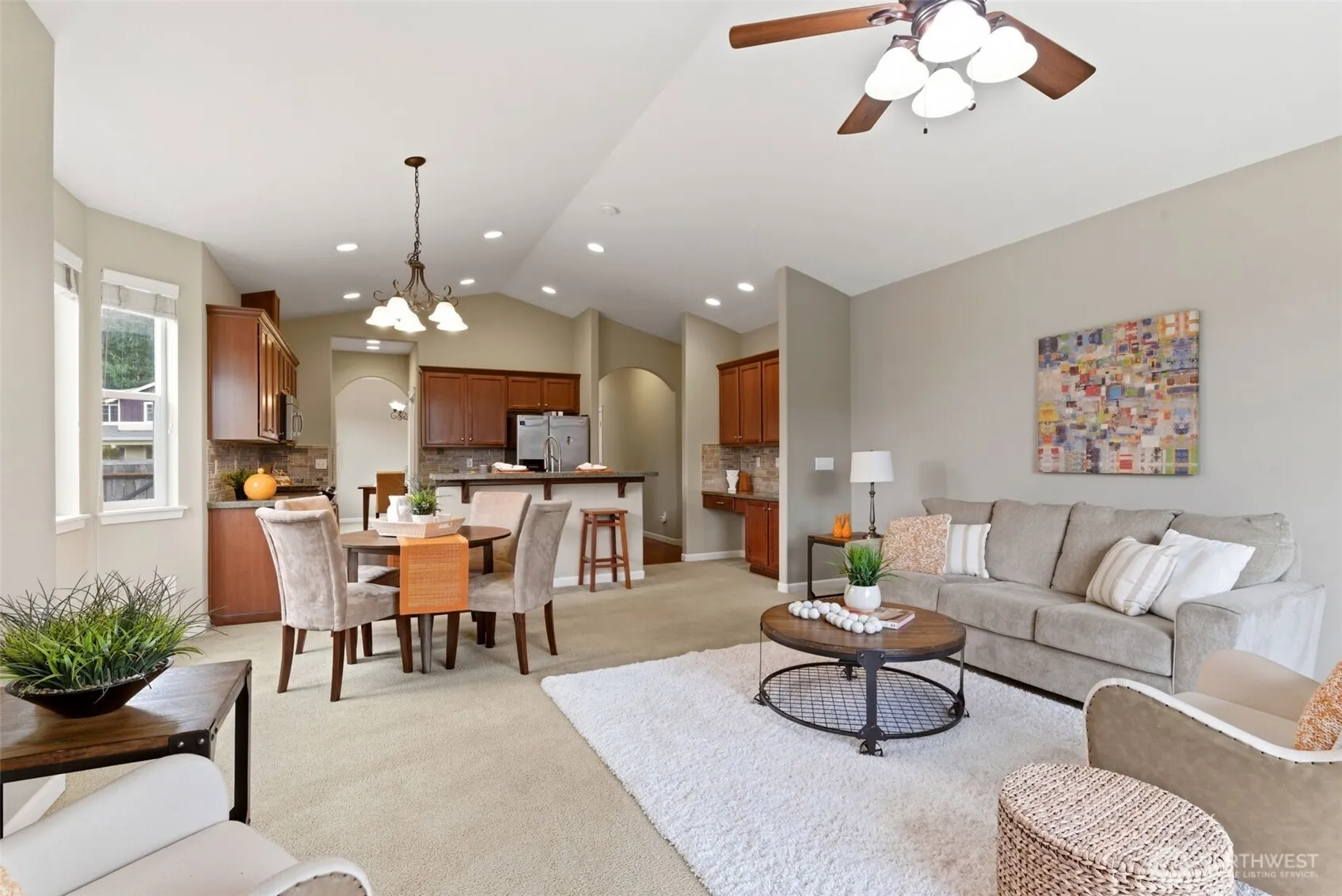 Large, coveted rambler floorplan in the quiet, gated community of Grand Firs. Open concept eat-in kitchen overlooks the living room area with vaulted ceiling and beautiful fireplace with seamless flow to the big, fully enclosed, irrigated backyard. Light and bright throughout the home with 3 generous bedrooms, including the primary with lovely attached primary en suite. The updated home boasts an additional 2 bedrooms, another full bathroom, and large laundry/utility space. 3 car garage, RV parking with paved pad, and oversized gazebo for entertaining all year round. 3 parks in the Grand Firs community for tons of extra space and extracurricular options! Perfect for snowbirds!