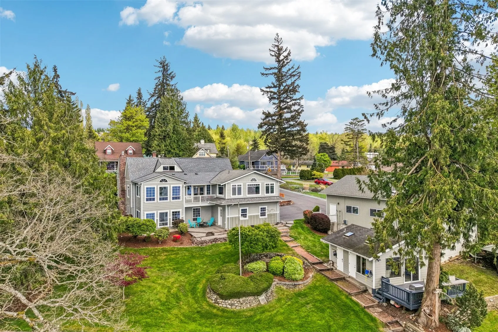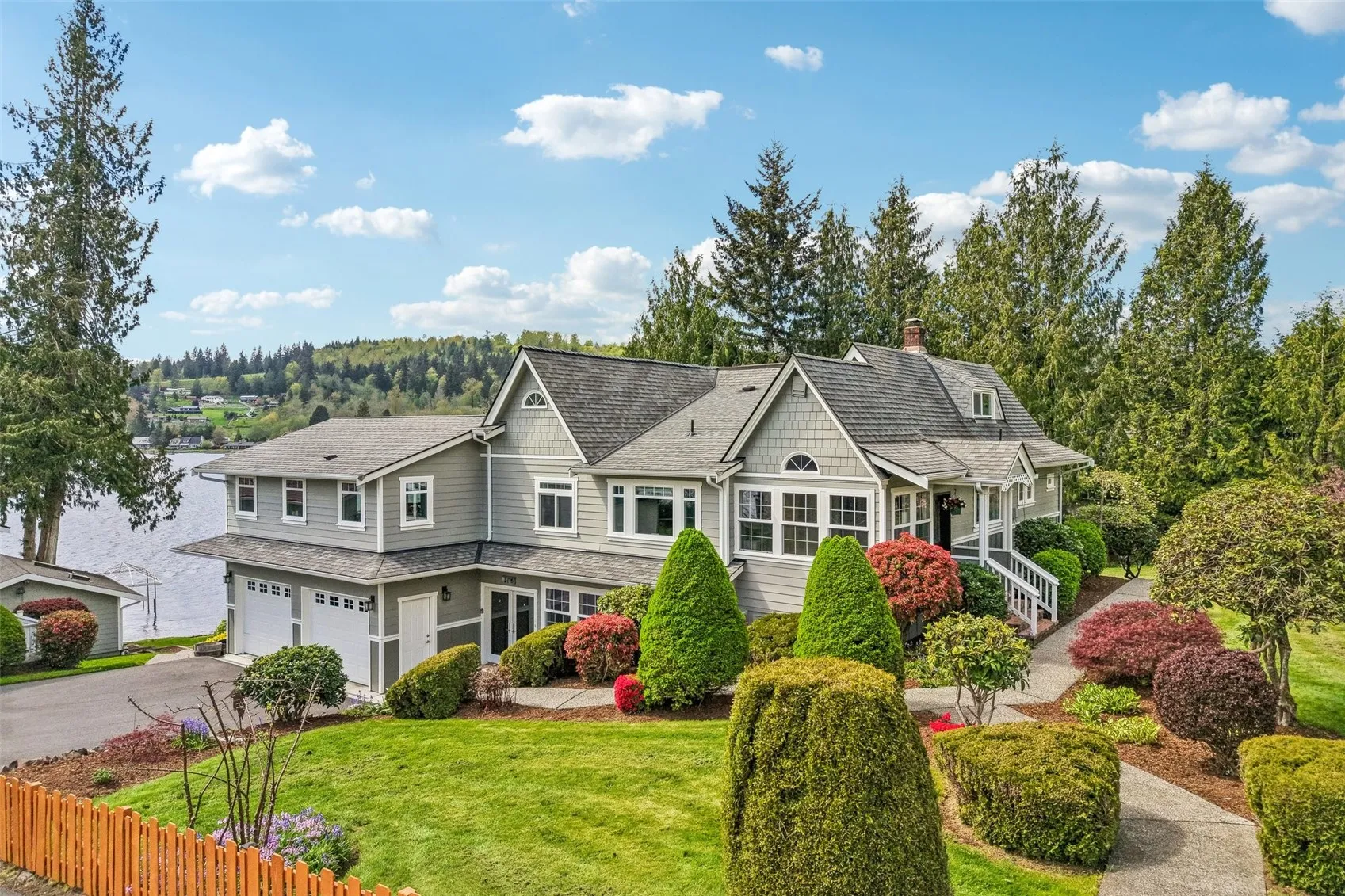Blue skies and lake days await at this exceptional Big Lake waterfront estate! Set on nearly one acre of low-bank shoreline with 198 feet of frontage on the sunny side of lake. This unique property blends timeless charm with effortless indoor-outdoor living. The historic 5bed/3bath home offers two separate living quarters—ideal for multi-generational living or potential rental income. A 40’x38′ shop provides abundant space for vehicles, boats, toys & storage. Plus attached two-car garage. At the water’s edge, a charming lake house/gazebo with its own wood burning fireplace, kitchenette & 3/4 bathroom is perfect for lake side entertaining. Enjoy the park-like landscape, expansive lawn, private EZ Dock, boat lift, 2 jet-ski ramps, & slide—ready for endless lake enjoyment! This classic Cape Cod-style home offers gorgeous year-round views. The open kitchen with granite counters flows into the main living area. The main-level primary suite features a fireplace, spa inspired bath with heated tile floors, oversized jacuzzi, walk-in shower, & adjoining flex space for an office/gym/retreat that overlooks the lake. The lower level offers a second kitchen, living room with gas fireplace, 2 bedrooms full bath, & laundry. Historic (floating) Honeymoon Cabin on the shore could be restored into your vision. Solar (owned) panels add energy efficiency $0 to low power bills! Home is wired for sound system, hot-tub & back up generator. Ideally located between Seattle & Vancouver, BC.