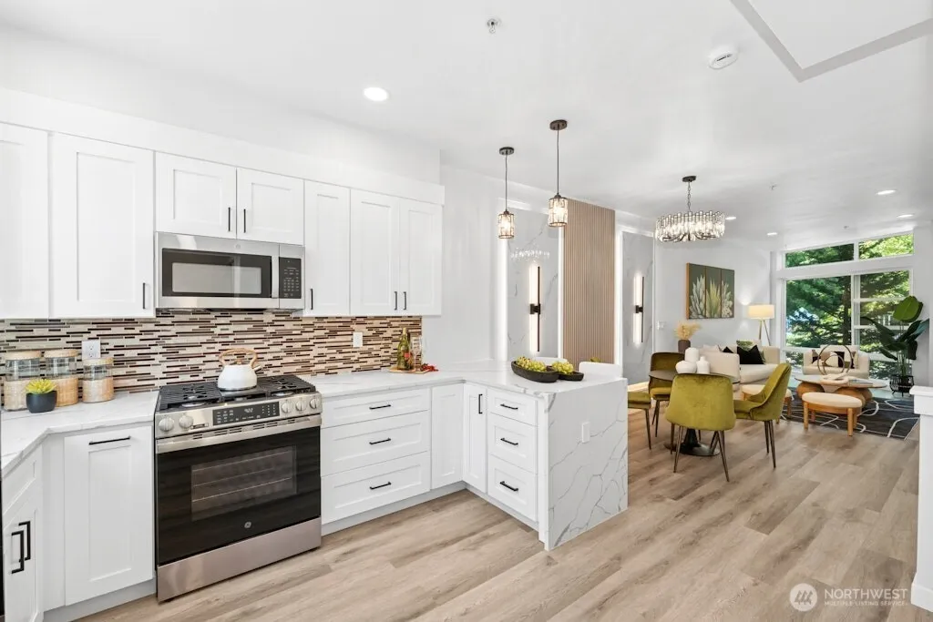 Excellent location and modern design in this beautifully remodeled home at Element. This contemporary residence features soaring ceilings, expansive windows, and sleek finishes throughout. The open-concept main level includes a stylish, fully updated kitchen with new appliances. Upstairs offers two spacious bedrooms and two bathrooms. The vaulted third-level loft with large windows is perfect for a home office, media room, or flex space. Like-new water heater, plus washer and dryer included. Close to Amazon, Meta, Microsoft, Google, Redmond Town Center, Marymoor Park, and more. Easy access to I-405 and SR-520. No rental cap and low HOA dues. Staging has been removed!