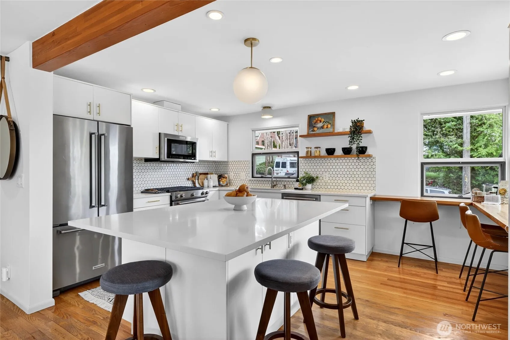 Tucked into the unique and highly sought-after enclave of Pritchard Island, this beautifully remodeled midcentury home offers an exceptional blend of privacy, natural surroundings, and proximity to Lake Washington. Originally built in 1948 and thoughtfully updated, the spacious 2,610 sq ft layout features 4 bedrooms plus an office and 2 updated bathrooms. The light-filled main level showcases an open kitchen with peek lake views, seamlessly connecting to the dining and living areas, anchored by a cozy gas fireplace and designed for easy everyday living and entertaining. Step out to the large, partially covered deck and take in tranquil views of the Seattle Parks Urban Farm and lush greenbelt – an incredibly peaceful backdrop. The lower level offers a generous family room with wood-burning fireplace, two additional bedrooms, a private office overlooking the backyard, a bonus room, and a dedicated laundry room. Situated on a 6,409 sq ft corner lot on a quiet dead-end street, the home also features a private yard with mature landscaping, gas forced air heat, and updated electrical. Just a short 10-minute walk to Pritchard Island Beach, with waterfront homes lining the street and parkland all around, this is a rare opportunity to own in a tight-knit, hidden gem of a neighborhood known for its natural beauty, tranquility, and homes that rarely come available.